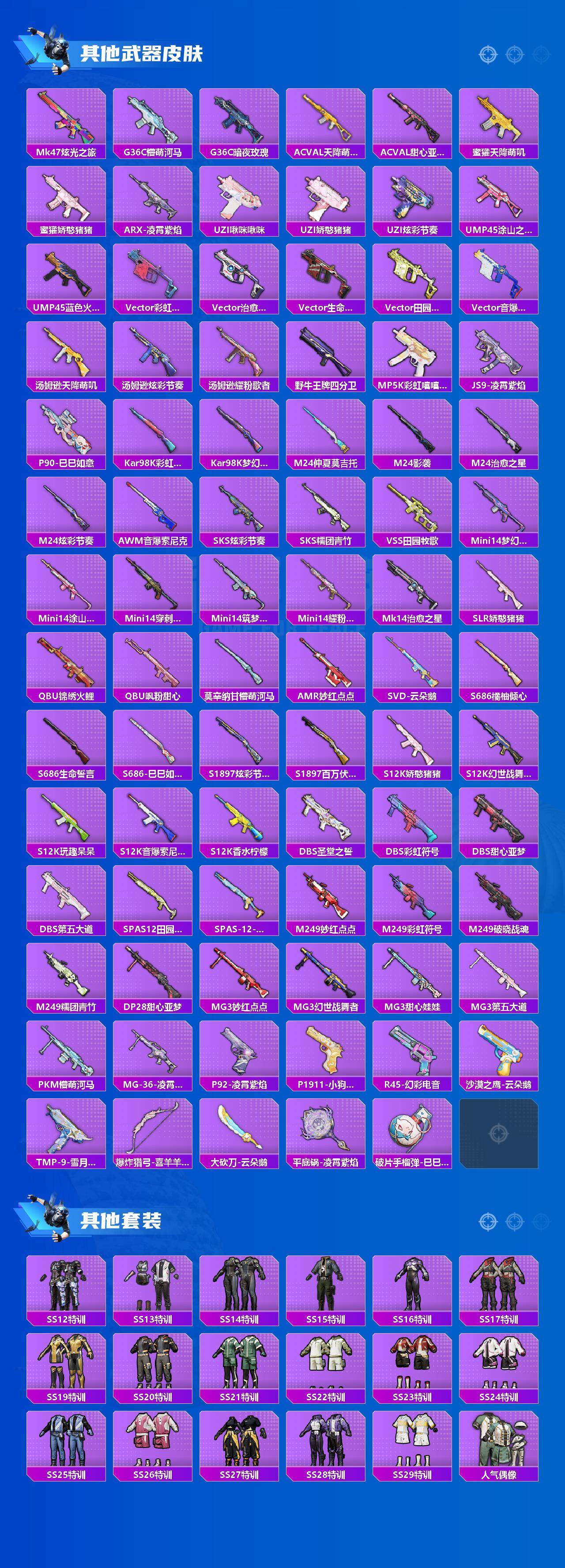 【稀有枪皮】:AKM-夜灯,AKM-彩虹符号,AKM-王牌投手,AKM-萌趣颜团子,AKM-龙的传人,M16A4-幻世战舞者,M16A4-甜心亚梦,SCAR-L-玉兔迎春,SCAR-L-红色方程式,SCAR-L-银碳小老虎,SCAR-L-冷漠罗丽,M416-糯团青竹,M416-绯红前夜,M416-蓝色火焰,GROZA-彩虹符号,GROZA-懵萌河马,GROZA-治愈之星,GROZA-田园牧歌,AUG-天降萌叽,AUG-耀粉歌者,QBZ-彩虹符号,QBZ-潮汐统领,QBZ-银碳小老虎,M762-天降萌叽,M762-奇异狩猎者,M762-牛气冲天,M762-第五大道,M762-云朵鹅,Mk47-妙红点点,Mk47-洛神天依,Mk47-炫光之旅,G36C-懵萌河马,G36C-暗夜玫瑰,AC-VAL-天降萌叽,AC-VAL-甜心亚梦,蜜獾-天降萌叽,蜜獾-娇憨