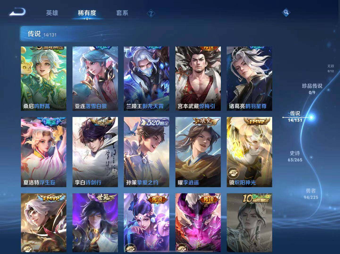 【传说皮肤】:桑启鸣野蒿,亚连落雪白狼,兰陵王影龙天霄,宫本武藏惊梅引,诸葛亮鹤羽星尊,夏洛特浮生妄,李白诗剑行,孙策挚爱之约,曜李逍遥 ,镜炽阳神光,曜云鹰飞将,李信一念神魔,貂蝉仲夏夜之梦,宫本武藏地狱之眼