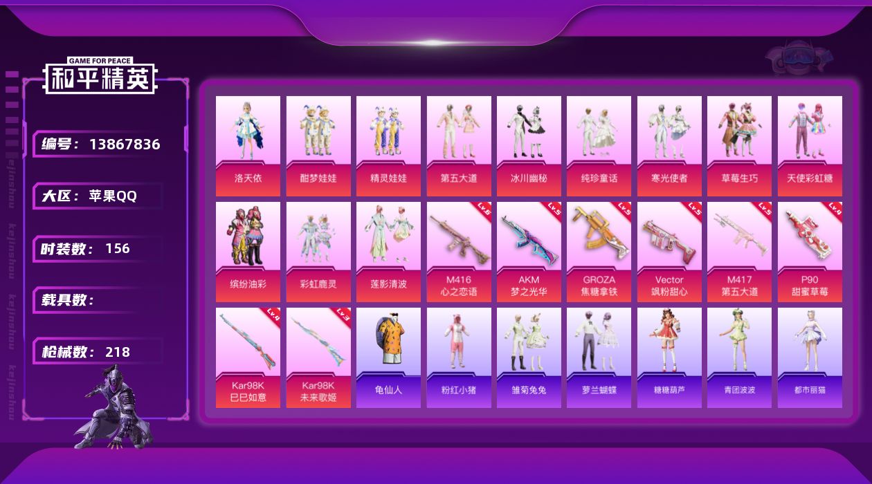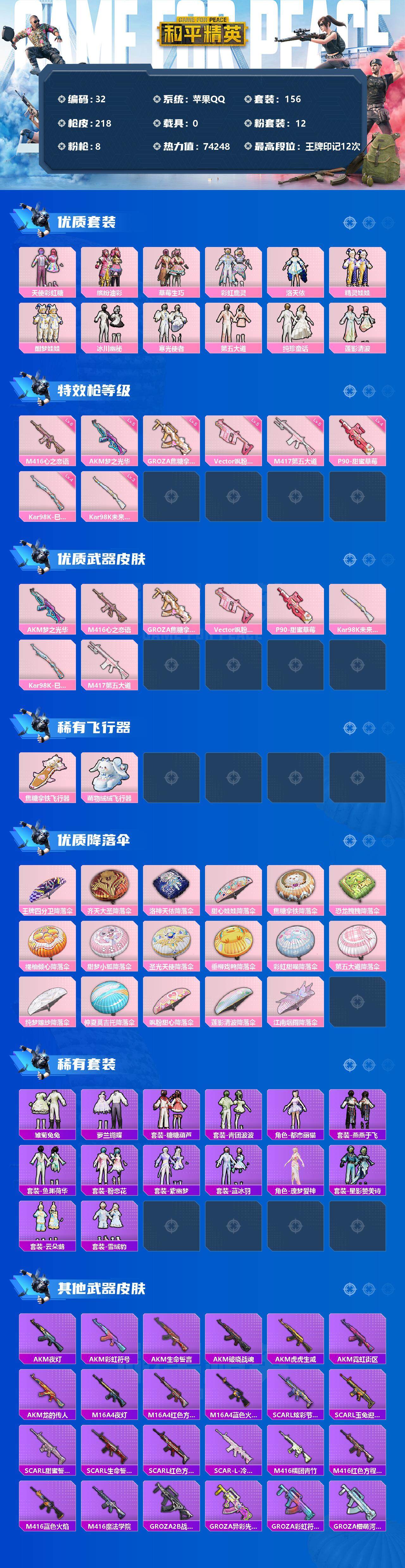 [13867836]苹果 手Q-12粉装-8特效枪-0载具-2粉色飞行器-74248热力值-12王牌印记-156套装-218枪皮 【热门品类】:粉装-缤纷油彩,套装-龟仙人,套装-粉红小猪 【粉色套装】:粉装-天使彩虹糖,粉装-缤纷油彩,粉装-草莓生巧,粉装-彩虹鹿灵,角色-洛天依,粉装-精灵娃娃,粉装-酣梦娃娃,粉装-冰川幽秘,粉装-寒光使者,粉装-第五大道,粉装-纯珍童话,粉装-莲影清波 【粉色枪皮等级】:AKM-梦之光华(五级),M416-心之恋语(六级),GROZA-焦糖拿铁(五级),Vector-飒粉甜心(五级),P90-甜蜜草莓(四级),Kar98K-未来歌姬(三级),Kar98K-巳巳如意(四级),M417-第五大道(五级) 【粉色枪皮】:AKM-梦之光华,M416-心之恋语,GROZA-焦糖拿铁,Vector-飒粉甜心,P90-甜蜜草莓,Kar98K-未来歌姬,Kar98K-巳巳如意,M417-第五大道 【粉色飞行器】:焦糖拿铁飞行器,萌物绒绒飞行器 【粉色降落伞】:王牌四分卫降落伞,齐天大圣降落伞,洛神天依降落伞,甜心娃娃降落伞,焦糖拿铁降落伞,恐龙拽拽降落伞,橘柚倾心降落伞,甜梦小狐降落伞,圣光天使降落伞,垂柳戏鸭降落伞,彩虹甜喵降落伞,第五大道降落伞,纯梦嫁纱降落伞,仲夏莫吉托降落伞,飒粉甜心降落伞,莲影清波降落伞,江南烟雨降落伞 【稀有套装】:套装-龟仙人,套装-雏菊兔兔,套装-萝兰蝴蝶,套装-糖糖葫芦,套装-青团波波,角色-都市丽猫,套装-燕燕于飞,套装-鱼渊荷华,套装-粉恋花,套装-紫幽梦,套装-蓝冰羽,角色-瑰梦爱神,套装-星影赞美诗,套装-云朵鹅,套装-雪绒豹 【稀有枪皮】:AKM-夜灯,AKM-彩虹符号,AKM-生命誓言,AKM-破晓战魂,AKM-虎虎生威,AKM-霓虹街区,AKM-龙的传人,M16A4-夜灯,M16A4-红色方程式,M16A4-蓝色火焰,SCAR-L-炫彩节奏,SCAR-L-玉兔迎春,SCAR-L-甜蜜誓约,SCAR-L-生命誓言,SCAR-L-红色方程式,SCAR-L-冷漠罗丽,M416-糯团青竹,M416-红色方程式,M416-蓝色火焰,M416-魔法学院,GROZA-2B战斗服款,GROZA-异彩先驱,GROZA-彩虹符号,GROZA-懵萌河马,GROZA-治愈之星,GROZA-田园牧歌,AUG-天降萌叽,AUG-耀粉歌者,A