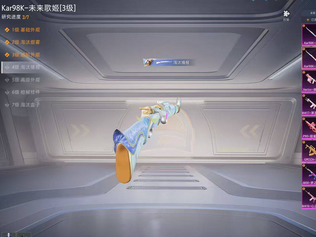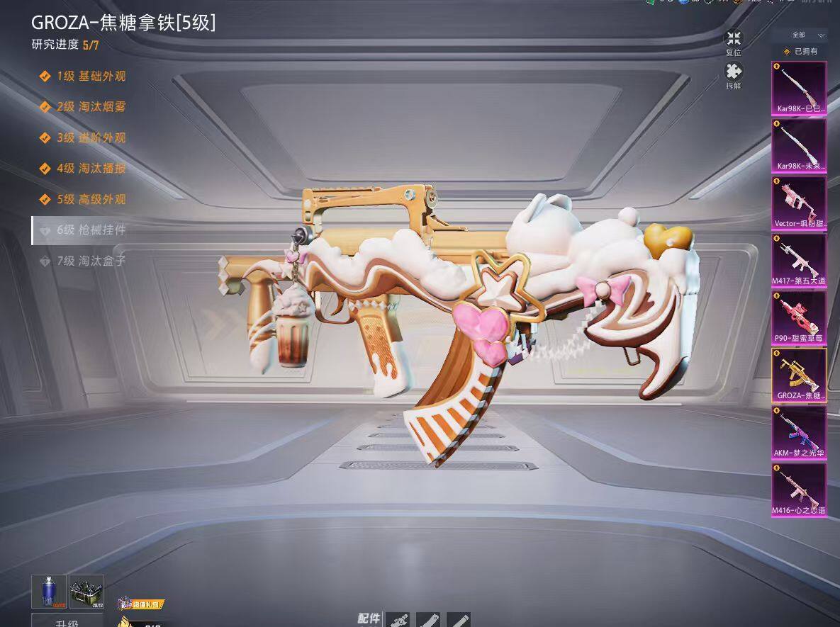 AKM-梦之光华,M416-心之恋语,GROZA-焦糖拿铁,Vector-飒粉甜心,P90-甜蜜草莓,Kar98K-未来歌姬,Kar98K-巳巳如意,M417-第五大道