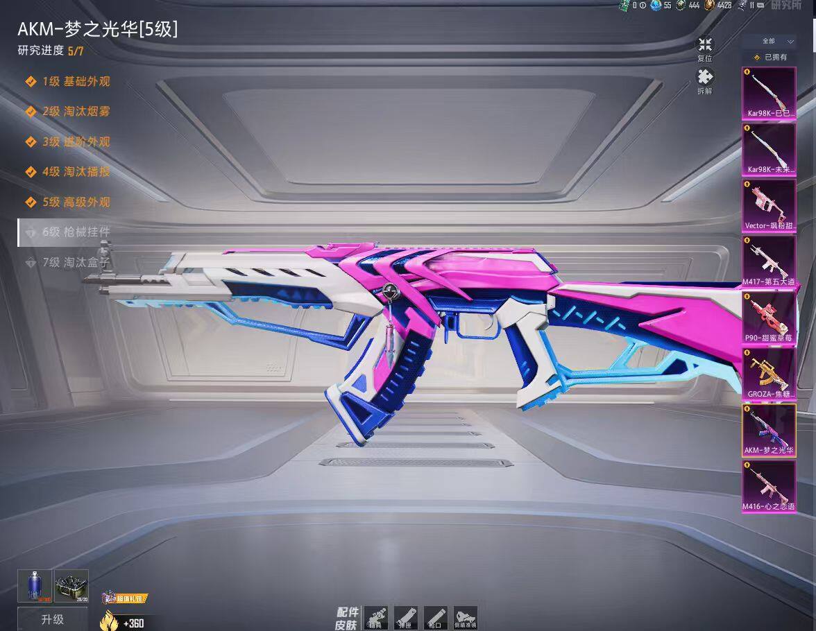 【粉色枪皮等级】:AKM-梦之光华(五级),M416-心之恋语(六级),GROZA-焦糖拿铁(五级),Vector-飒粉甜心(五级),P90-甜蜜草莓(四级),Kar98K-未来歌姬(三级),Kar98K-巳巳如意(四级),M417-第五大道(五级)