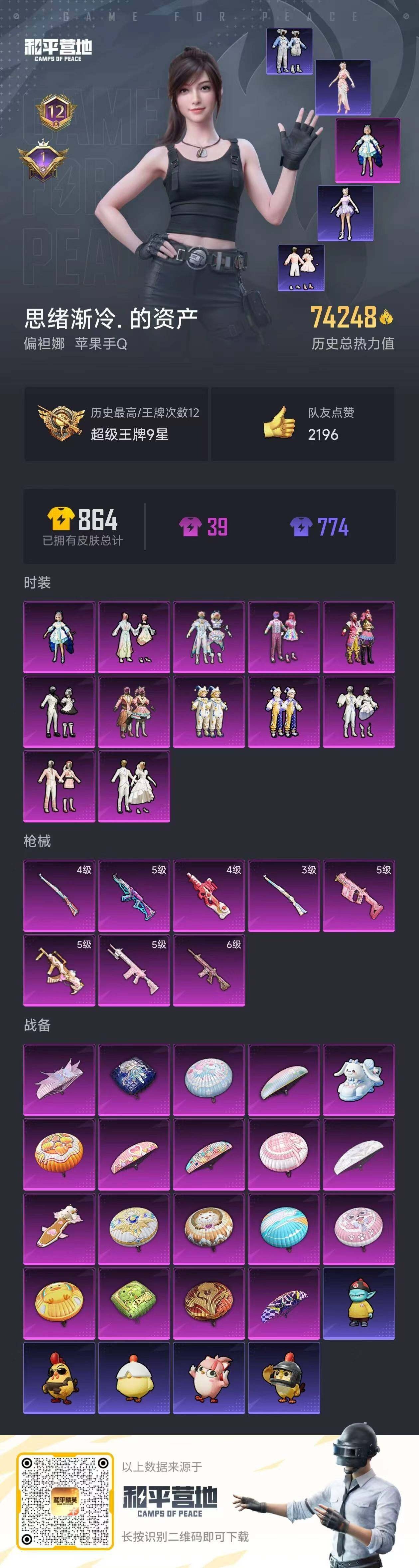 [13867836]苹果 手Q-12粉装-8特效枪-0载具-2粉色飞行器-74248热力值-12王牌印记-156套装-218枪皮