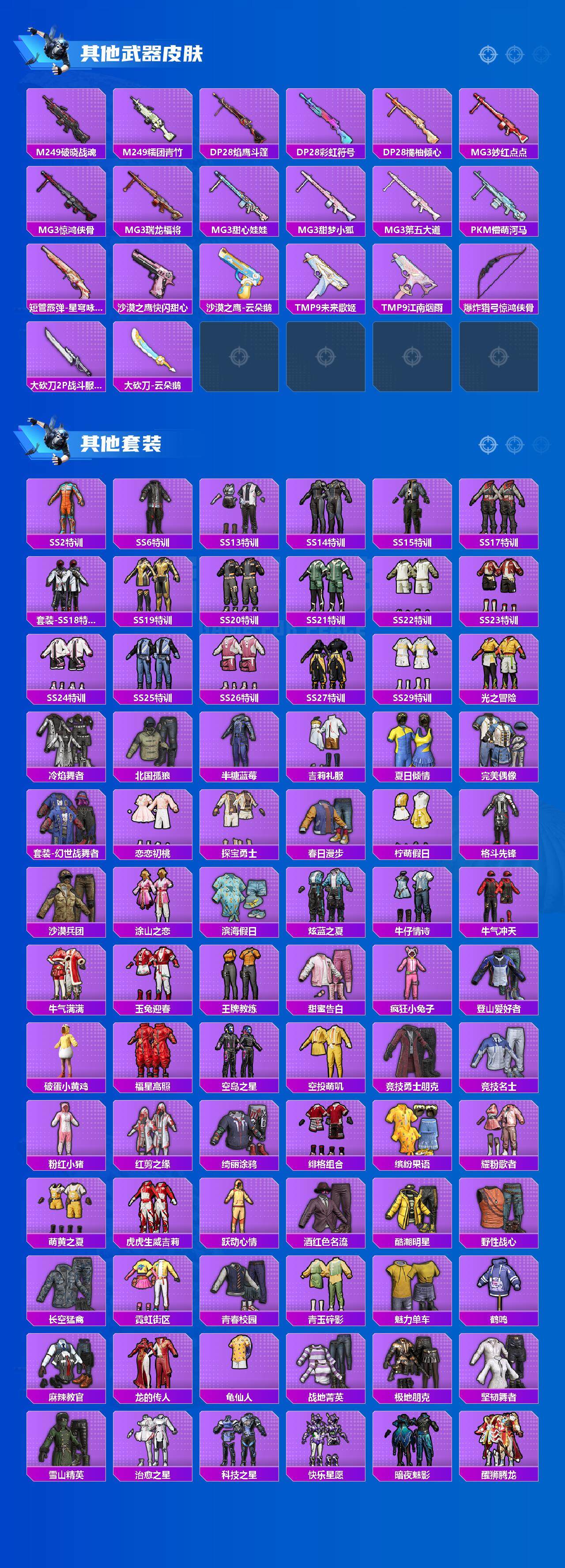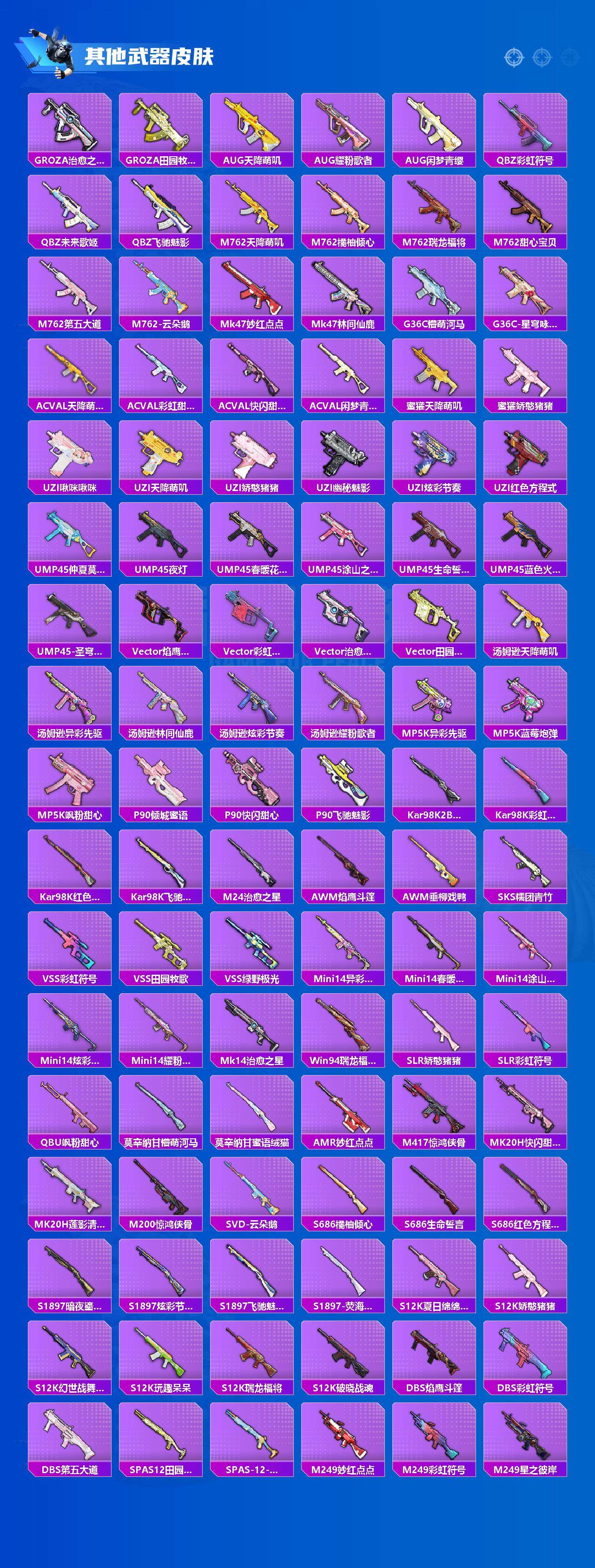 【稀有枪皮】:AKM-夜灯,AKM-彩虹符号,AKM-生命誓言,AKM-破晓战魂,AKM-虎虎生威,AKM-霓虹街区,AKM-龙的传人,M16A4-夜灯,M16A4-红色方程式,M16A4-蓝色火焰,SCAR-L-炫彩节奏,SCAR-L-玉兔迎春,SCAR-L-甜蜜誓约,SCAR-L-生命誓言,SCAR-L-红色方程式,SCAR-L-冷漠罗丽,M416-糯团青竹,M416-红色方程式,M416-蓝色火焰,M416-魔法学院,GROZA-2B战斗服款,GROZA-异彩先驱,GROZA-彩虹符号,GROZA-懵萌河马,GROZA-治愈之星,GROZA-田园牧歌,AUG-天降萌叽,AUG-耀粉歌者,A