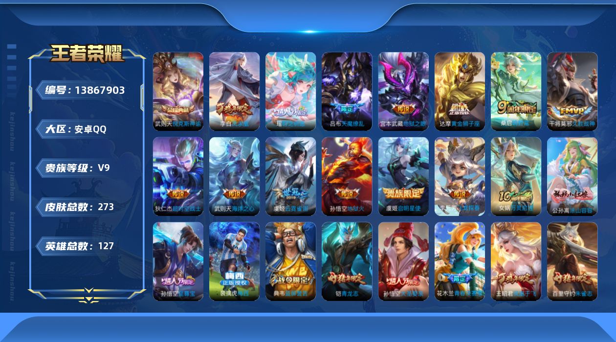 [13867903]安卓Q-V9-127英雄-273皮肤-1典藏-13传说-65史诗