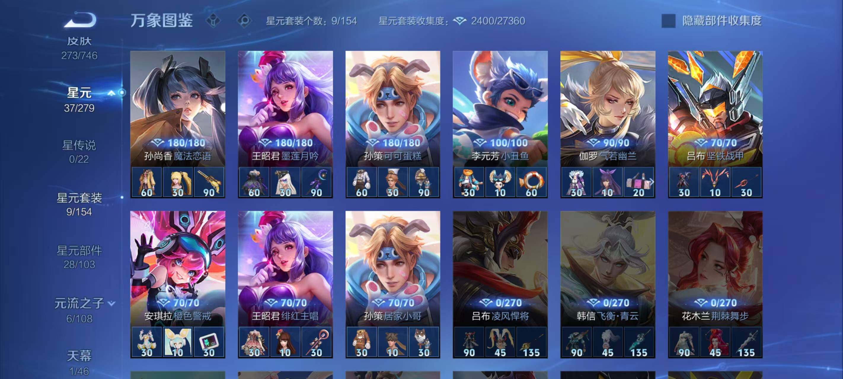 - [12738698]安卓Q-V9-最强王者段位-126英雄-289皮肤-4典藏-0珍品无双-1无双-0珍品传说-18传说-71史诗 【荣耀典藏】:武则天英雄,孙悟空全息碎影,武则天倪克斯神谕,夏侯惇无限飓风号,诸葛亮星域神启 【无双皮肤】:韩信群星魔术团 【传说皮肤】:典韦战鼓燎原,夏洛特浮生妄,百里守约碎云,孙策末日机甲,周瑜音你心动,小乔音你心动,铠绛天战甲,虞姬启明星使,李信一念神魔,干将莫邪久胜战神,达摩黄金狮子座,后羿黄金射手座,貂蝉仲夏夜之梦,孙尚香末日机甲,宫本武藏地狱之眼,孙悟空地狱火,武则天海洋之心,狄仁杰超时空战士 【限定皮肤】:姜子牙天穹之誓,狄仁杰阴阳师,赵云皇家上将,墨子神迹守卫,嬴政优雅恋人,阿轲迷踪丽影,钟无艳超时空战士,扁鹊奇幻香踪,夏侯惇朔风刀,甄姬落雪兰心,典韦岱宗,马可波罗暗影游猎,狄仁杰魔术师,狄仁杰万华元夜,达摩星际陆战队,达摩沙漠行僧,项羽海滩派对,老夫子醍醐杖,老夫子航海奇遇记,程咬金演武夺筹,刘邦夺宝奇兵,兰陵王金庭之子,孙悟空至尊宝,孙悟空大圣娶亲,孙悟空孙行者,后羿圣弓游侠,李元芳银河之约,李元芳云中旅人,虞姬启明星使,钟馗驱傩正仪,杨戬潮玩骑兵,女娲朔望之晖,干将莫邪真爱魔法,雅典娜单词大作战,鬼谷子原初探秘者,鬼谷子五谷丰年,苏烈千军破阵,百里玄策原初追逐者,百里守约朱雀志,弈星混沌棋,公孙离玉兔公主,沈梦溪星空之诺,沈梦溪大漠名商,明世隐疑决卦,裴擒虎李小龙,裴擒虎擒涛扼浪,米莱狄胡桃异想国,云中君纤云弄巧,猪八戒西部大镖客,猪八戒猪悟能,上官婉儿神器万象笔,嫦娥暖冬兔眠,蒙犽狂想玩偶喵,桑启海盐诗旅,夏洛特浮生妄,暃星界游侠,张良古海寻踪,高渐离燃音魔法,妲己灵卜魔法,鬼谷子天穹祈灯,鲁班七号蔬乡物语,李元芳蔬乡物语,刘邦剑破天穹,程咬金群星魔术团,韩信群星魔术团,镜青焰无极,项羽苍威无极,周瑜熔金海岸 【年限皮肤】:百里守约朱雀志,典韦岱宗 【赛季限定】:夏侯惇朔风刀,狄仁杰万华元夜,达摩沙漠行僧,老夫子醍醐杖,程咬金演武夺筹,兰陵王金庭之子,张良古海寻踪,李元芳云中旅人,钟馗驱傩正仪,鬼谷子原初探秘者,苏烈千军破阵,百里玄策原初追逐者,弈星混沌棋,沈梦溪大漠名商,明世隐疑决卦,裴擒虎擒涛扼浪,桑启海盐诗旅,鬼谷子天穹祈灯,刘邦剑破天穹,姜子牙天穹之誓 【战令限定】:墨子神迹守卫,阿轲迷踪丽影,钟无艳超时空战士,扁鹊奇幻香