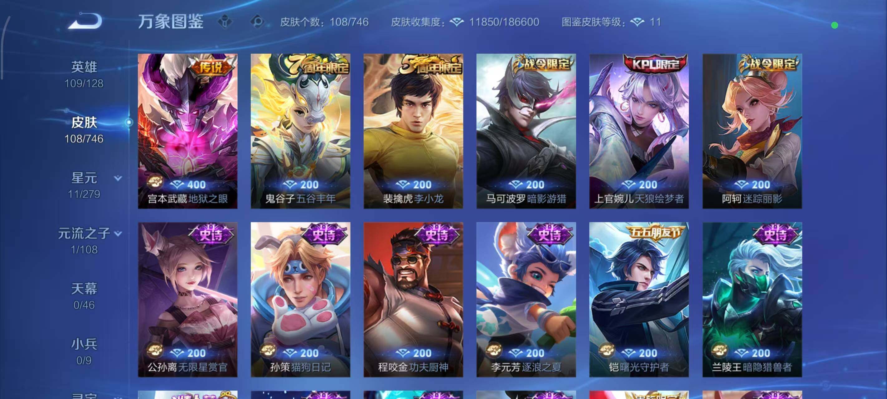 【史诗皮肤】:露娜紫霞仙子,阿轲暗夜猫娘,钟无艳王者之锤,赵云皇家上将,赵云未来纪元,貂蝉圣诞恋歌,孙尚香蔷薇恋人,孙尚香水果甜心,妲己魅力维加斯,曹操幽灵船长,李白千年之狐,孙悟空至尊宝,兰陵王暗隐猎兽者,铠曙光守护者,李元芳逐浪之夏,程咬金功夫厨神,孙策猫狗日记,狄仁杰鹰眼统帅,公孙离无限星赏官,阿轲迷踪丽影,上官婉儿天狼绘梦者,马可波罗暗影游猎,裴擒虎李小龙,鬼谷子五谷丰年