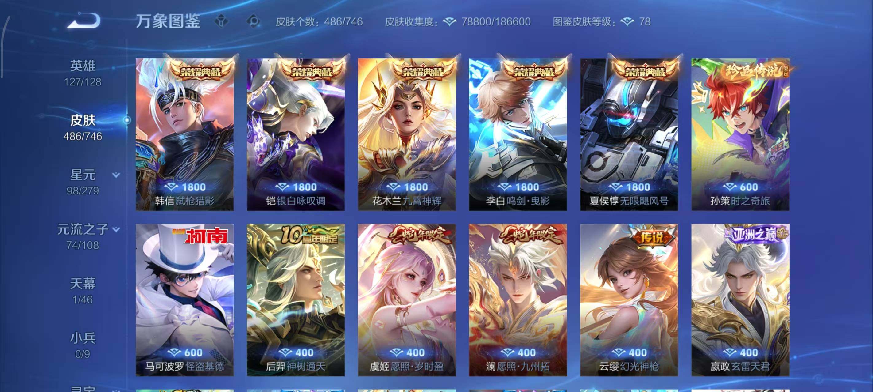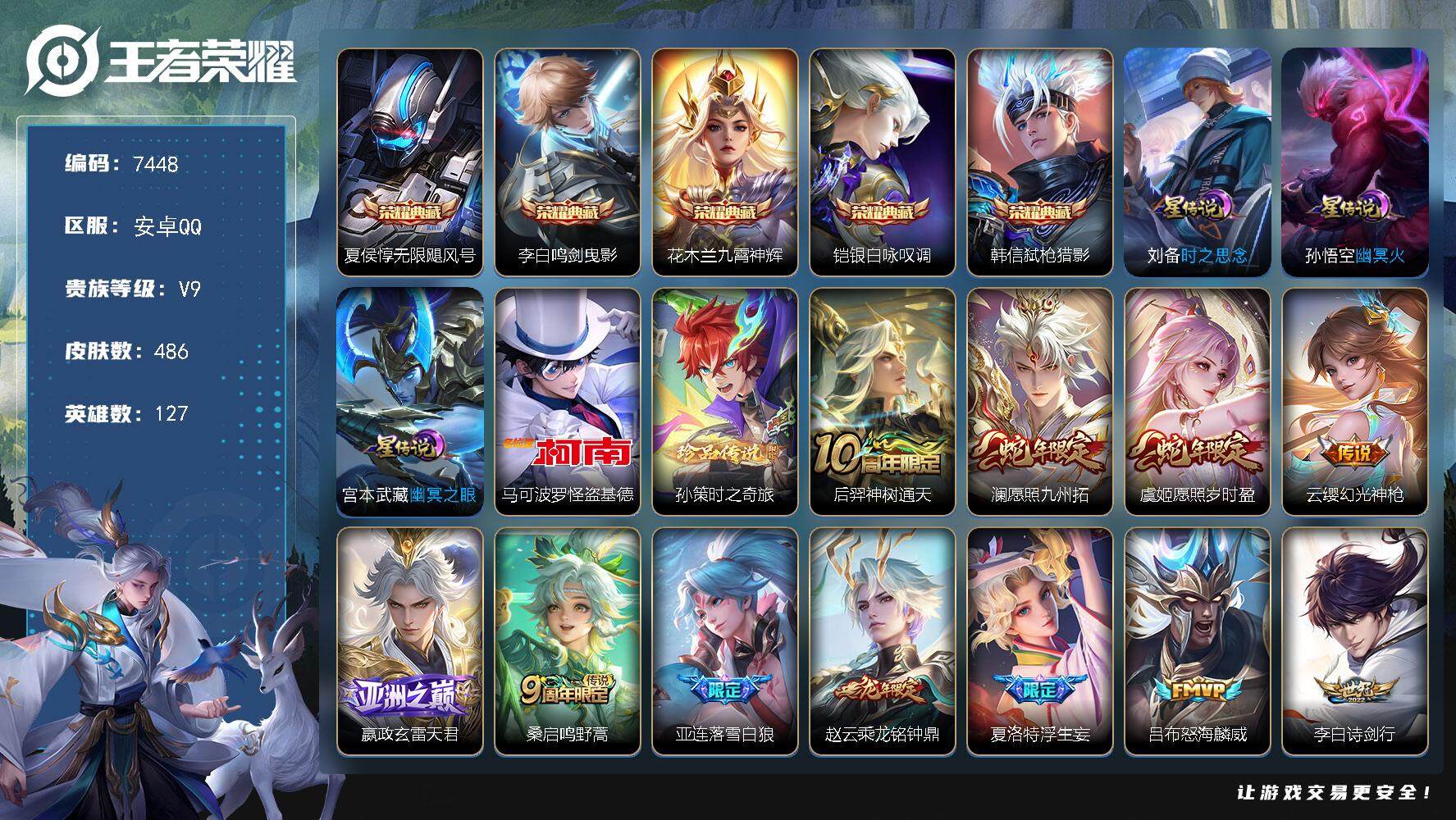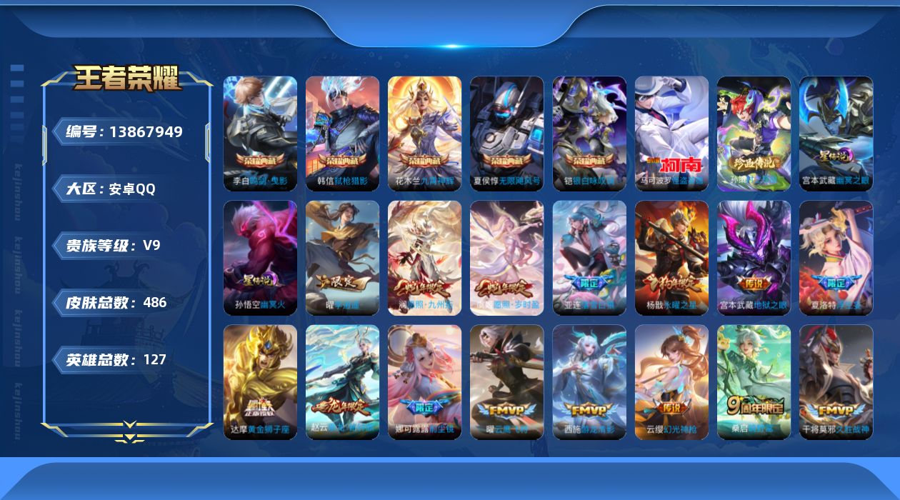 [13867949]安卓Q-V9-486皮肤-5典藏-2珍品传说-29传说-161史诗 【英雄全皮】:嬴政全皮,阿轲全皮,白起全皮,达摩全皮,孙权全皮,娜可露露全皮,刘备全皮,钟馗全皮,鬼谷子全皮,黄忠全皮,狂铁全皮,猪八戒全皮,亚连全皮,蒙恬全皮,夏洛特全皮,戈娅全皮,空空儿全皮,影全皮 【荣耀典藏】:夏侯惇无限飓风号,李白鸣剑曳影,花木兰九霄神辉,铠银白咏叹调,韩信弑枪猎影 【珍品传说】:马可波罗怪盗基德,孙策时之奇旅 【传说皮肤】:后羿神树通天,澜愿照九州拓,虞姬愿照岁时盈,云缨幻光神枪,嬴政玄雷天君,桑启鸣野蒿,亚连落雪白狼,赵云乘龙铭钟鼎,夏洛特浮生妄,吕布怒海麟威,李白诗剑行,娜可露露前尘镜,蔡文姬花朝如约,孙策末日机甲,赵云淬星耀世,西施游龙清影,曜李逍遥 ,李元芳飞鸢探春,铠绛天战甲,虞姬启明星使,孙悟空零号赤焰,曜云鹰飞将,刘备时之恋人,干将莫邪久胜战神,达摩黄金狮子座,花木兰冠军飞将,杨戬永曜之星,宫本武藏地狱之眼,孙悟空地狱火 【限定皮肤】:白起狰,暃埋骨钱,蒙犽顽岩魄,蔡文姬夏日便利店,大乔绒语心约,虞姬夏日便利店,姜子牙天穹之誓,杨戬破阵退雄兵,李白谪仙醉月,狄仁杰阴阳师,虞姬凯尔特女王,赵云皇家上将,赵云引擎之心,赵云百木心枪,墨子神迹守卫,妲己时之彼端,嬴政优雅恋人,嬴政白昼王子,孙尚香蔷薇恋人,鲁班七号狮舞东方,庄周高山流水,高渐离死亡摇滚,高渐离玩趣恶龙,阿轲迷踪丽影,钟无艳超时空战士,扁鹊奇幻香踪,白起夜都怪侠,芈月重明,芈月幻夜卜梦,吕布猎兽之王,吕布御风骁将,周瑜赤莲之焰,元歌云间偶戏,元歌无心,夏侯惇朔风刀,夏侯惇匿光决锋者,甄姬落雪兰心,曹操烛龙,典韦穷奇,典韦岱宗,马可波罗逐梦之星,马可波罗暗影游猎,马可波罗山海玄木吟,狄仁杰魔术师,狄仁杰万华元夜,达摩星际陆战队,达摩沙漠行僧,项羽海滩派对,老夫子醍醐杖,老夫子航海奇遇记,关羽冰锋战神,安琪拉魔法小厨娘,程咬金演武夺筹,韩信逐梦之影,韩信傲雪梅枪,王昭君午后时光,兰陵王驯魔猎人,兰陵王金庭之子,花木兰青春决赛季,花木兰默契交锋,娜可露露前尘镜,亚瑟潮玩骑士王,孙悟空至尊宝,孙悟空大圣娶亲,孙悟空零号赤焰,孙悟空孙行者,牛魔御旌,后羿圣弓游侠,刘备百相守梦,李元芳银河之约,李元芳云中旅人,虞姬启明星使,钟馗神迹守卫,钟馗驱傩正仪,杨玉环遇见飞天,杨戬永曜之星,杨戬潮玩骑兵,女娲朔望之晖,干
