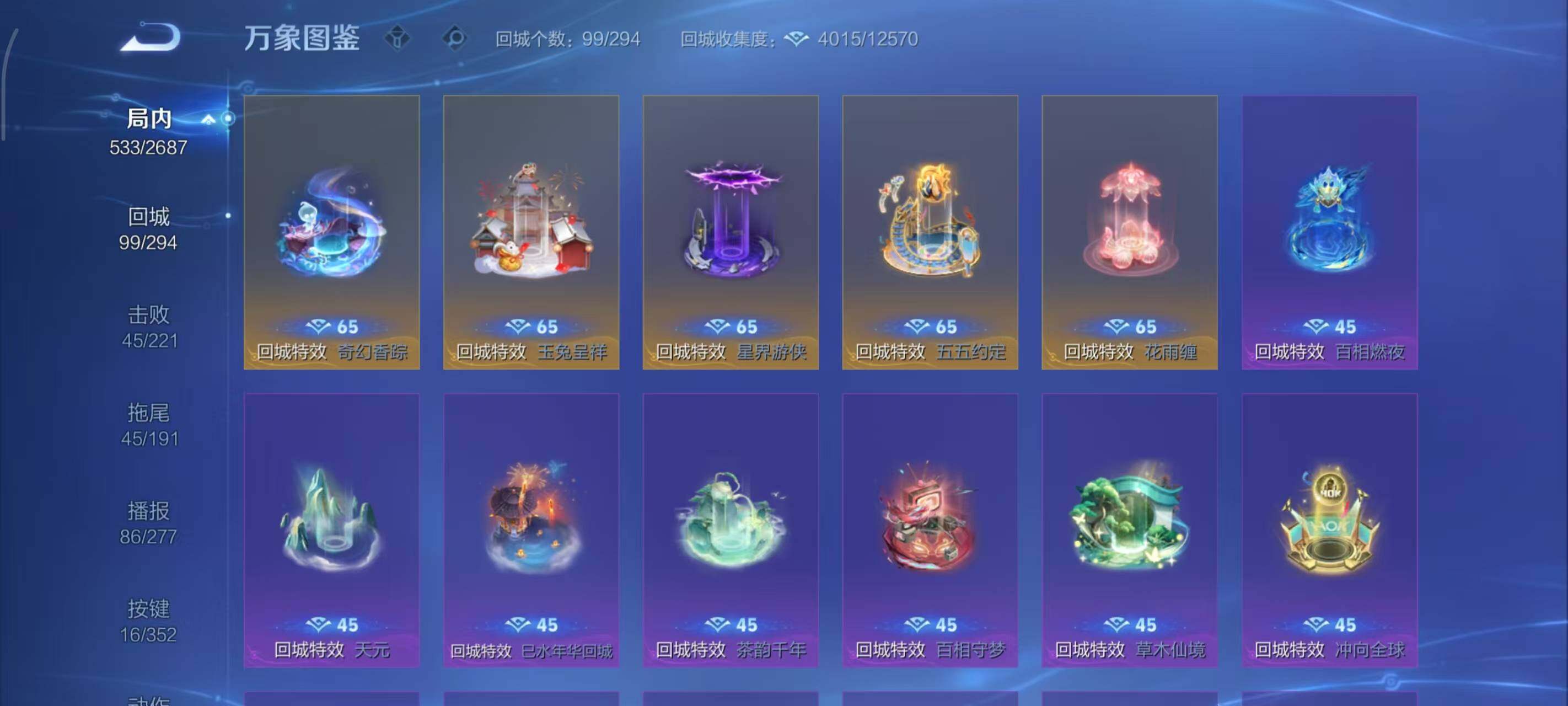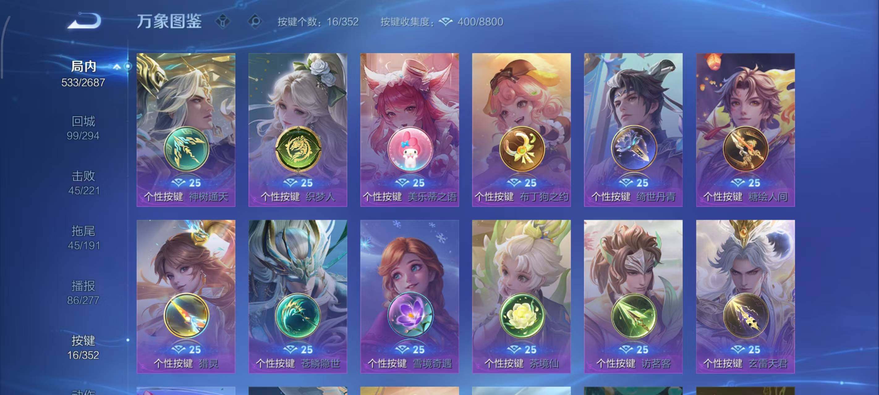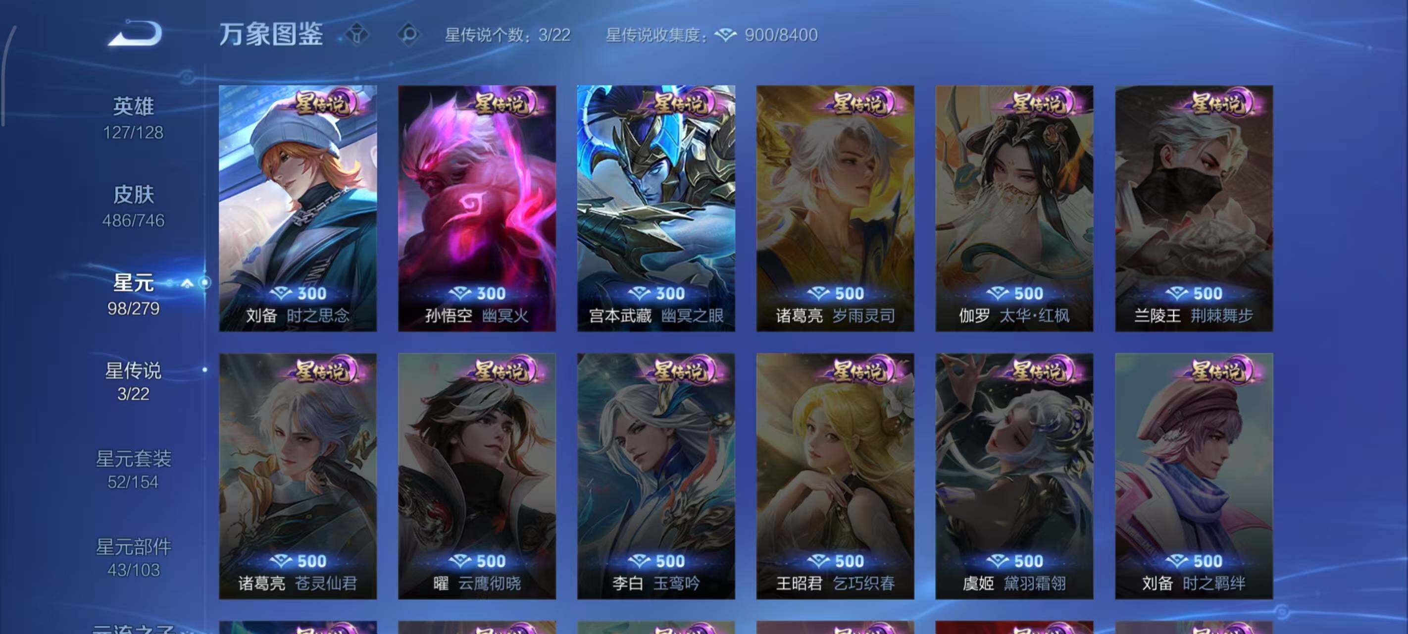 虞姬凯尔特女王,白起狰,太乙真人饕餮,曹操烛龙,芈月重明,典韦穷奇,狂铁御狮,米莱狄御霄,牛魔御旌,盾山御銮,夏侯惇朔风刀,明世隐疑决卦,老夫子醍醐杖,鬼谷子原初探秘者,狄仁杰万华元夜,程咬金演武夺筹,钟馗驱傩正仪,苏烈千军破阵,吕布猎兽之王,嬴政白昼王子,女娲朔望之晖,钟馗神迹守卫,鲁班七号狮舞东方,沈梦溪星空之诺,李元芳银河之约,马可波罗暗影游猎,蒙犽狂想玩偶喵,元歌云间偶戏,弈星混沌棋,达摩沙漠行僧,兰陵王金庭之子,沈梦溪大漠名商,李元芳云中旅人,桑启海盐诗旅,裴擒虎擒涛扼浪,鲁班大师探海日志,张良古海寻踪,项羽苍威无极,镜青焰无极
