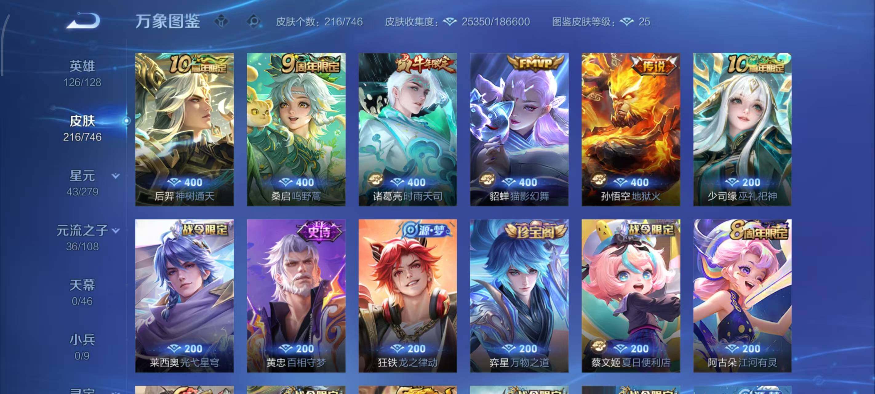 【限定皮肤】:白起狰,蔡文姬夏日便利店,姜子牙天穹之誓,狄仁杰阴阳师,赵云皇家上将,孙尚香蔷薇恋人,鲁班七号狮舞东方,庄周高山流水,阿轲迷踪丽影,钟无艳王者之锤,芈月重明,周瑜赤莲之焰,元歌云间偶戏,夏侯惇朔风刀,曹操烛龙,典韦穷奇,典韦蓝屏警告,马可波罗暗影游猎,狄仁杰魔术师,狄仁杰万华元夜,达摩沙漠行僧,项羽海滩派对,老夫子醍醐杖,程咬金演武夺筹,刘邦夺宝奇兵,兰陵王驯魔猎人,兰陵王金庭之子,亚瑟潮玩骑士王,孙悟空至尊宝,孙悟空大圣娶亲,牛魔御旌,李元芳云中旅人,钟馗神迹守卫,钟馗驱傩正仪,杨玉环遇见飞天,女娲朔望之晖,蔡文姬繁星吟游,太乙真人饕餮,鬼谷子原初探秘者,诸葛亮时雨天司,弈星混沌棋,沈梦溪大漠名商,明世隐疑决卦,裴擒虎李小龙,裴擒虎擒涛扼浪,狂铁御狮,米莱狄御霄,盾山御銮,猪八戒西部大镖客,上官婉儿梁祝,鲁班大师探海日志,阿古朵江河有灵,张良古海寻踪,鬼谷子天穹祈灯,刘邦剑破天穹