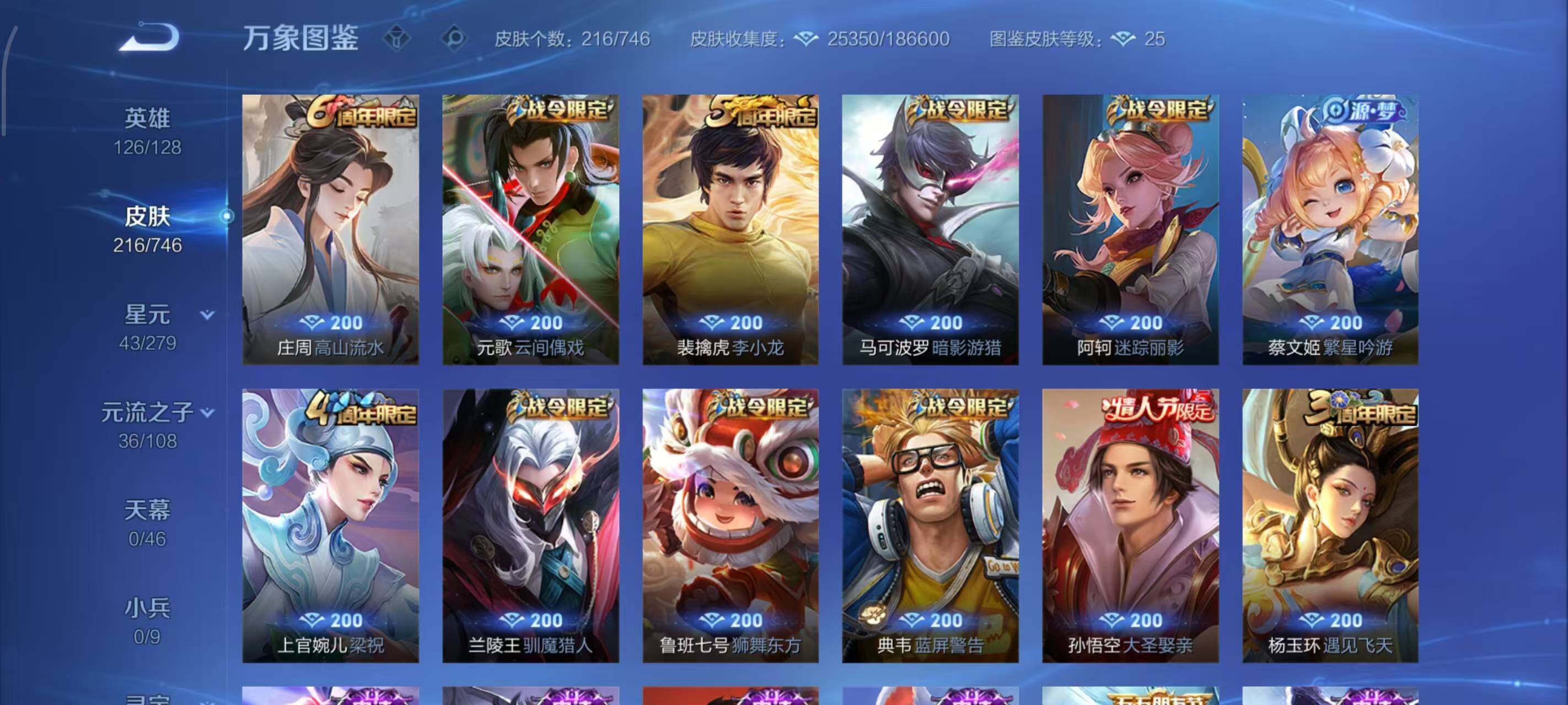- [10482804]V9 6典藏 20传说 124英雄 428皮肤 可修改实名 荣耀水晶:最初的交响(伽罗典藏),鸣剑·曳影,弑枪猎影(韩信典藏),赤影疾锋,全息碎影(猴子典藏),无限飓风号(高达) 传说皮:幻光神枪,黄金射手座,地狱火,一念神魔,久胜战神,猫影幻舞,云鹰飞将(小将军),炽阳神光,胖达荣荣,时之恋人-刘备(电焊工),绛天战甲(鸡嘴战神),电玩·雷克斯,天秀幻梦 珍宝阁皮:万物之道,优雅恋人,玩趣恶龙 限定皮:愿照·九州拓(澜年限),鸣野蒿,至尊宝,傲雪梅枪,星穹之声,绯月行,神威(电光马子),飞衡(韩信年限),山海·碧波行(瑶年限),遇见飞天,高山流水,无限倾心-虞姬,齐天大圣,匿光决锋者,降魔,五谷丰年,青龙志(铠年限),游园惊梦,梁祝,御风骁将(吕布年限),天狼溯光者,天狼征服者,李小龙,逐梦之影,玄武志(苏烈年限),朱雀志(守约年限),默契交锋-花木兰,孙行者,大圣娶亲,引擎之心,冰霜恋舞曲,云端筑梦师,蜜橘之夏,匿光追影者,枫霜尽,匿光启智者,时之奇旅-妲己,梦圆繁星,山海·玄木吟(马可年限) 史诗皮:石田雨龙,器灵·浮梦炉,百相守梦-百里守约,星界战将,茶境仙,化蝶舞,灵蛊蚀心,龙之律动,蔬乡物语(鲁班七号),紫霞仙子,苍穹之光,电玩小子(小书包),白龙吟,黄金分割率,特工魅影,千年之狐,永昼,青蛇,匿光破解者,电玩·爆裂旋风,冰冠公主,江河有灵,百解令(蒙犽),高渐离燃音魔法,蒙恬荣光圣徽,偶像歌手,晚萤,龙骑士(小龙虾),无限星赏官,魅语,暗夜猫娘,白蛇,末日机甲-吕布,猫狗日记-孙策,猫狗日记-大乔,时之恋人-孙尚香,乱世虎臣,节奏热浪,修罗,女仆咖啡,摇滚巨星,水果甜心,绅士熊喵,天才门将,星夜王子,心灵骇客,时之奇旅-安琪拉,功夫厨神,德古拉伯爵,暗隐猎兽者,幽灵船长,鬼剑武藏,暗渊魔法,心灵战警,乐园奇幻夜,天秀·启明,舞动绿茵,地狱岩魂,诗语江南,纤云弄巧,繁星吟游(呼啦呼啦),拒霜思,缤纷独角兽,乘风破浪,逐浪之夏,龙鼓争鸣,月团寄思,水晶猎龙者,曙光守护者,热力回旋,唤灵魅影,箭羽风息,金属风暴,圣诞狂欢,圣诞恋歌,鹰眼统帅,暗夜贵公子,魅力维加斯,黎明之约,雪上飞焰,赏金猎手,奇遇舞章,天秀幻梦,滕王阁序,顽趣-阿古朵,无心,未来纪元-赵云