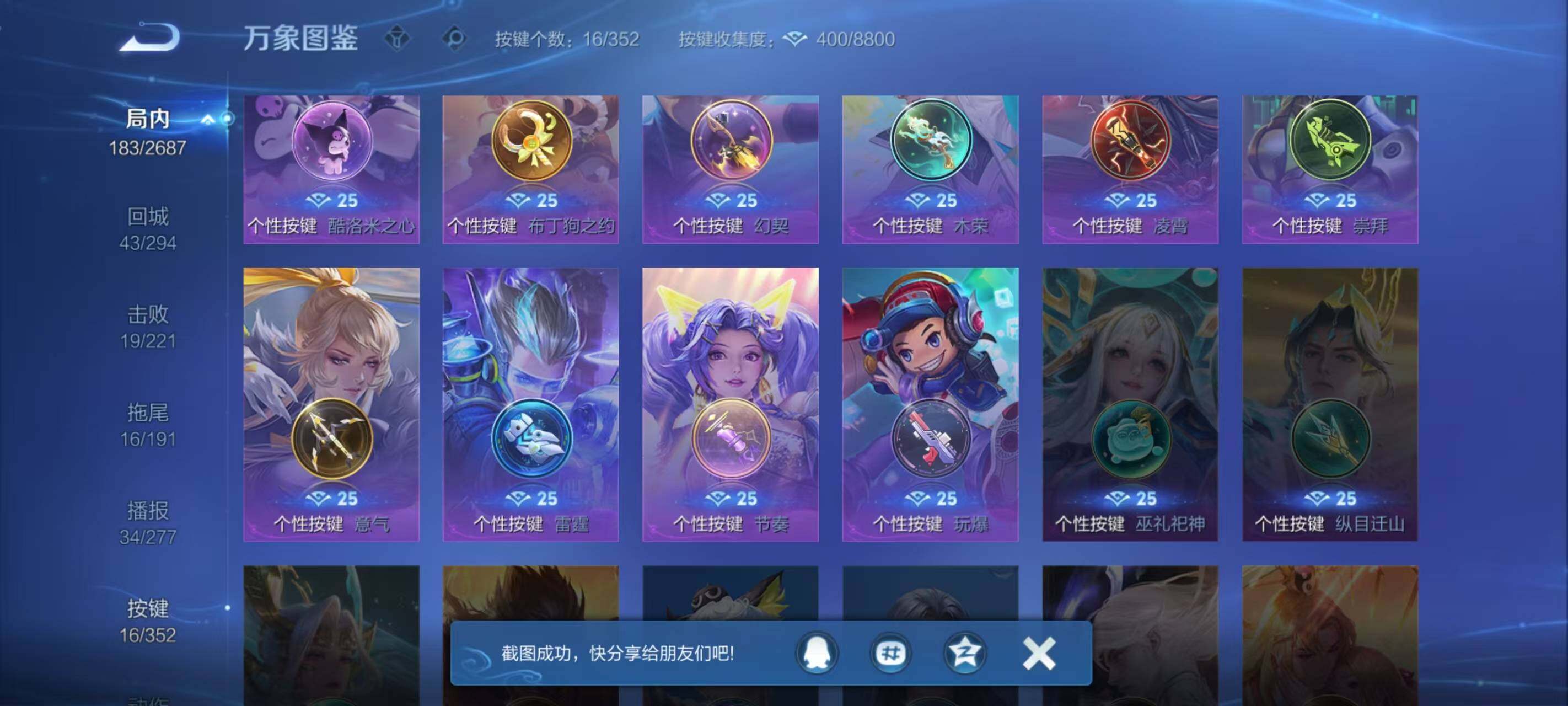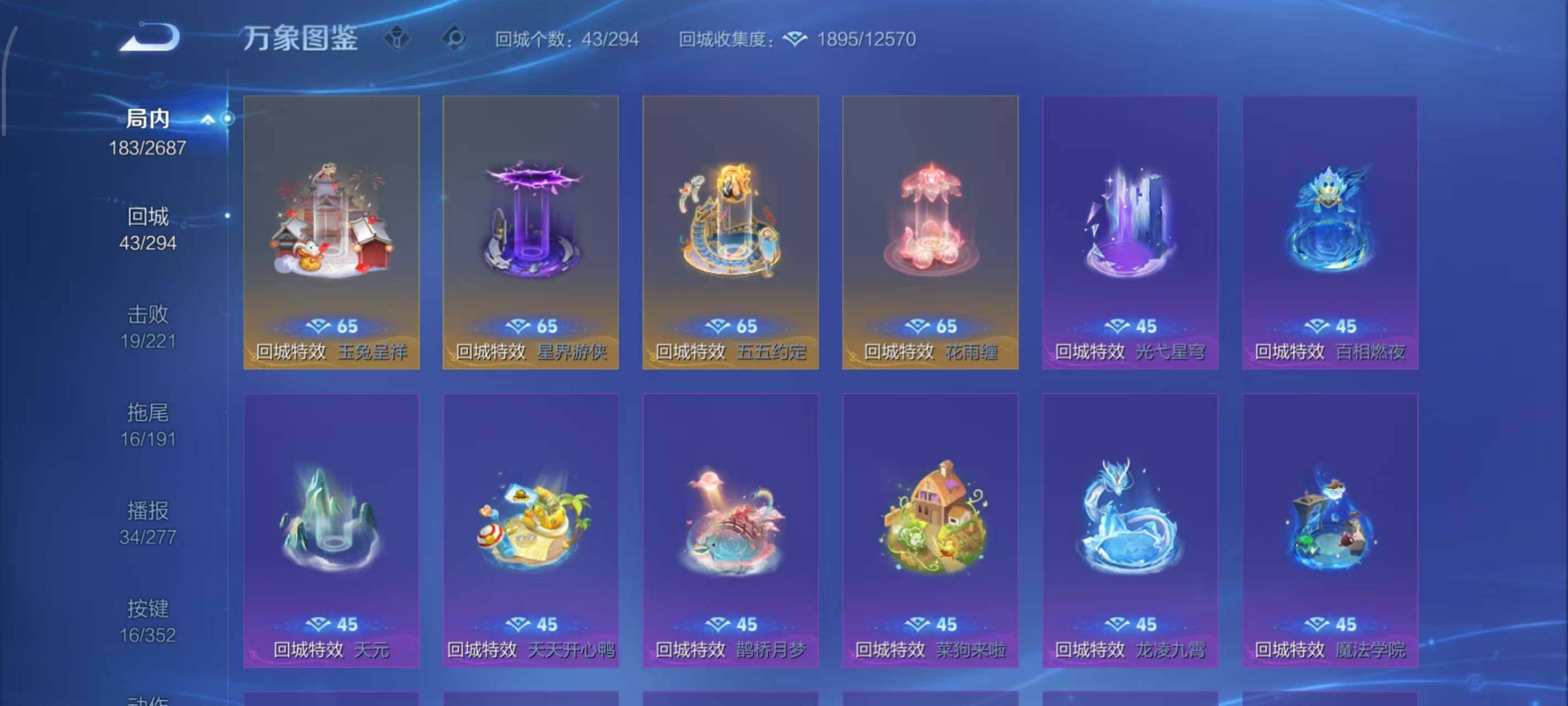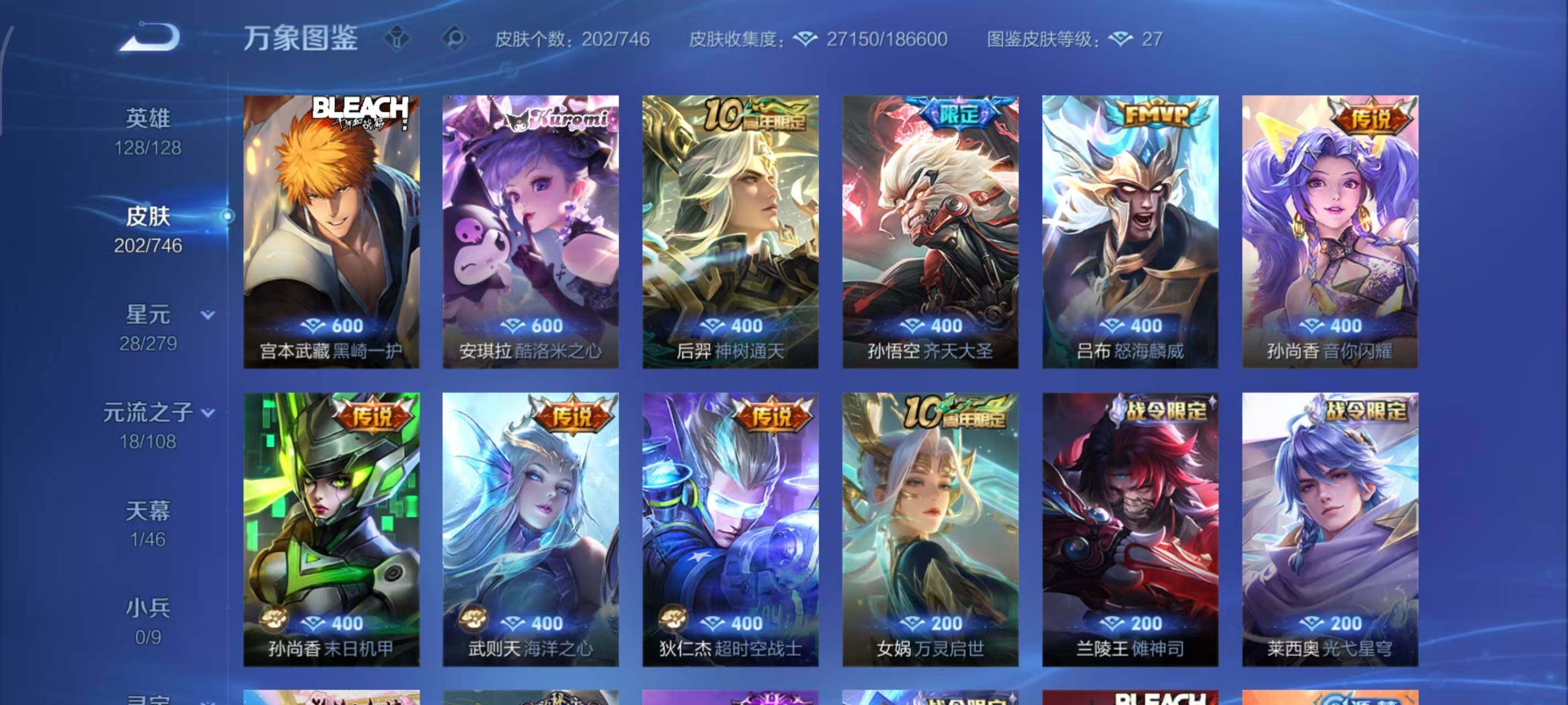 【史诗皮肤】:鲁班七号电玩小子,项羽苍穹之光,阿轲暗夜猫娘,赵云皇家上将,甄姬冰雪圆舞曲,王昭君偶像歌手,狄仁杰魔术师,廉颇地狱岩魂,宫本武藏鬼剑武藏,孙尚香水果甜心,嬴政优雅恋人,嬴政摇滚巨星,妲己魅力维加斯,吕布圣诞狂欢,曹操幽灵船长,李白千年之狐,花木兰水晶猎龙者,刘邦德古拉伯爵,夏侯惇乘