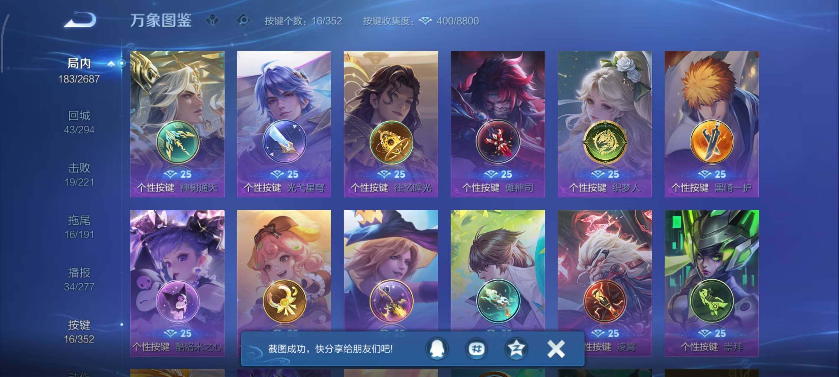 娜可露露晚萤,伽罗箭羽风息,不知火舞魅语,大乔猫狗日记,诸葛亮黄金分割率,王昭君偶像歌手,项羽苍穹之光,孙尚香时之恋人,阿轲暗夜猫娘,雅典娜冰冠公主,鲁班七号电玩小子,嬴政摇滚巨星,安琪拉时之奇旅,刘邦德古拉伯爵,兰陵王暗隐猎兽者,曹操幽灵船长,宫本武藏鬼剑武藏,亚瑟心灵战警,钟馗乐园奇幻夜,廉颇地狱岩魂,夏侯惇乘风破浪,花木兰水晶猎龙者,铠曙光守护者,吕布圣诞狂欢,百里守约特工魅影,李白千年之狐,高渐离燃音魔法,伽罗琥珀纪元