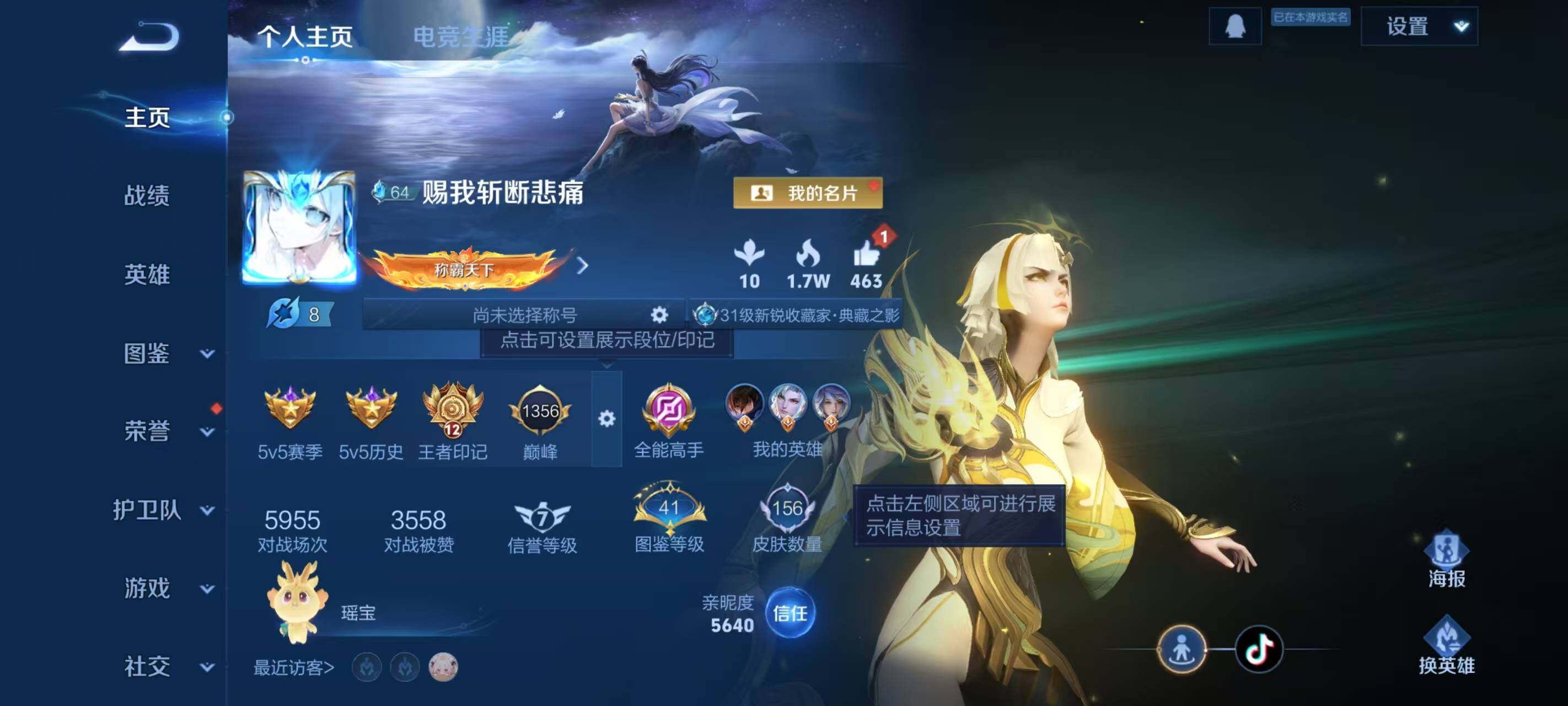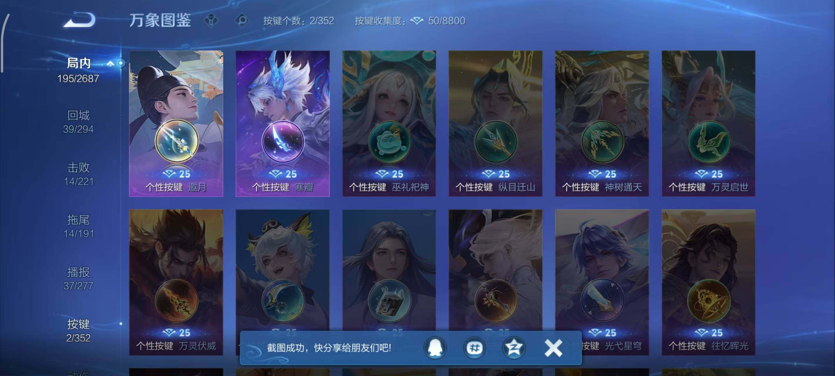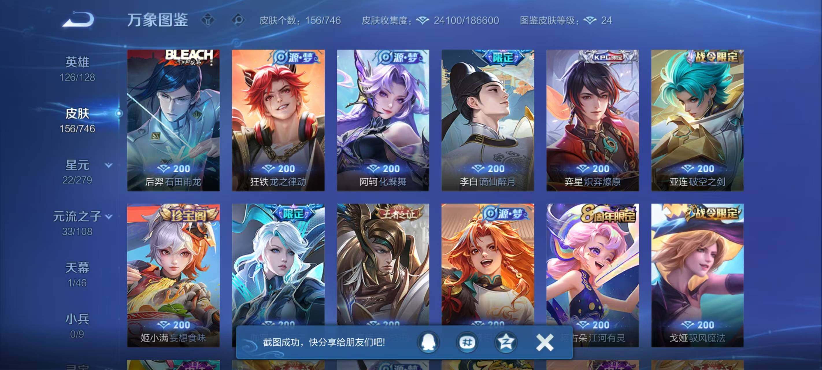 - PX_2017593-实名: 可修改 贵族等级: V8 英雄数: 122 皮肤数: 253 珍品传说: 器灵·落星盏 传说皮: 猫影幻舞,久胜战神,炽阳神光,一念神魔,李逍遥,时之恋人-刘备,淬星耀世,末日机甲-孙策,挚爱之约,无双飞将,乘龙·问璇玑,幻光神枪 限定皮: 李小龙,祈雪灵祝,时雨天司,天狼溯光者,神威,乒乒小将,天狼征服者,天狼运算者,天狼绘梦者,白虎志,如梦令-后羿,大圣娶亲,孙行