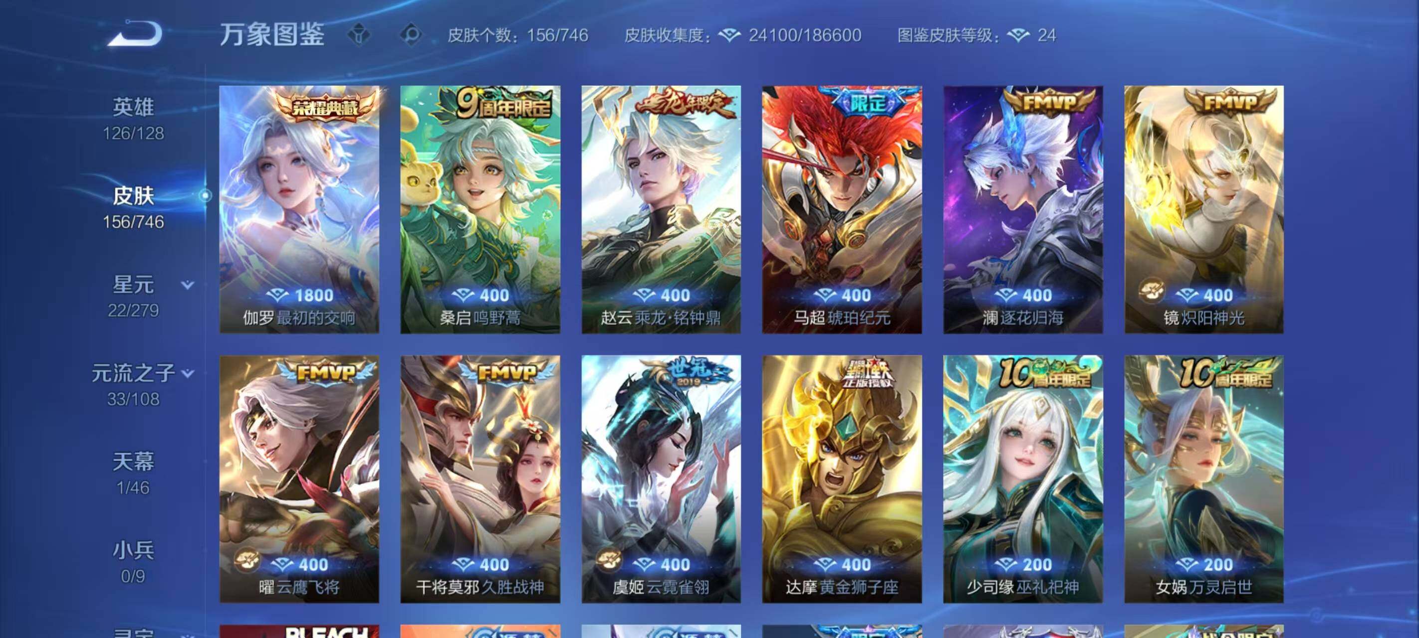 【限定皮肤】:李白谪仙醉月,狄仁杰阴阳师,赵云皇家上将,孙尚香蔷薇恋人,庄周高山流水,元歌无心,狄仁杰魔术师,达摩沙漠行僧,项羽海滩派对,兰陵王金庭之子,花木兰青春决赛季,李元芳云中旅人,雅典娜黎明之约,鬼谷子五谷丰年,苏烈千军破阵,梦奇顽趣,沈梦溪大漠名商,裴擒虎擒涛扼浪,云中君纤云弄巧,上官婉儿梁祝,嫦娥拒霜思,西施玲珑珍味,鲁班大师探海日志,镜匿光追影者,桑启海盐诗旅,戈娅驭风魔法,阿古朵江河有灵,张良古海寻踪,蒙犽百解令,蒙恬荣光圣徽,鬼谷子天穹祈灯,伽罗琥珀纪元,马超琥珀纪元,姬小满妄想食味,赵云乘龙铭钟鼎,沈梦溪龙舞盛年,刘邦剑破天穹,程咬金群星魔术团