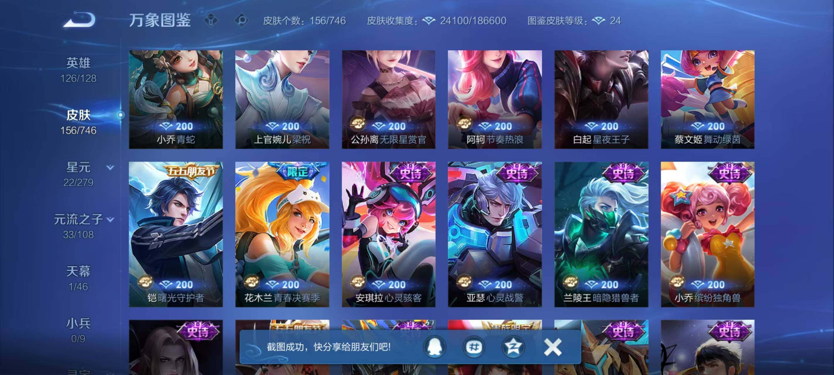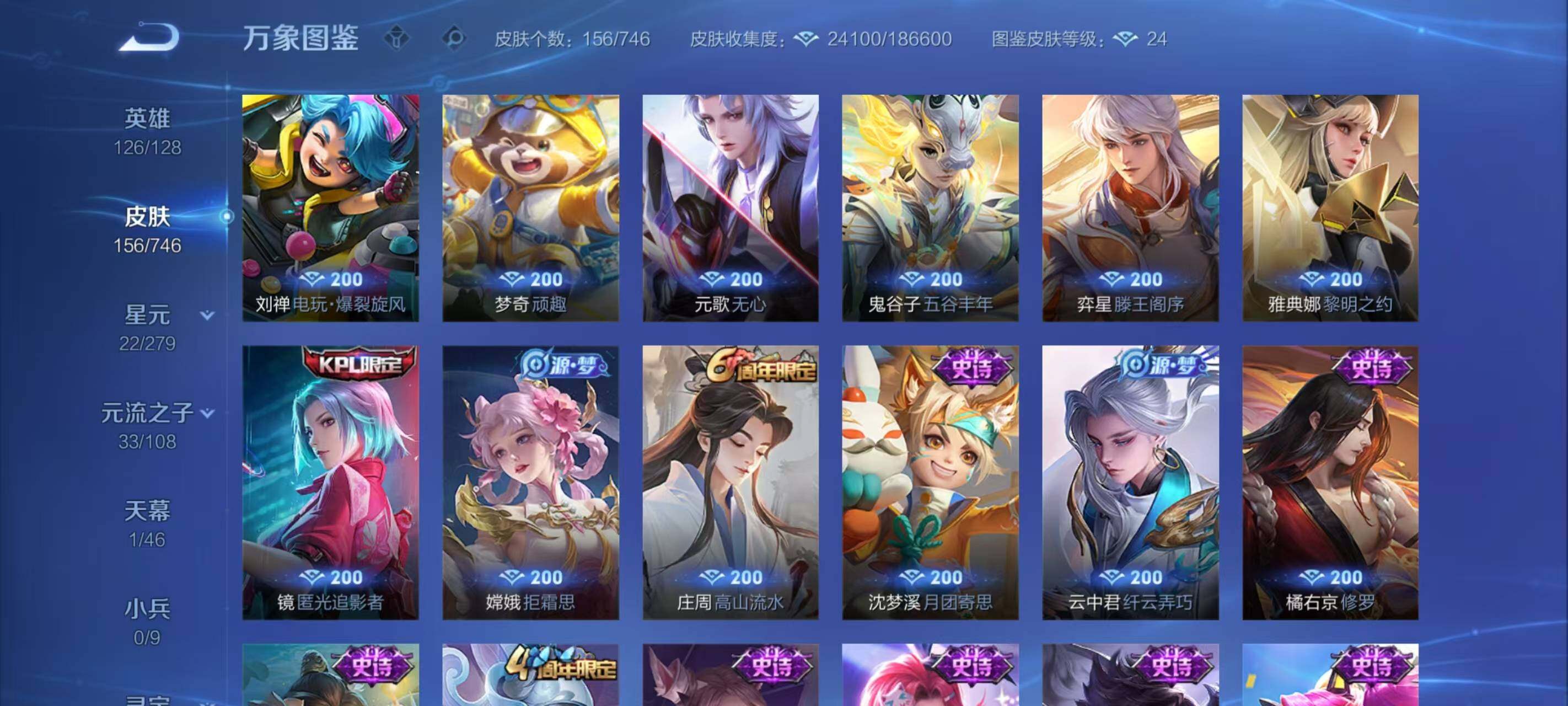 【史诗皮肤】:露娜紫霞仙子,赵云皇家上将,甄姬冰雪圆舞曲,狄仁杰魔术师,宫本武藏鬼剑武藏,孙尚香蔷薇恋人,孙尚香水果甜心,嬴政摇滚巨星,墨子金属风暴,吕布圣诞狂欢,刘禅绅士熊喵,吕布末日机甲,花木兰水晶猎龙者,刘邦德古拉伯爵,小乔缤纷独角兽,兰陵王暗隐猎兽者,亚瑟心灵战警,安琪拉心灵骇客,花木兰青春决赛季,铠曙光守护者,蔡文姬舞动绿茵,白起星夜王子,阿轲节奏热浪,狄仁杰鹰眼统帅,公孙离无限星赏官,上官婉儿梁祝,小乔青蛇,橘右京修罗,云中君纤云弄巧,沈梦溪月团寄思,庄周高山流水,嫦娥拒霜思,镜匿光追影者,雅典娜黎明之约,弈星滕王阁序,鬼谷子五谷丰年,元歌无心,梦奇顽趣,刘禅电玩爆裂旋风,戈娅驭风魔法,阿古朵江河有灵,蒙犽百解令,蒙恬荣光圣徽,伽罗琥珀纪元,姬小满妄想食味,亚连破空之剑,弈星炽弈燎原,李白谪仙醉月,阿轲化蝶舞,狂铁龙之律动,后羿石田雨龙,女娲万灵启世,少司缘巫礼祀神