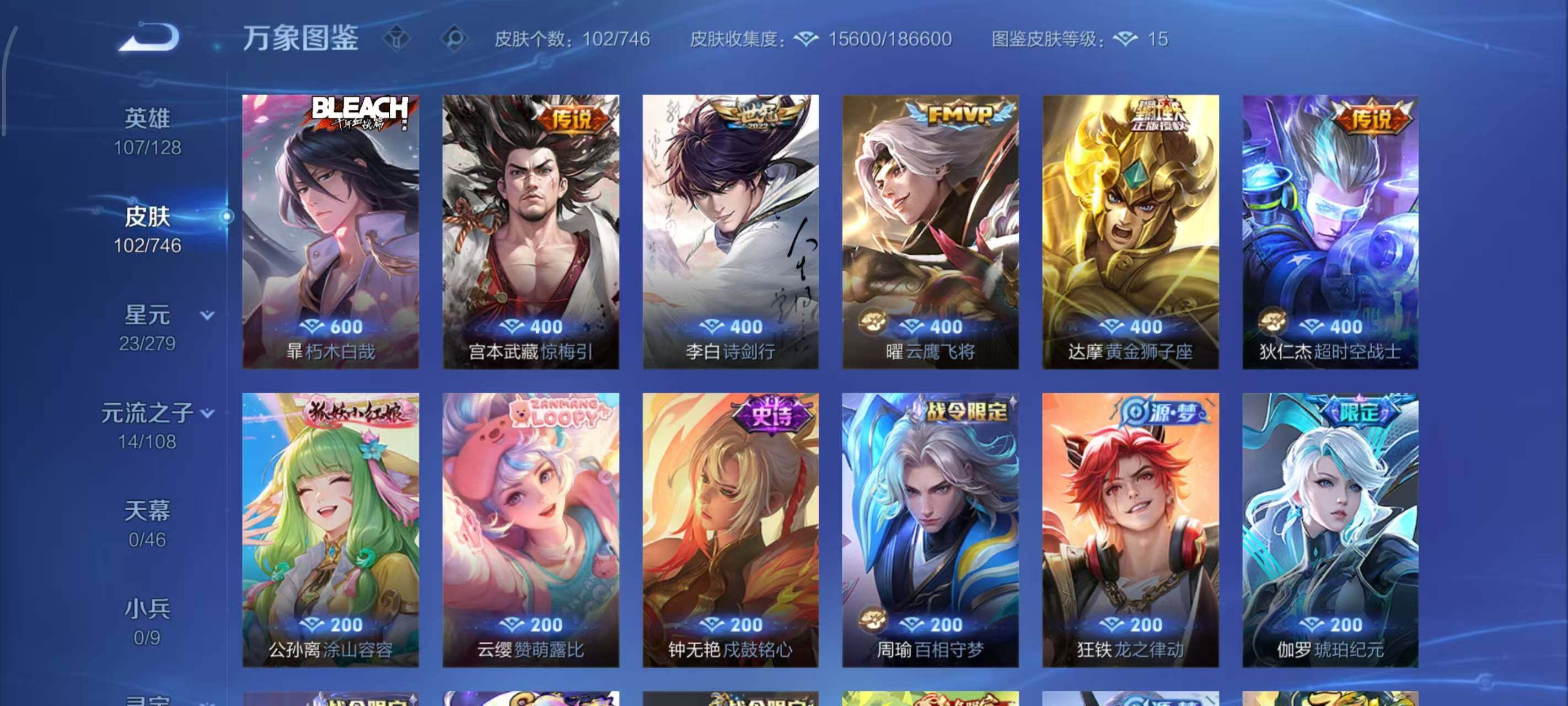 [13868026]安卓Q-V6-102皮肤-1珍品传说-5传说-41史诗 【英雄全皮】:空空儿全皮 【珍品传说】:暃朽木白哉 【传说皮肤】:宫本武藏惊梅引,李白诗剑行,曜云鹰飞将,达摩黄金狮子座,狄仁杰超时空战士 【限定皮肤】:狄仁杰阴阳师,赵云皇家上将,高渐离玩趣恶龙,钟无艳超时空战士,元歌云间偶戏,元歌无心,甄姬落雪兰心,马可波罗山海玄木吟,狄仁杰魔术师,达摩沙漠行僧,项羽海滩派对,兰陵王金庭之子,孙悟空孙行者,李元芳云中旅人,鬼谷子五谷丰年,裴擒虎李小龙,裴擒虎擒涛扼浪,云中君纤云弄巧,嫦娥拒霜思,鲁班大师探海日志,桑启海盐诗旅,艾琳流音漫舞,司空震地狱燃心,阿古朵江河有灵,张良古海寻踪,高渐离燃音魔法,妲己灵卜魔法,鬼谷子天穹祈灯,伽罗琥珀纪元 【年限皮肤】:马可波罗山海玄木吟 【赛季限定】:达摩沙漠行僧,兰陵王金庭之子,张良古海寻踪,李元芳云中旅人,裴擒虎擒涛扼浪,鲁班大师探海日志,桑启海盐诗旅,鬼谷子天穹祈灯 【战令限定】:钟无艳超时空战士,元歌云间偶戏,甄姬落雪兰心,艾琳流音漫舞,司空震地狱燃心,高渐离燃音魔法,妲己灵卜魔法 【史诗皮肤】:赵云皇家上将,赵云未来纪元,貂蝉圣诞恋歌,甄姬冰雪圆舞曲,狄仁杰魔术师,宫本武藏鬼剑武藏,孙尚香水果甜心,妲己魅力维加斯,妲己女仆咖啡,墨子金属风暴,吕布末日机甲,张飞乱世虎臣,刘邦德古拉伯爵,夏侯惇乘风破浪,兰陵王暗隐猎兽者,诸葛亮黄金分割率,安琪拉心灵骇客,阿轲节奏热浪,狄仁杰鹰眼统帅,小乔青蛇,橘右京修罗,孙尚香时之恋人,裴擒虎李小龙,云中君纤云弄巧,元歌云间偶戏,孙悟空孙行者,嫦娥拒霜思,貂蝉唤灵魅影,钟无艳超时空战士,鬼谷子五谷丰年,元歌无心,马可波罗山海玄木吟,司空震地狱燃心,阿古朵江河有灵,妲己灵卜魔法,高渐离燃音魔法,伽罗琥珀纪元,狂铁龙之律动,周瑜百相守梦,钟无艳戍鼓铭心,云缨赞萌露比,公孙离涂山容容 【其他皮肤】:项羽海滩派对,赵云白执事,白起白色死神,扁鹊化身博士,亚瑟死亡骑士,达摩拳王,甄姬花好人间,狄仁杰阴阳师,李元芳黑猫爱糖果,钟无艳海滩丽影,大乔守护之力,吕布野性能量,高渐离玩趣恶龙,姜子牙炽热元素使,盾山圆桌骑士,狂铁特工战影,盘古重装意志,达摩沙漠行僧,兰陵王金庭之子,甄姬落雪兰心,李元芳云中旅人,桑启海盐诗旅,猪八戒潮玩探月行,赵怀真太极少年,裴擒虎擒涛扼浪,太乙真人劲辣红锅,鲁班大师探海日志,姬
