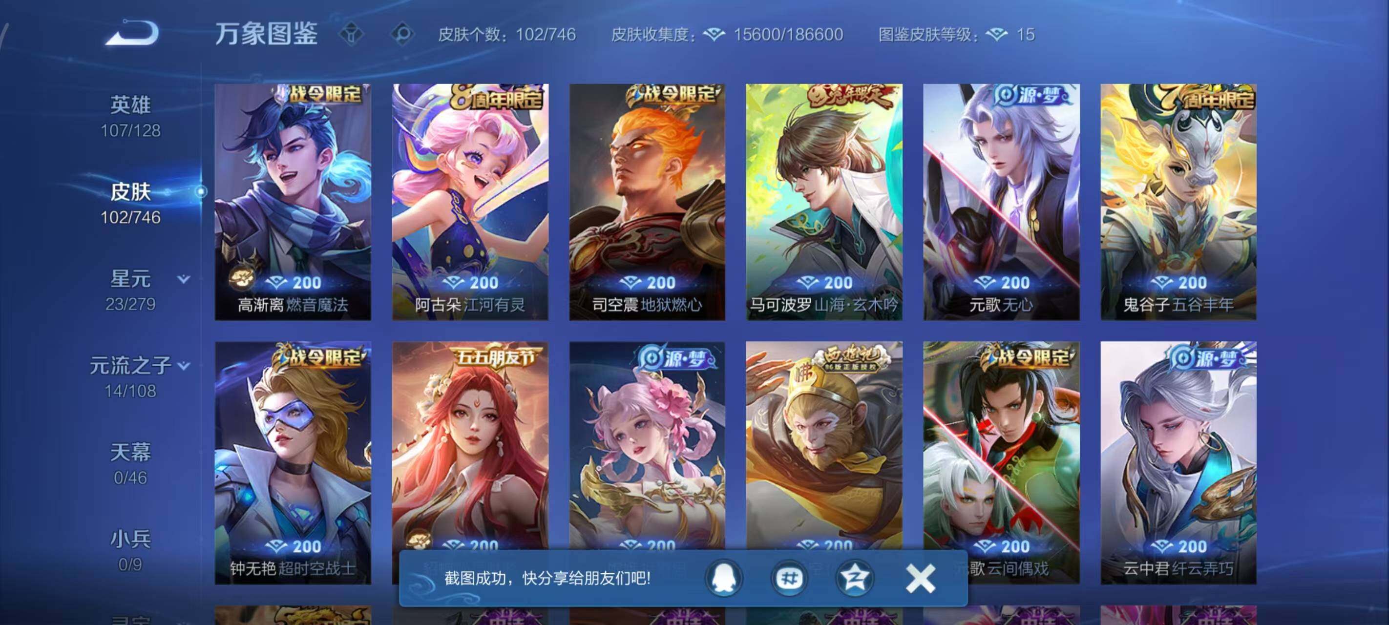 - [12321991]V7 4传说 125英雄 199皮肤 可修改实名 女号 优质装备:山海·苍雷引(电光曜子) 传说皮:貂蝉曦玄引 珍宝阁皮:妄想食味,蔷薇恋人 限定皮:愿照·岁时盈(虞姬年限),逐霄战戟,鸣野蒿,五谷丰年,青龙志(铠年限),梁祝,李小龙,朱雀志(守约年限),大圣娶亲,冰霜恋舞曲,美猴王 史诗皮:化蝶舞,星界特工,破空之剑,上官婉儿群星魔术团,百相守梦-黄忠,紫霞仙子,电玩小子(小书包),白龙吟,黄金分割率,千年之狐,江河有灵,百解令(蒙犽),高渐离燃音魔法,冰冠公主,青蛇,偶像歌手,电玩·爆裂旋风,末日机甲-吕布,猫狗日记-孙策,猫狗日记-大乔,时之恋人-孙尚香,节奏热浪,女仆咖啡,水果甜心,天才门将,星夜王子,功夫厨神,暗隐猎兽者,鬼剑武藏,心灵战警,纤云弄巧,拒霜思,缤纷独角兽,逐浪之夏,月团寄思,水晶猎龙者,金属风暴,圣诞狂欢,圣诞恋歌,鹰眼统帅,魅力维加斯,无心