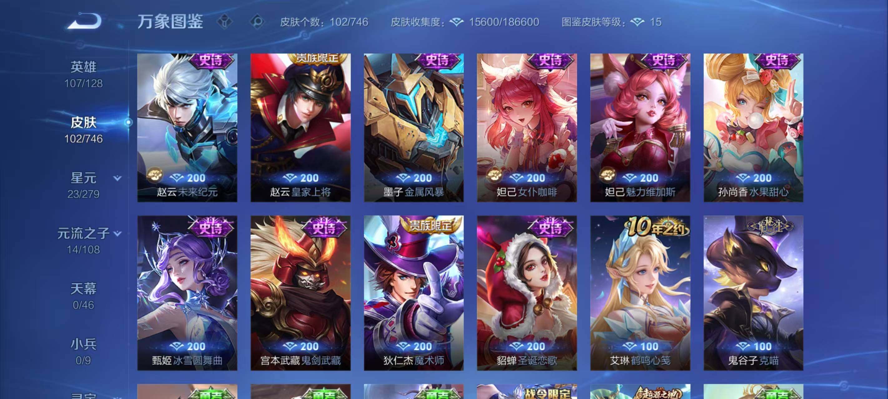 【史诗皮肤】:赵云皇家上将,赵云未来纪元,貂蝉圣诞恋歌,甄姬冰雪圆舞曲,狄仁杰魔术师,宫本武藏鬼剑武藏,孙尚香水果甜心,妲己魅力维加斯,妲己女仆咖啡,墨子金属风暴,吕布末日机甲,张飞乱世虎臣,刘邦德古拉伯爵,夏侯惇乘风破浪,兰陵王暗隐猎兽者,诸葛亮黄金分割率,安琪拉心灵骇客,阿轲节奏热浪,狄仁杰鹰眼统帅,小乔青蛇,橘右京修罗,孙尚香时之恋人,裴擒虎李小龙,云中君纤云弄巧,元歌云间偶戏,孙悟空孙行者,嫦娥拒霜思,貂蝉唤灵魅影,钟无艳超时空战士,鬼谷子五谷丰年,元歌无心,马可波罗山海玄木吟,司空震地狱燃心,阿古朵江河有灵,妲己灵卜魔法,高渐离燃音魔法,伽罗琥珀纪元,狂铁龙之律动,周瑜百相守梦,钟无艳戍鼓铭心,云缨赞萌露比,公孙离涂山容容