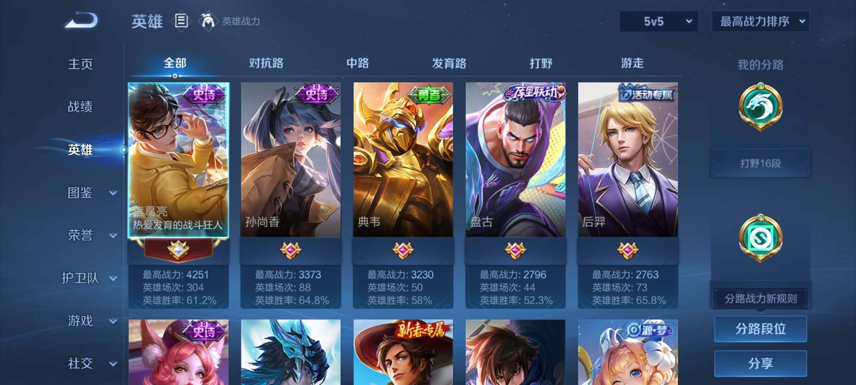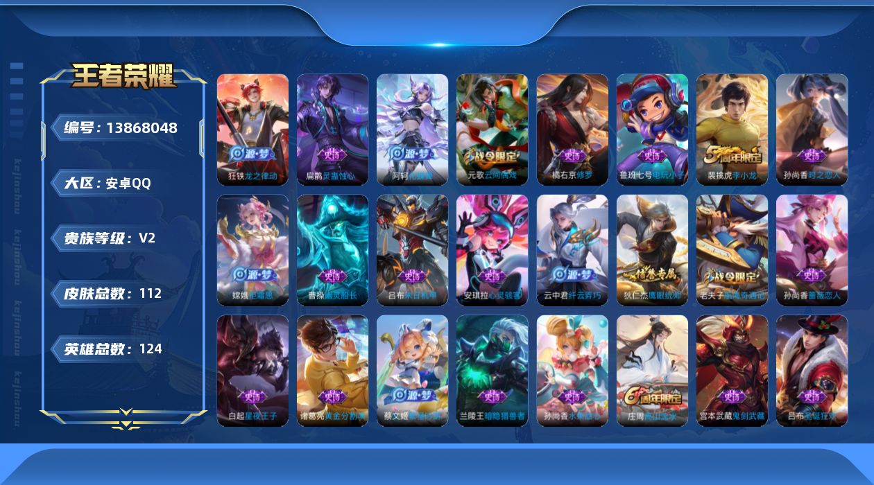 - [12002630]V8 16传说 123英雄 189皮肤 可修改实名 优质装备:云鹰飞将(小将军),久胜战神,一念神魔,末日机甲-孙尚香(绿蚂蚱),地狱火,时之恋人-刘备(电焊工),挚爱之约,山海·炽霜斩(李信年限) 传说皮:祥瑞亨通,幻光神枪 珍宝阁皮:妄想食味,玩趣恶龙 限定皮:愿照·九州拓(澜年限),愿照·山河定(司空震年限),陌上桑,鸣野蒿,凤求凰(白切鸡),傲雪梅枪,神威(电光马子),飞衡(韩信年限),高山流水,五谷丰年,青龙志(铠年限),梁祝,天狼绘梦者,李小龙,如梦令-后羿,蜜橘之夏,匿光追影者,深海之息(深海大菠萝) 史诗皮:器灵·浮梦炉,糖绘人间,瑰影绮梦,化蝶舞,谪仙醉月,破空之剑,苍穹之光,黄金分割率,特工魅影,千年之狐,永昼,无限星赏官,白蛇,晚萤,龙骑士(小龙虾),末日机甲-吕布,猫狗日记-孙策,猫狗日记-大乔,修罗,女仆咖啡,水果甜心,星夜王子,心灵骇客,幽灵船长,鬼剑武藏,舞动绿茵,乘风破浪,逐浪之夏,水晶猎龙者,曙光守护者,金属风暴,原初追逐者,鹰眼统帅,魅力维加斯,赏金猎手,奇遇舞章,无心
