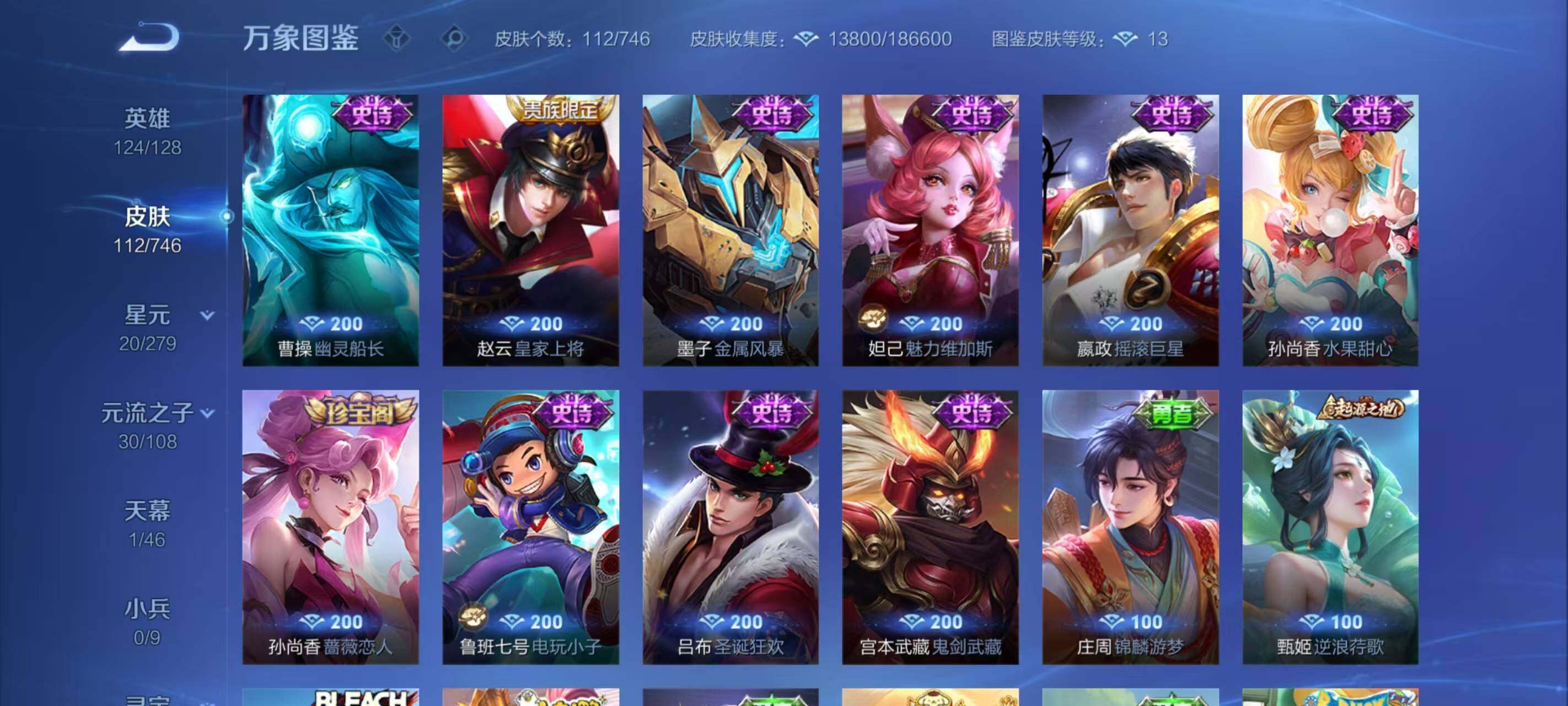 【史诗皮肤】:鲁班七号电玩小子,赵云皇家上将,宫本武藏鬼剑武藏,孙尚香蔷薇恋人,孙尚香水果甜心,嬴政摇滚巨星,妲己魅力维加斯,墨子金属风暴,吕布圣诞狂欢,曹操幽灵船长,吕布末日机甲,刘邦德古拉伯爵,兰陵王暗隐猎兽者,诸葛亮黄金分割率,雅典娜冰冠公主,安琪拉心灵骇客,刘禅天才门将,李元芳逐浪之夏,程咬金功夫厨神,白起星夜王子,狄仁杰鹰眼统帅,蔡文姬繁星吟游,橘右京修罗,孙尚香时之恋人,裴擒虎李小龙,云中君纤云弄巧,元歌云间偶戏,老夫子航海奇遇记,鲁班七号乒乒小将,干将莫邪真爱魔法,庄周高山流水,嫦娥拒霜思,阿轲化蝶舞,狂铁龙之律动,扁鹊灵蛊蚀心