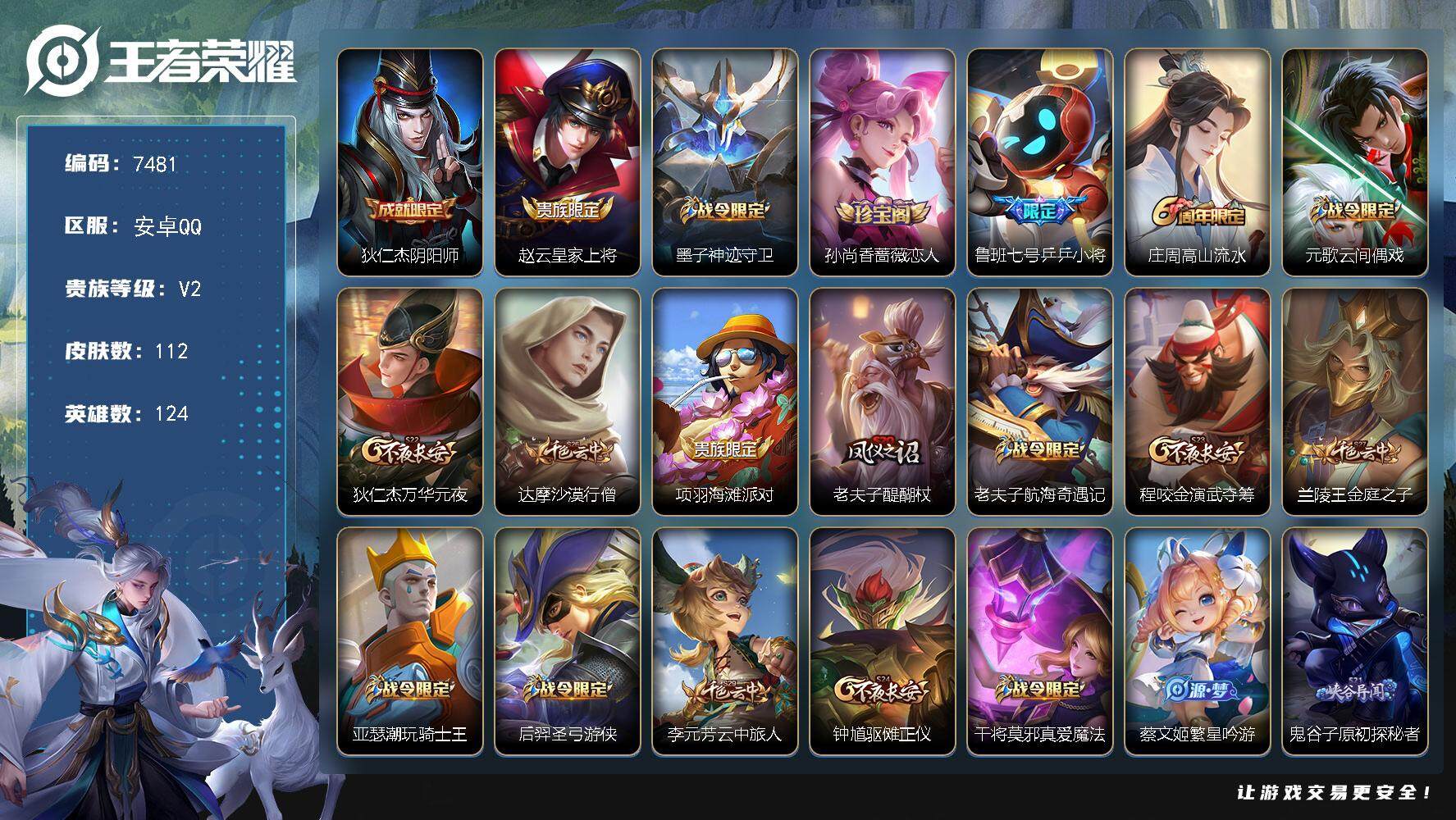 - [12879014]【特价急出/详情看图】安卓Q-V6-永恒钻石V段位-128英雄-370皮肤-1典藏-21传说-116史诗 【英雄全皮】:扁鹊全皮,猪八戒全皮 【荣耀典藏】:武则天英雄,小乔天鹅之梦 【传说皮肤】:桑启鸣野蒿,李白诗剑行,马超无双飞将,兰陵王默契交锋,诸葛亮时雨天司,镜炽阳神光,虞姬启明星使,曜云鹰飞将,李信一念神魔,刘备时之恋人,伽罗太华,貂蝉猫影幻舞,张良黄金白羊座,虞姬云霓雀翎,达摩黄金狮子座,李白凤求凰,孙尚香末日机甲,宫本武藏地狱之眼,孙悟空地狱火,武则天海洋之心,狄仁杰超时空战士 【限定皮肤】:白起狰,姜子牙天穹之誓,狄仁杰阴阳师,虞姬凯尔特女王,赵云皇家上将,赵云引擎之心,赵云龙胆,赵云百木心枪,嬴政白昼王子,鲁班七号狮舞东方,庄周高山流水,高渐离玩趣恶龙,阿轲迷踪丽影,钟无艳王者之锤,钟无艳超时空战士,孙膑妖精王,扁鹊炼金王,扁鹊奇幻香踪,白起夜都怪侠,芈月白晶晶,芈月幻夜卜梦,吕布猎兽之王,吕布御风骁将,周瑜赤莲之焰,元歌云间偶戏,夏侯惇朔风刀,甄姬落雪兰心,曹操烛龙,曹操天狼征服者,典韦穷奇,典韦蓝屏警告,典韦岱宗,马可波罗逐梦之星,马可波罗暗影游猎,狄仁杰魔术师,狄仁杰万华元夜,达摩星际陆战队,达摩沙漠行僧,项羽海滩派对,老夫子醍醐杖,关羽冰锋战神,程咬金演武夺筹,露娜一生所爱,刘邦夺宝奇兵,韩信逐梦之影,韩信飞衡,王昭君凤凰于飞,王昭君午后时光,兰陵王默契交锋,兰陵王驯魔猎人,兰陵王金庭之子,亚瑟潮玩骑士王,孙悟空大圣娶亲,牛魔御旌,后羿辉光之辰,李元芳银河之约,李元芳云中旅人,虞姬启明星使,钟馗神迹守卫,钟馗驱傩正仪,杨戬潮玩骑兵,女娲朔望之晖,干将莫邪冰霜恋舞曲,雅典娜黎明之约,蔡文姬繁星吟游,太乙真人饕餮,东皇太一逐梦之光,鬼谷子原初探秘者,鬼谷子五谷丰年,诸葛亮时雨天司,黄忠火炮绅士,铠青龙志,苏烈千军破阵,百里玄策原初追逐者,百里守约朱雀志,弈星混沌棋,梦奇顽趣,沈梦溪星空之诺,沈梦溪大漠名商,明世隐疑决卦,明世隐吟游魔法,裴擒虎李小龙,裴擒虎擒涛扼浪,狂铁御狮,狂铁电玩高手,米莱狄御霄,米莱狄胡桃异想国,云中君纤云弄巧,云中君时之祈愿,伽罗太华,盾山御銮,猪八戒西部大镖客,猪八戒猪悟能,上官婉儿梁祝,上官婉儿天狼绘梦者,嫦娥拒霜思,西施玲珑珍味,鲁班大师探海日志,镜匿光追影者,桑启海盐诗旅,戈娅驭风魔法,艾琳流音漫舞,司空震地狱燃