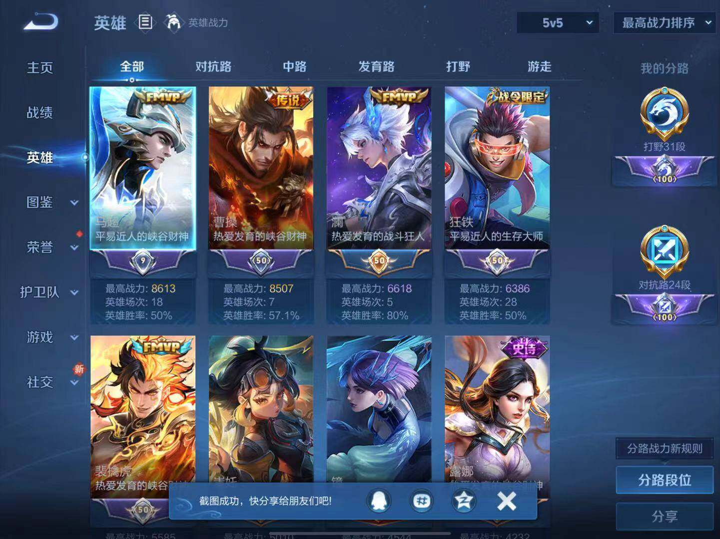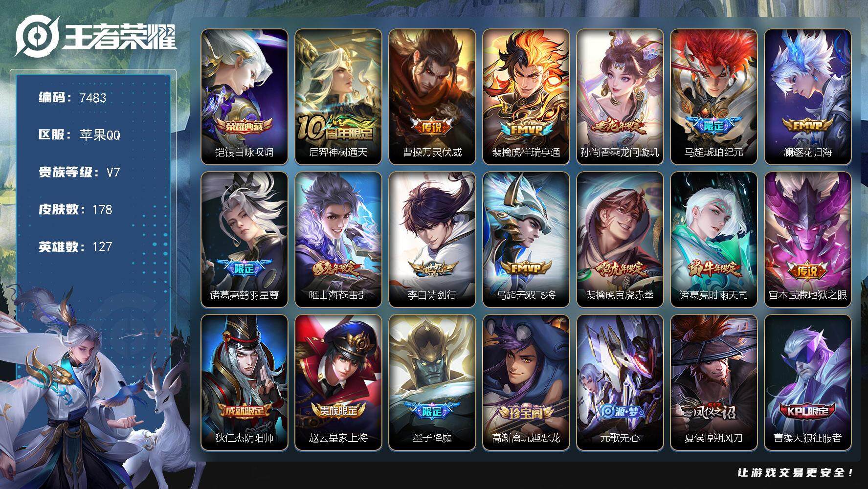 - [12030684]V7 1典藏 9传说 123英雄 237皮肤 可修改实名 优质装备:九霄神辉(木兰典藏),黄金狮子座,久胜战神,一念神魔,末日机甲-孙尚香(绿蚂蚱),地狱火 传说皮:云诺千山 珍宝阁皮:优雅恋人 限定皮:愿照·九州拓(澜年限),愿照·山河定(司空震年限),至尊宝,时雨天司(水龙头),飞衡(韩信年限),遇见飞天,梁祝,御风骁将(吕布年限),李小龙,逐梦之影,朱雀志(守约年限),大圣娶亲,冰霜恋舞曲 史诗皮:鸭鸭历险记-刘禅,飞车小橘子,化蝶舞,龙之律动,雪豹·霜爪,藏狐·褐绒,石田雨龙,茶境仙,百相守梦-黄忠,紫霞仙子,千年之狐,魅语,冰冠公主,偶像歌手,猫狗日记-大乔,修罗,女仆咖啡,水果甜心,星夜王子,功夫厨神,暗隐猎兽者,幽灵船长,鬼剑武藏,乐园奇幻夜,天秀·启明,纤云弄巧,繁星吟游(呼啦呼啦),乘风破浪,逐浪之夏,水晶猎龙者,曙光守护者,原初追逐者,圣诞狂欢,鹰眼统帅,王者之锤,魅力维加斯,黎明之约,未来纪元-赵云