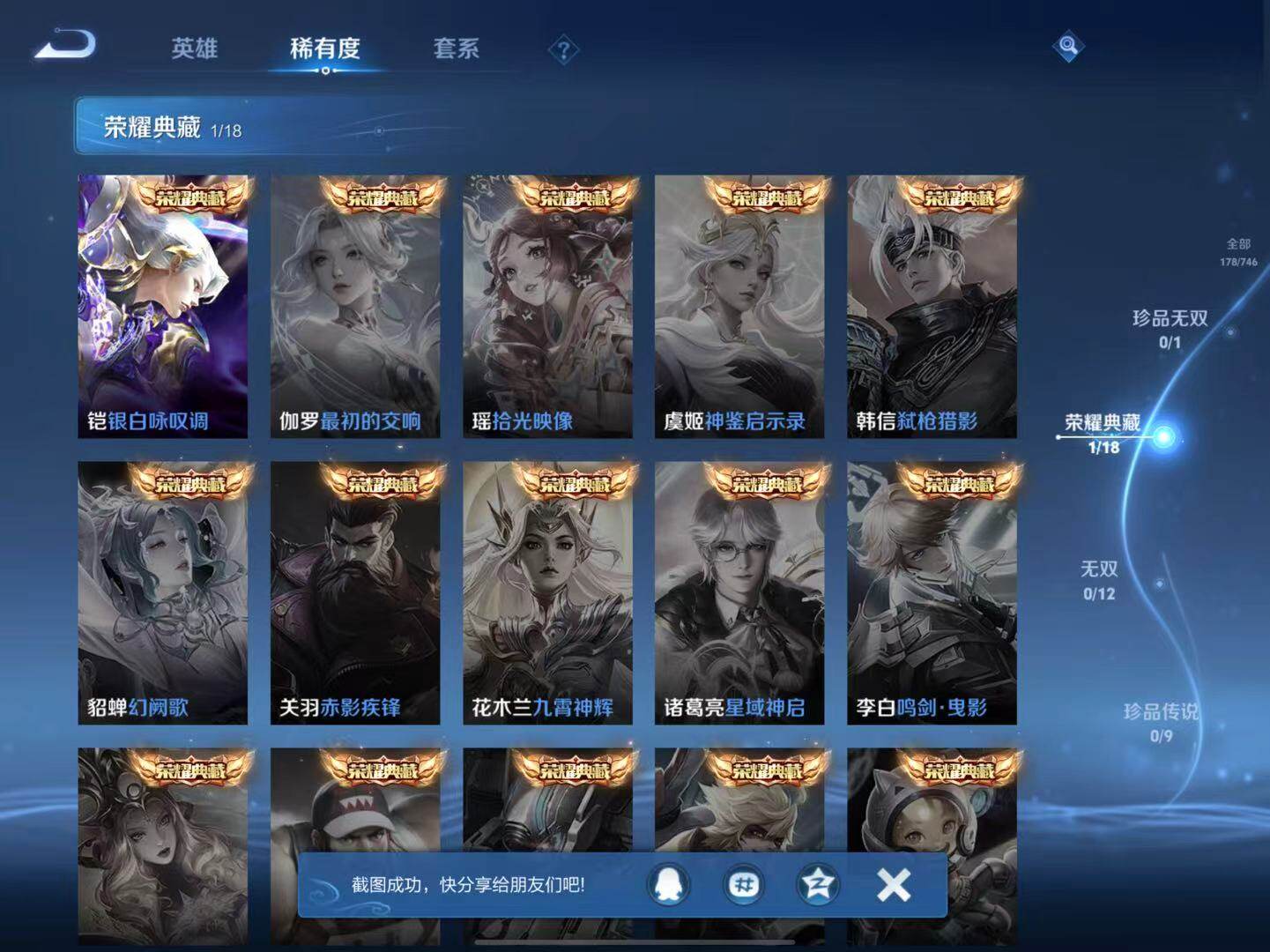 - PX_2094704-68 苹果QQ/最强王者/68皮肤/86英雄/0典藏/0珍品无双/0无双/1珍品传说/5传说/15史诗/5稀有英雄 【1 珍品传说】黑崎一护 宫本武藏, 【5 传说皮肤】末日机甲 孙尚香,愿照·九州拓 澜,幻光神枪 云缨,愿照·山河定 司空震,祥瑞亨通 裴擒虎, 【15 史诗皮肤】星夜王子 白起,偶像歌手 王昭君,鹰眼统帅 狄仁杰,藏狐·褐绒 老夫子,石田雨龙 后羿,鸭鸭历险