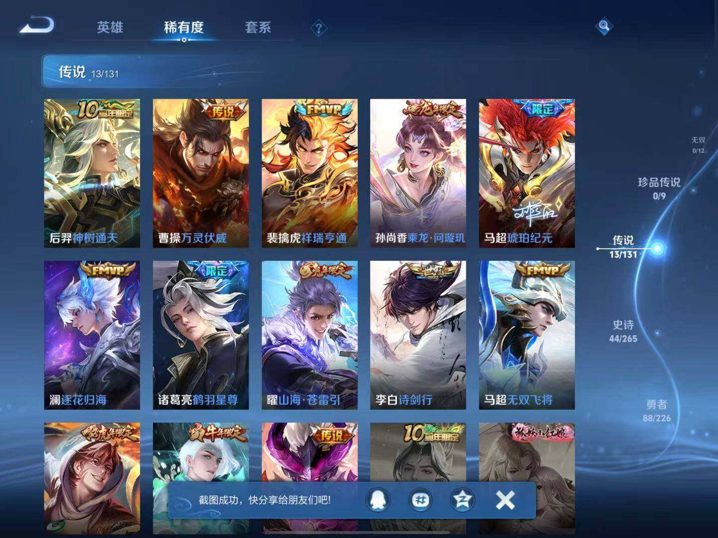 【传说皮肤】:后羿神树通天,曹操万灵伏威,裴擒虎祥瑞亨通,孙尚香乘龙问璇玑,马超琥珀纪元,澜逐花归海,诸葛亮鹤羽星尊,曜山海苍雷引,李白诗剑行,马超无双飞将,裴擒虎寅虎赤拳,诸葛亮时雨天司,宫本武藏地狱之眼