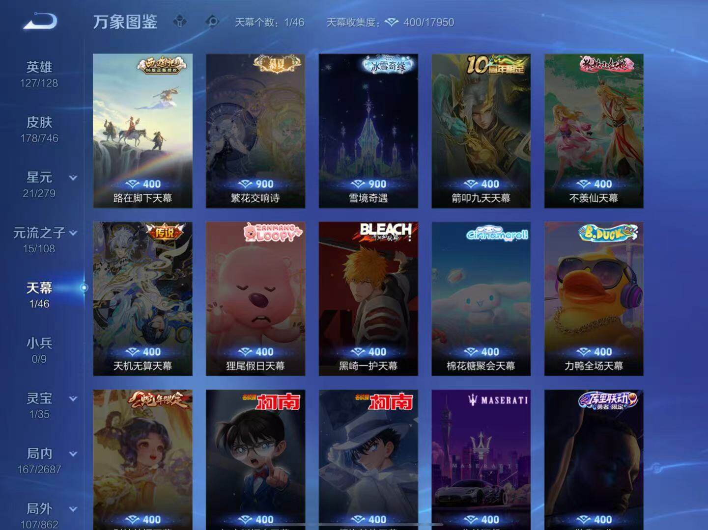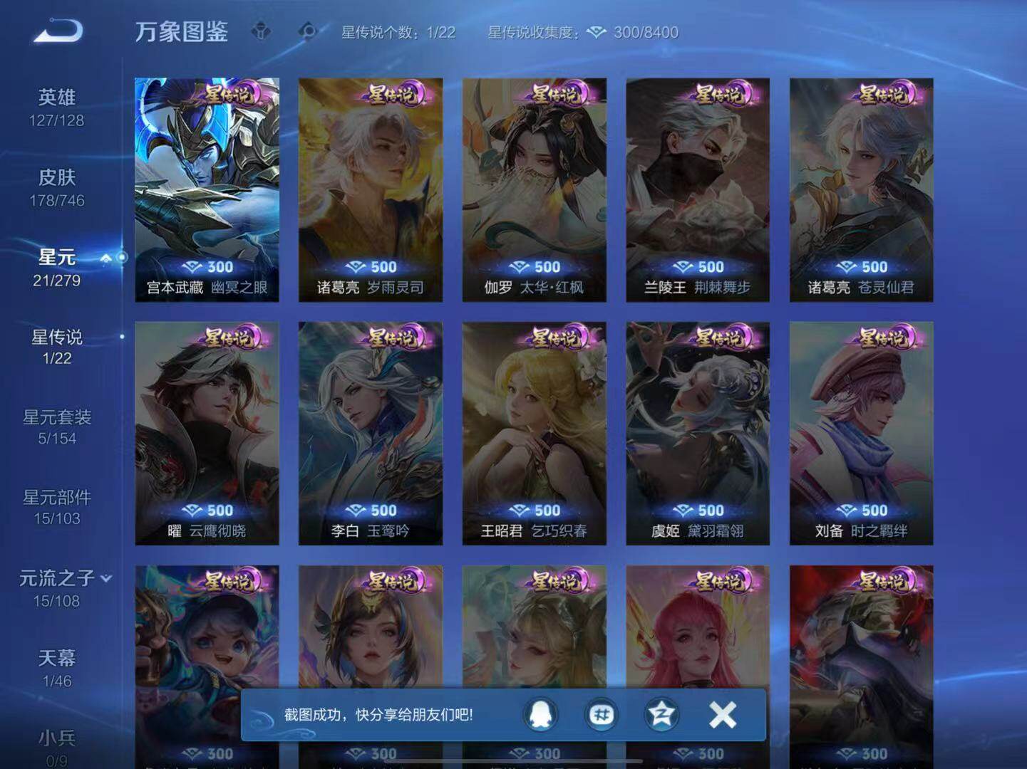 - PX_2092074-贵族8/皮肤263/典藏3/传说9/史诗79/英雄124/全息碎影/鸣剑曳影/星域神启/蔷薇恋人/女武神/特工战影/地狱火/武陵仙君/零号赤焰/启明星使/寅虎瑞焰/诗剑行/怒海麟威/铠冥王哈迪斯/桑启鸣野蒿/铠冥王哈迪斯/蒙犽顽岩魄/蔡文姬夏日便利店/大乔绒语心约/虞姬夏日便利店/姜子牙天穹之誓/杨戬破阵退雄兵/狄仁杰阴阳师/赵云皇家上将/百木心枪/蔷薇恋人/狮舞东方/寅虎瑞