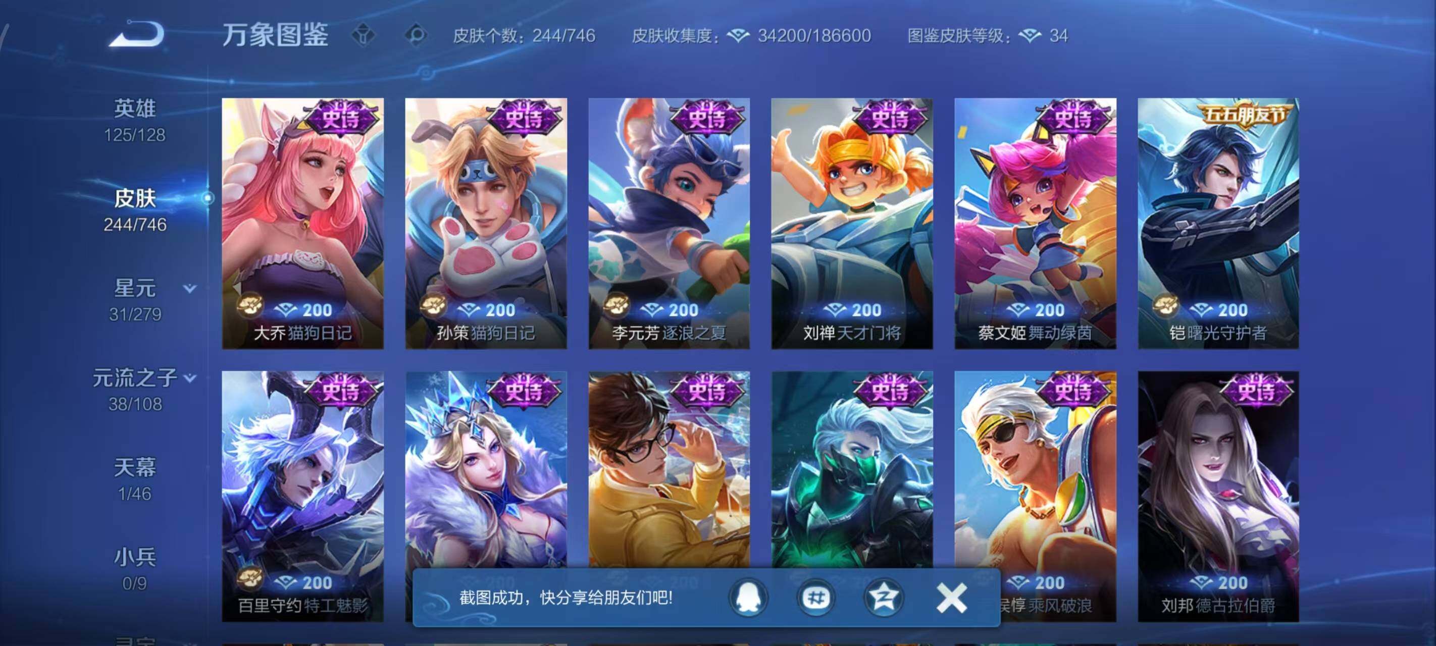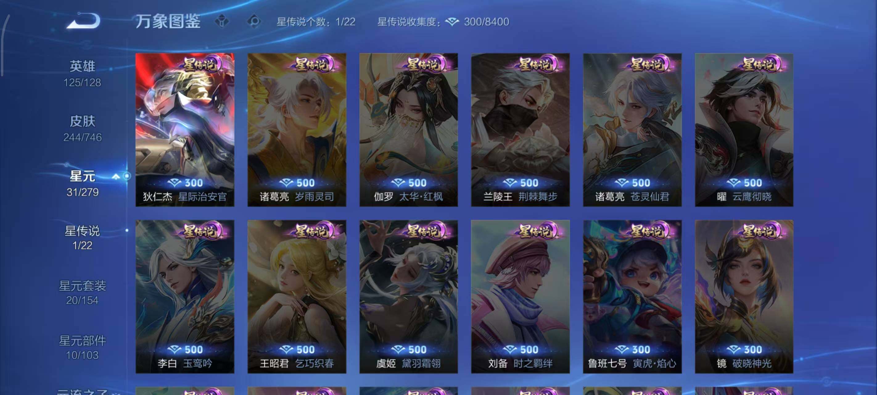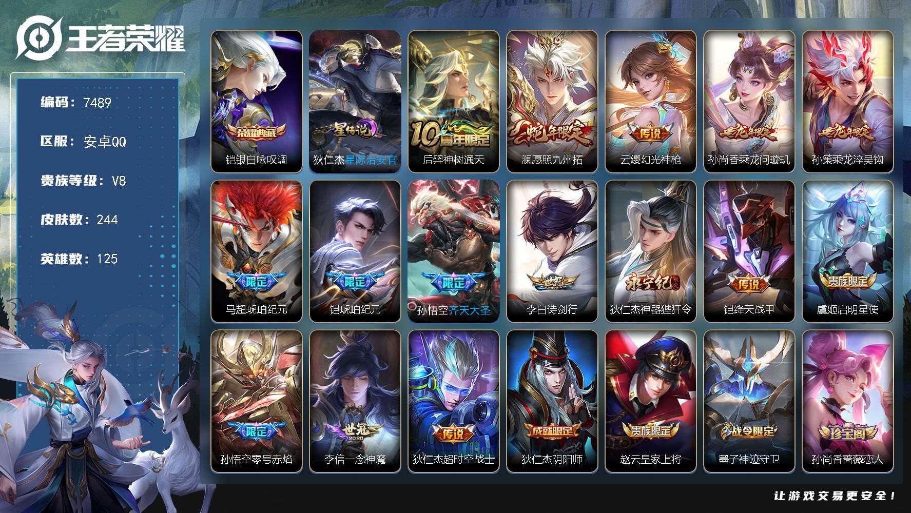 - [12296510]V9 1典藏 42传说 125英雄 325皮肤 可修改实名 优质装备:银白咏叹调(倪克斯侍卫),云鹰飞将(小将军),绛天战甲(鸡嘴战神),炽阳神光,一念神魔,云霓雀翎,地狱火,零号·赤焰,地狱之眼,飞鸢探春,李逍遥,时之恋人-刘备(电焊工),淬星耀世,末日机甲-孙策,挚爱之约,无双飞将,碎云,山海·炽霜斩(李信年限),山海·苍雷引(电光曜子),炽翼辉光(娃娃菜牛角包),燃星之曲,画中仙,浮生妄,记忆之芯(机甲兔),百相守梦(张飞),电玩·雷克斯,澜逐花归海 珍宝阁皮:优雅恋人,玩趣恶龙 限定皮:至尊宝,凤凰于飞,武陵仙君(小桃花),异界灵契(白毛香),傲雪梅枪,寅虎·展翼(孙膑年限),前尘镜,无限倾心-项羽,瑞麟志(木兰年限),诗剑行,无限倾心-虞姬,齐天大圣,匿光决锋者,怒海麟威,五谷丰年,青龙志(铠年限),梁祝,龙胆,天狼绘梦者,李小龙,玄武志(苏烈年限),朱雀志(守约年限),默契交锋-兰陵王,孙行者,猪悟能,匿光追影者,寅虎·御盾(廉颇年限),寅虎·瑞焰(虎皮蛋子),寅虎·心曲(虎婆),寅虎·赤拳(老虎年限),时之祈愿-云中君,百木心枪,启示之音,无尽星芒,深海之息(深海大菠萝),枫霜尽,山海·玄木吟(马可年限) 史诗皮:龙之律动,石田雨龙,怒海争锋,蔬乡物语(鲁班七号),百相守梦-黄忠,遇见神鹿,紫霞仙子,白龙吟,黄金分割率,千年之狐,永昼,江河有灵,匿光侦查者,真我赫兹(百里守约),魅语,百解令(蒙犽),高渐离燃音魔法,蒙恬荣光圣徽,无限星赏官,匿光破解者,偶像歌手,电玩·爆裂旋风,百相守梦(刘备),暗夜猫娘,百相守梦(关羽),末日机甲-吕布,猫狗日记-孙策,时之恋人-孙尚香,女仆咖啡,水果甜心,天才门将,星夜王子,心灵骇客,功夫厨神,德古拉伯爵,暗隐猎兽者,幽灵船长,鬼剑武藏,心灵战警,乐园奇幻夜,舞动绿茵,纤云弄巧,繁星吟游(呼啦呼啦),拒霜思,缤纷独角兽,乘风破浪,逐浪之夏,龙鼓争鸣,月团寄思,水晶猎龙者,热力回旋,箭羽风息,唤灵魅影,金属风暴,圣诞恋歌,鹰眼统帅,魅力维加斯,赏金猎手,奇遇舞章,天秀·音浪,寅虎·御盾,无心,未来纪元-赵云