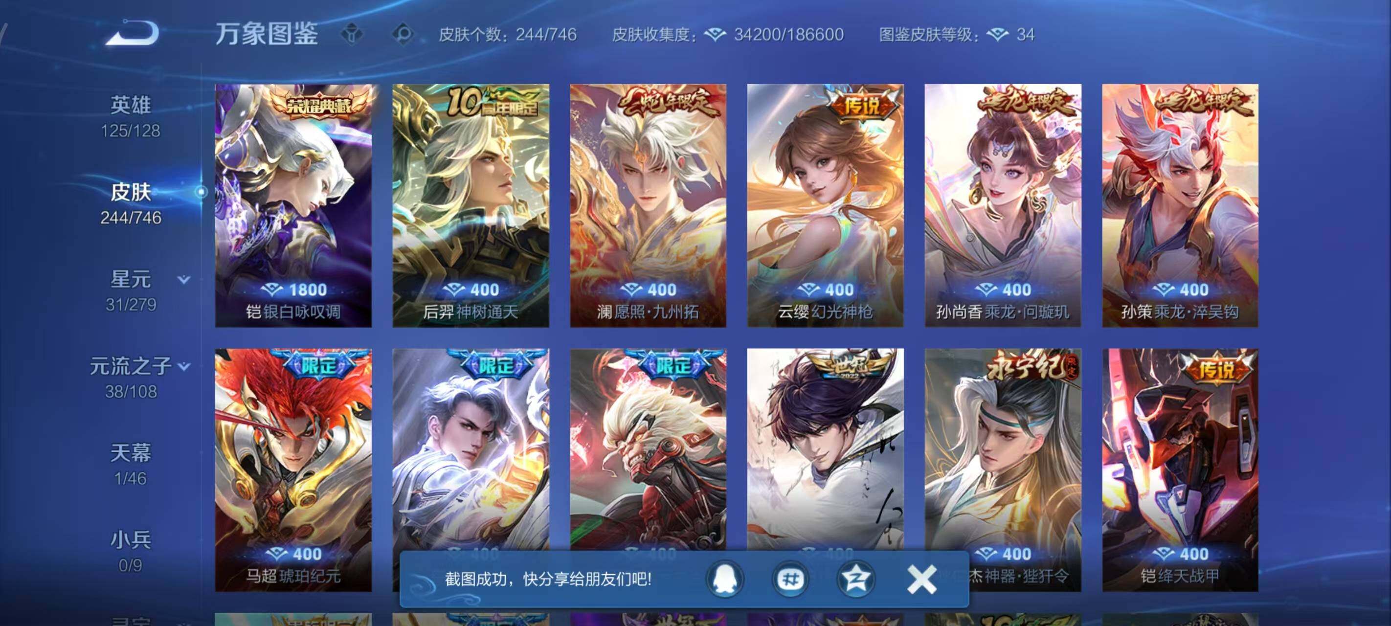 【传说皮肤】:后羿神树通天,澜愿照九州拓,云缨幻光神枪,孙尚香乘龙问璇玑,孙策乘龙淬吴钩,马超琥珀纪元,铠琥珀纪元,孙悟空齐天大圣,李白诗剑行,狄仁杰神器狴犴令,铠绛天战甲,虞姬启明星使,孙悟空零号赤焰,李信一念神魔,狄仁杰超时空战士