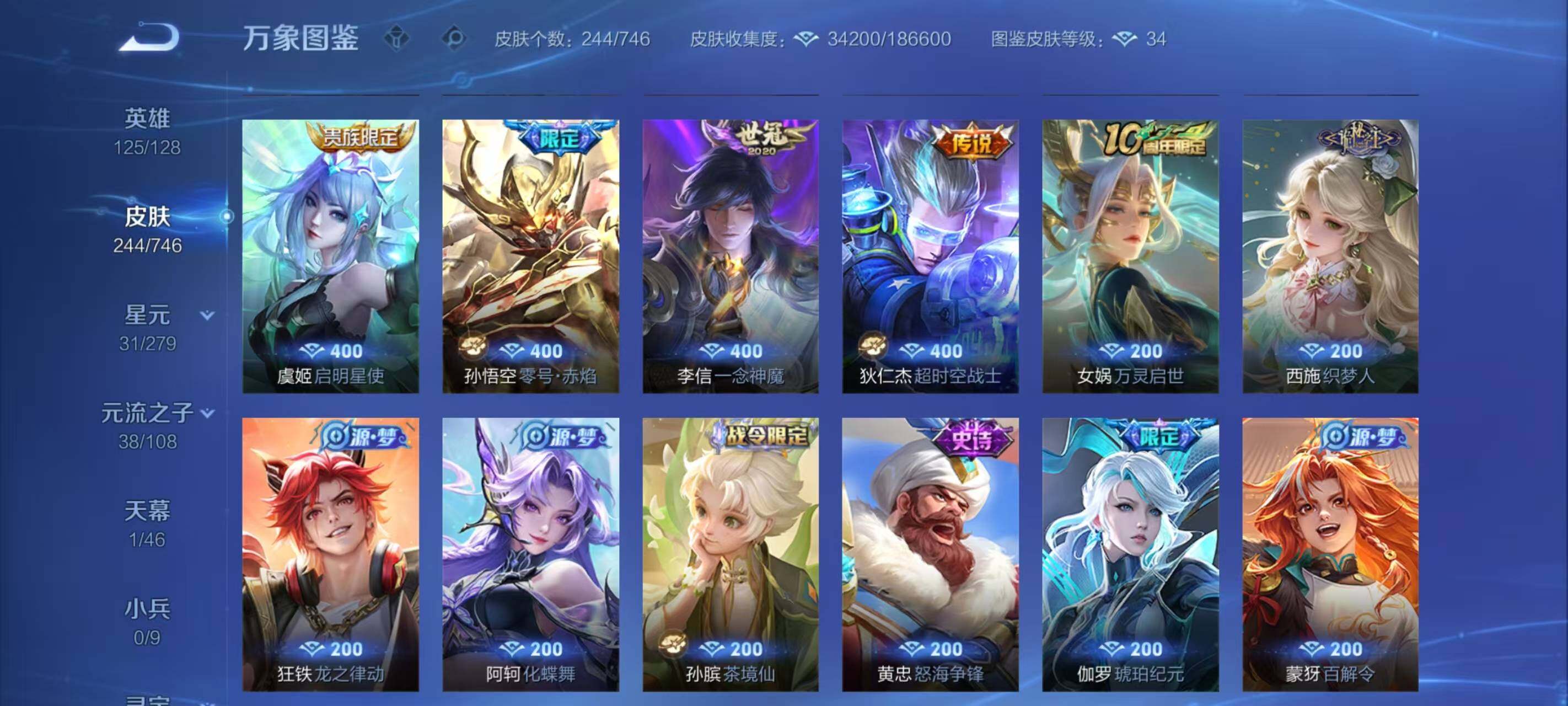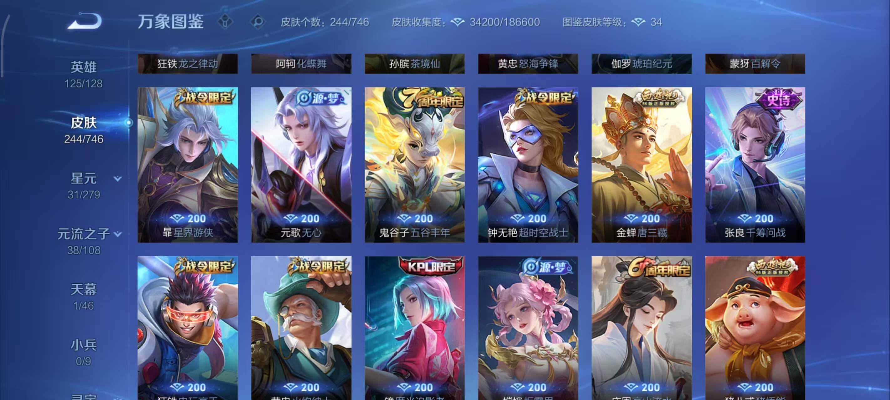 【限定皮肤】:狄仁杰阴阳师,赵云皇家上将,墨子神迹守卫,孙尚香蔷薇恋人,鲁班七号乒乒小将,庄周高山流水,高渐离玩趣恶龙,钟无艳超时空战士,芈月幻夜卜梦,元歌云间偶戏,元歌无心,甄姬落雪兰心,狄仁杰魔术师,狄仁杰万华元夜,狄仁杰神器狴犴令,达摩星际陆战队,达摩沙漠行僧,项羽海滩派对,老夫子航海奇遇记,程咬金演武夺筹,王昭君午后时光,兰陵王金庭之子,亚瑟潮玩骑士王,孙悟空至尊宝,孙悟空零号赤焰,孙悟空孙行者,孙悟空齐天大圣,后羿圣弓游侠,李元芳云中旅人,虞姬启明星使,钟馗驱傩正仪,干将莫邪真爱魔法,鬼谷子原初探秘者,鬼谷子五谷丰年,黄忠火炮绅士,铠青龙志,苏烈千军破阵,百里守约朱雀志,沈梦溪大漠名商,裴擒虎李小龙,裴擒虎擒涛扼浪,狂铁电玩高手,米莱狄胡桃异想国,云中君纤云弄巧,猪八戒猪悟能,嫦娥拒霜思,嫦娥暖冬兔眠,鲁班大师探海日志,镜匿光追影者,桑启海盐诗旅,金蝉唐三藏,暃星界游侠,艾琳女武神,张良古海寻踪,蒙犽百解令,妲己灵卜魔法,鬼谷子天穹祈灯,伽罗琥珀纪元,铠琥珀纪元,马超琥珀纪元,孙尚香乘龙问璇玑,孙策乘龙淬吴钩,刘邦剑破天穹