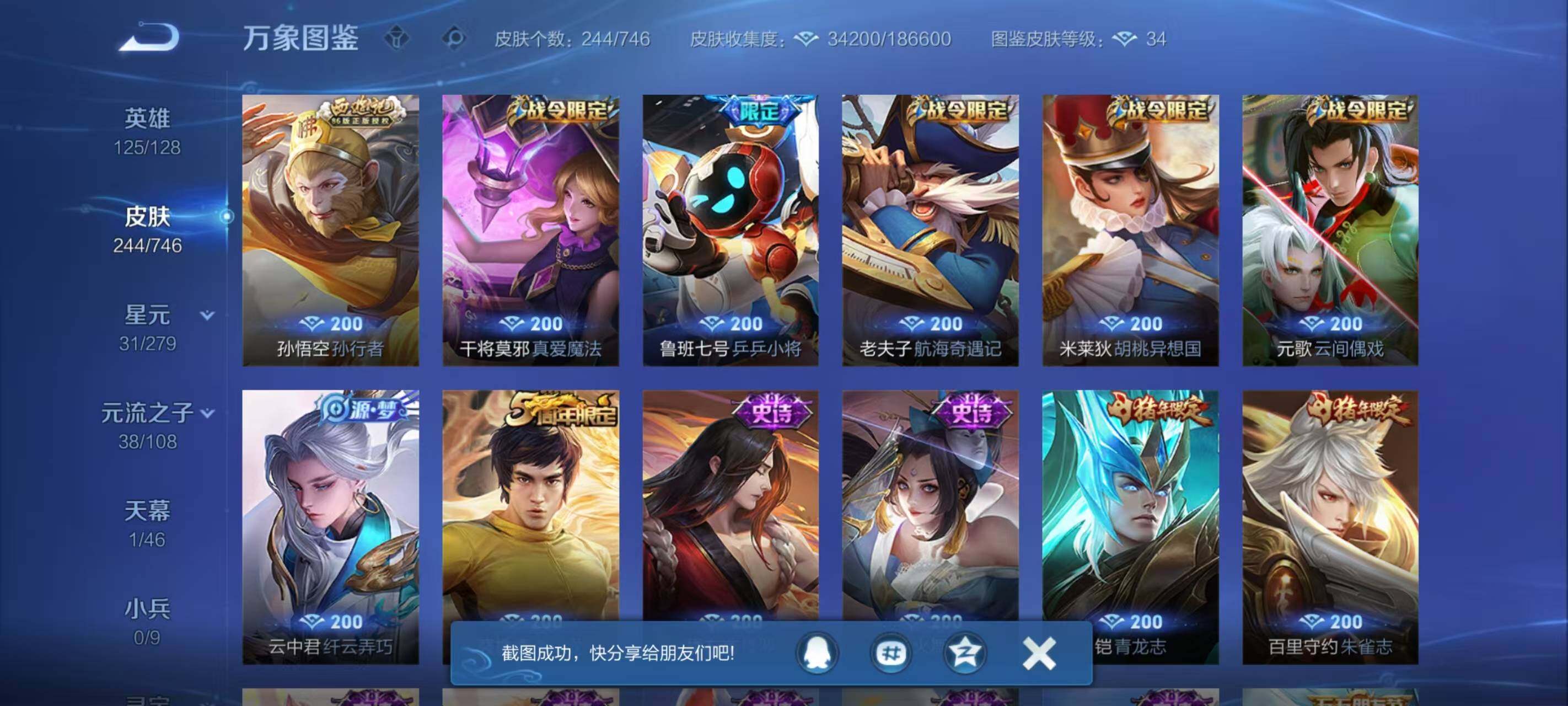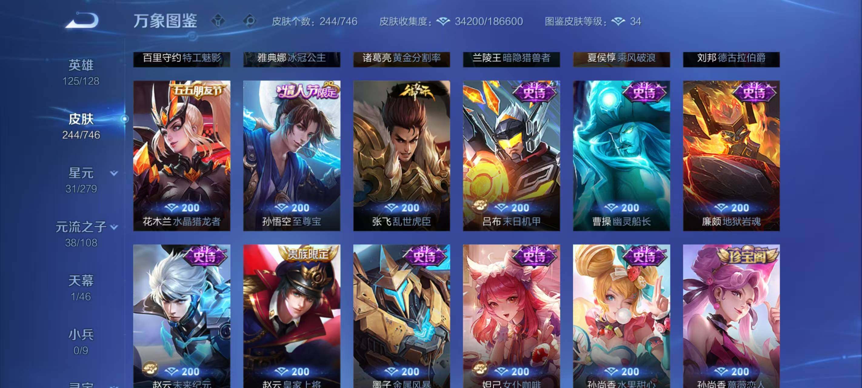 - 苹果QQ 可二次 贵族9 段位永恒钻石II 皮肤价值300118 英雄数量126 皮肤数量407 荣耀水晶2 传说皮肤29 珍品2 限定皮肤48 无双皮肤1 内测3 赛季皮肤31 史诗皮肤51 普通皮肤47 其他310