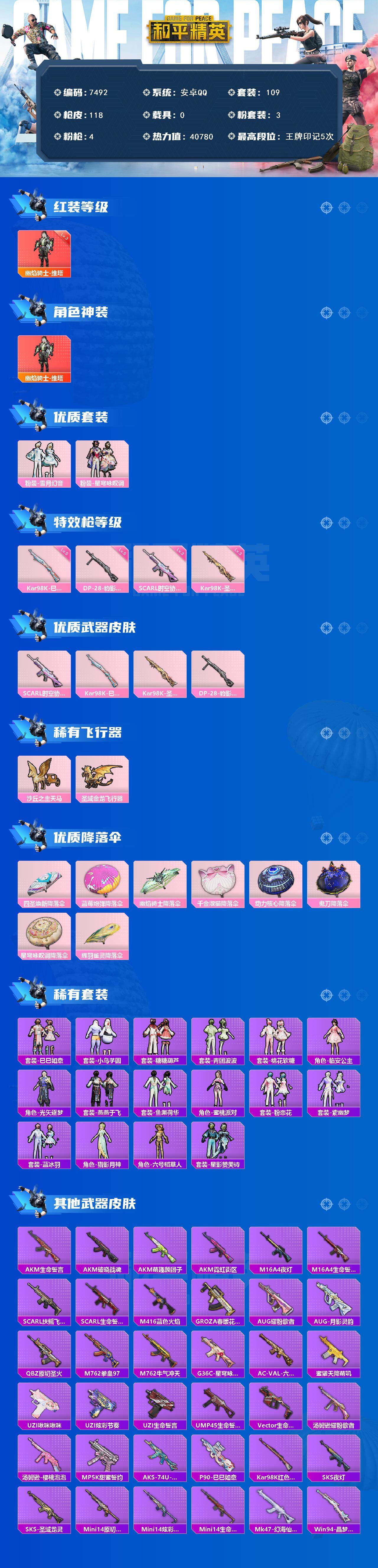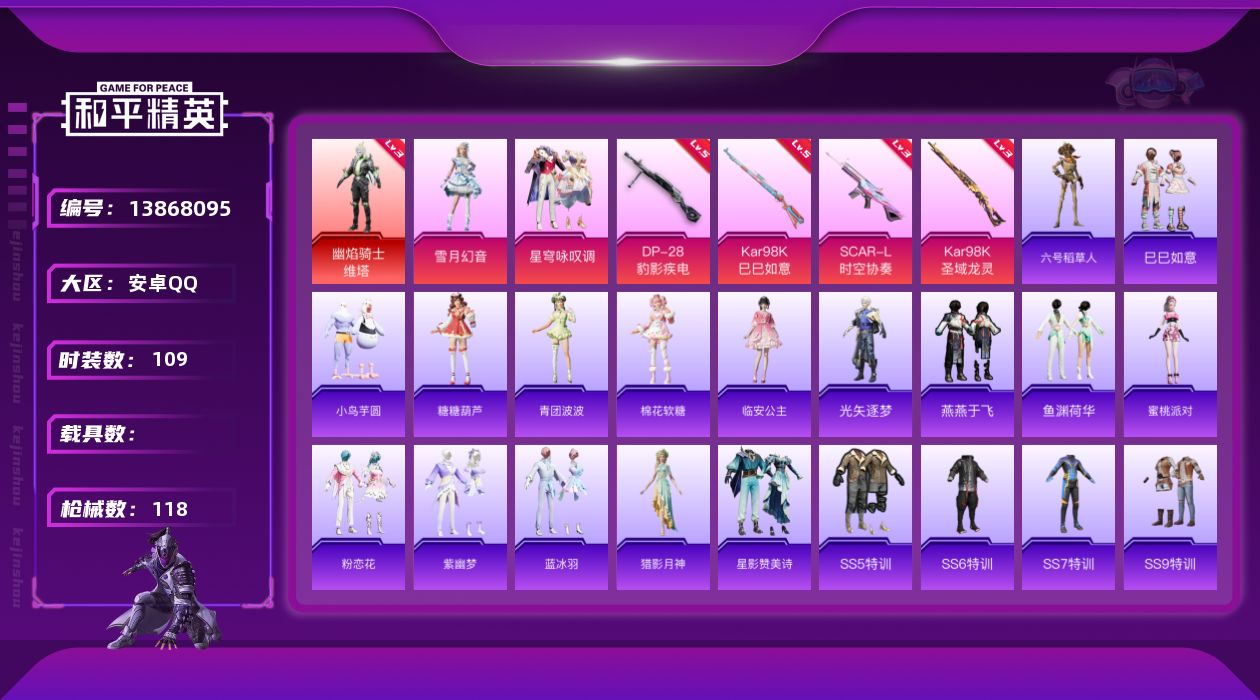 [13868095]安卓 手Q-1神装-3粉装-4特效枪-0载具-2粉色飞行器-40780热力值-5王牌印记-109套装-118枪皮 【红色神装等级】:幽焰骑士-维塔(三级) 【红色角色神装】:幽焰骑士-维塔 【热门品类】:角色-六号稻草人 【粉色套装】:粉装-雪月幻音,粉装-星穹咏叹调 【粉色枪皮等级】:SCAR-L-时空协奏(三级),Kar98K-巳巳如意(五级),Kar98K-圣域龙灵(三级),DP-28-豹影疾电(五级) 【粉色枪皮】:SCAR-L-时空协奏,Kar98K-巳巳如意,Kar98K-圣域龙灵,DP-28-豹影疾电 【粉色飞行器】:沙丘之主天马,圣域金龙飞行器 【粉色降落伞】:四圣焕新降落伞,蓝莓炮弹降落伞,幽焰骑士降落伞,千金淑猫降落伞,动力核心降落伞,鬼刀降落伞,星穹咏叹调降落伞,辉羽雀灵降落伞 【稀有套装】:套装-巳巳如意,套装-小鸟芋圆,套装-糖糖葫芦,套装-青团波波,套装-棉花软糖,角色-临安公主,角色-光矢逐梦,套装-燕燕于飞,套装-鱼渊荷华,角色-蜜桃派对,套装-粉恋花,套装-紫幽梦,套装-蓝冰羽,角色-猎影月神,角色-六号稻草人,套装-星影赞美诗 【稀有枪皮】:AKM-生命誓言,AKM-破晓战魂,AKM-萌趣颜团子,AKM-霓虹街区,M16A4-夜灯,M16A4-生命誓言,SCAR-L-扶摇飞仙,SCAR-L-生命誓言,M416-蓝色火焰,GROZA-春暖花开,AUG-耀粉歌者,AUG-月影灵韵,QBZ-原初圣火,M762-拳皇97,M762-牛气冲天,G36C-星穹咏叹调,AC-VAL-六号稻草人,蜜獾-天降萌叽,UZI-啾咪啾咪,UZI-炫彩节奏,UZI-生命誓言,UMP45-生命誓言,Vector-生命誓言,汤姆逊-耀粉歌者,汤姆逊-樱桃泡泡,MP5K-甜蜜誓约,AKS-74U-辉羽雀灵,P90-巳巳如意,Kar98K-红色方程式,SKS-夜灯,SKS-圣域龙灵,Mini14-原初圣火,Mini14-炫彩节奏,Mini14-生命誓言,Mk47-幻海仙踪,Win94-晶梦幻蝶,M200-翎光蝶翼,M200-六号稻草人,S686-蜜语绒猫,S686-彩虹符号,S686-生命誓言,S686-巳巳如意,S12K-玩趣呆呆,S12K-夜灯,DBS-彩虹符号,M249-拳皇97,DP-28-原初圣火,MG3-幻世战舞者,MG3-智耀战神,P92-拳皇97