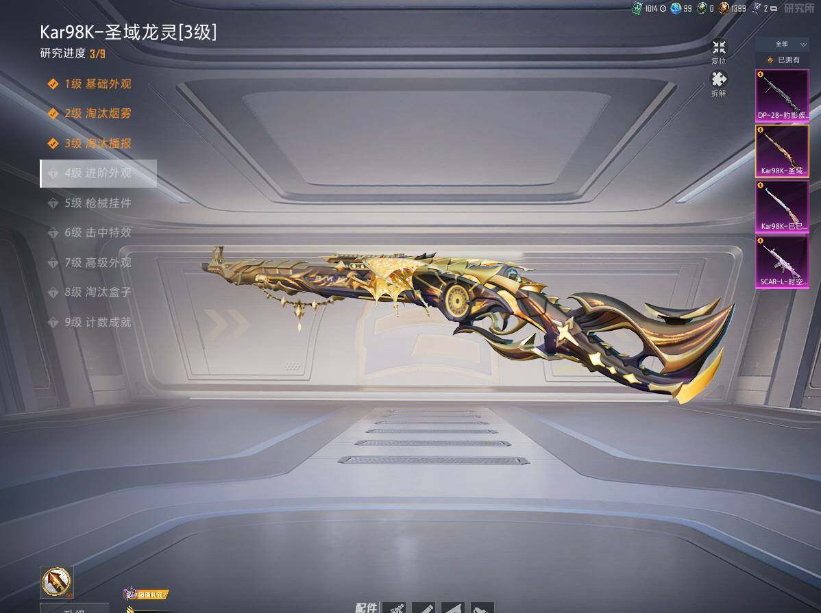 【粉色枪皮等级】:SCAR-L-时空协奏(三级),Kar98K-巳巳如意(五级),Kar98K-圣域龙灵(三级),DP-28-豹影疾电(五级)
