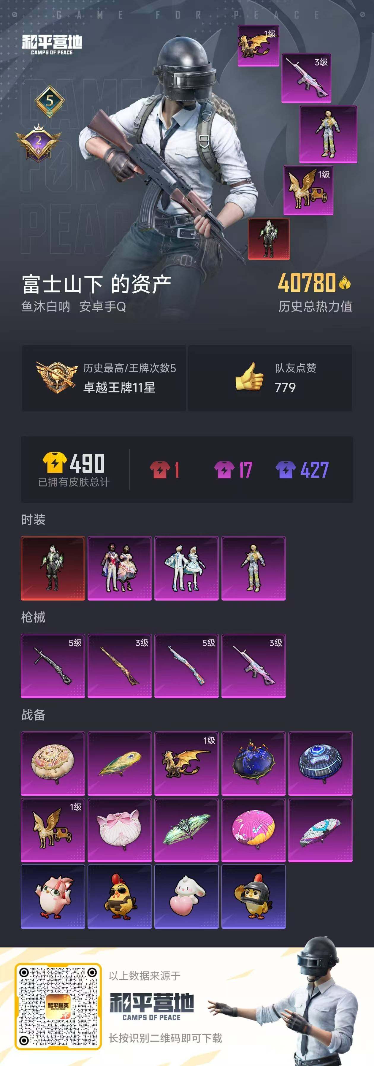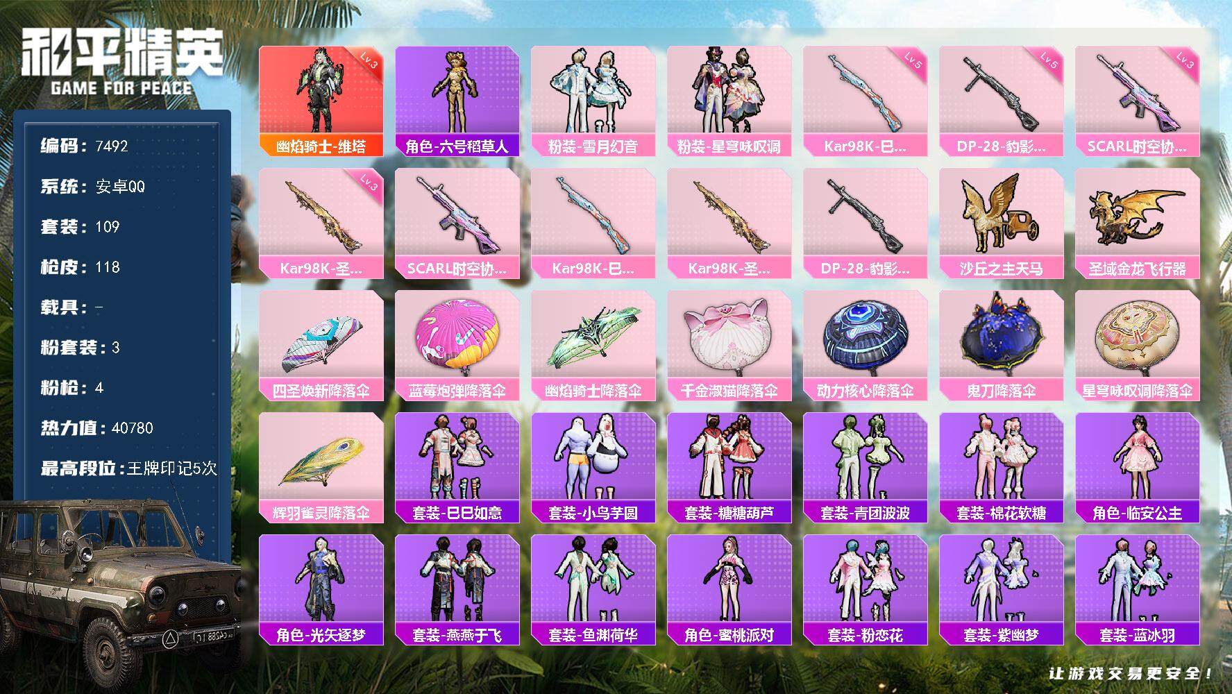 [13868095]安卓 手Q-1神装-3粉装-4特效枪-0载具-2粉色飞行器-40780热力值-5王牌印记-109套装-118枪皮