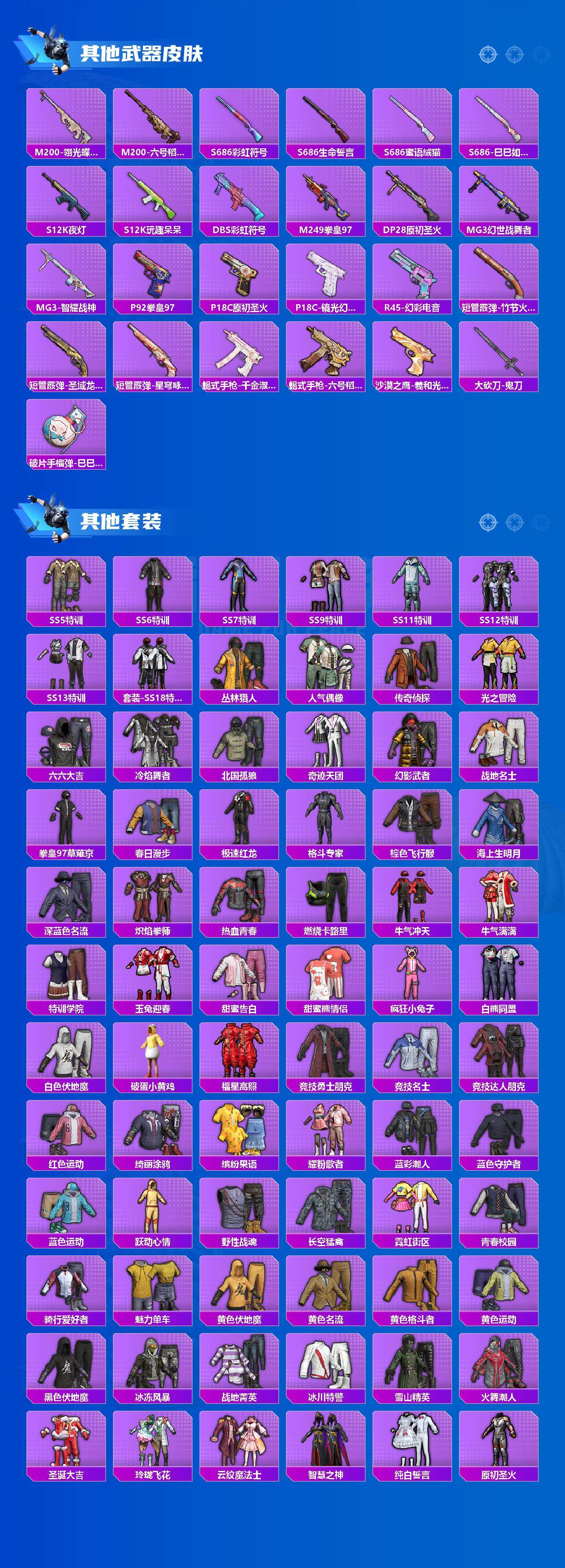 【稀有枪皮】:AKM-生命誓言,AKM-破晓战魂,AKM-萌趣颜团子,AKM-霓虹街区,M16A4-夜灯,M16A4-生命誓言,SCAR-L-扶摇飞仙,SCAR-L-生命誓言,M416-蓝色火焰,GROZA-春暖花开,AUG-耀粉歌者,AUG-月影灵韵,QBZ-原初圣火,M762-拳皇97,M762-牛气冲天,G36C-星穹咏叹调,AC-VAL-六号稻草人,蜜獾-天降萌叽,UZI-啾咪啾咪,UZI-炫彩节奏,UZI-生命誓言,UMP45-生命誓言,Vector-生命誓言,汤姆逊-耀粉歌者,汤姆逊-樱桃泡泡,MP5K-甜蜜誓约,AKS-74U-辉羽雀灵,P90-巳巳如意,Kar98K-红色方程式,SKS-夜灯,SKS-圣域龙灵,Mini14-原初圣火,Mini14-炫彩节奏,Mini14-生命誓言,Mk47-幻海仙踪,Win94-晶梦幻蝶,M200-翎光蝶翼,M200-六号稻草人,S686-蜜语绒猫,S686-彩虹符号,S686-生命誓言,S686-巳巳如意,S12K-玩趣呆呆,S12K-夜灯,DBS-彩虹符号,M249-拳皇97,DP-28-原初圣火,MG3-幻世战舞者,MG3-智耀战神,P92-拳皇97
