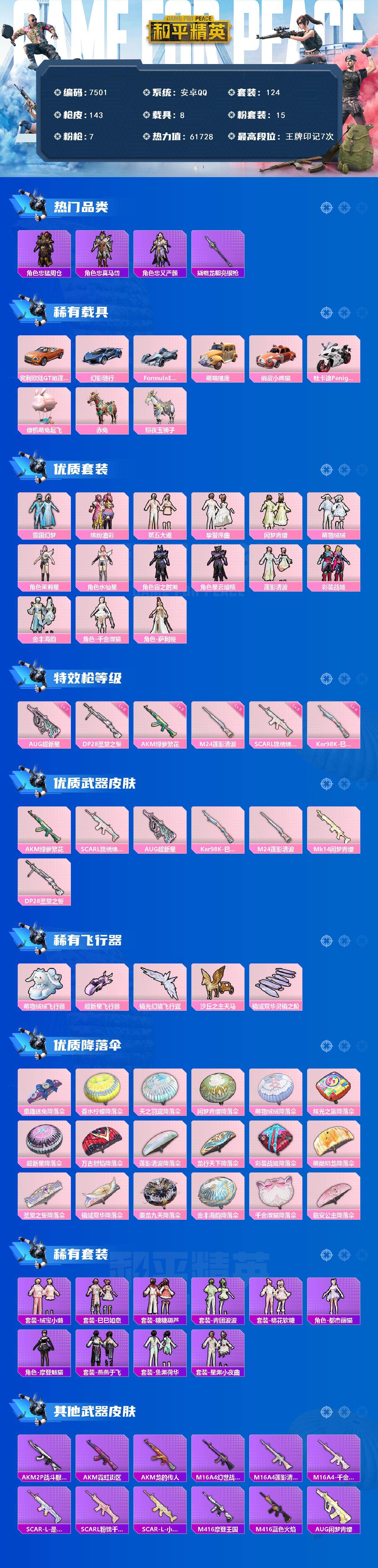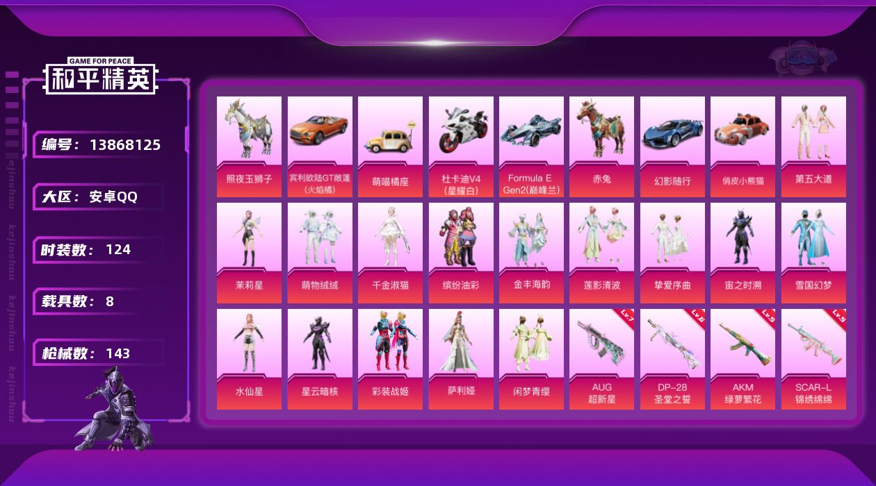 [13868125]安卓 手Q-15粉装-7特效枪-8载具-5粉色飞行器-61728热力值-7王牌印记-124套装-143枪皮 【热门品类】:粉装-雪国幻梦,粉装-缤纷油彩,粉装-彩装战姬,套装-深海小丑鱼,角色-忠猛周仓,角色-忠真马岱,角色-忠义严颜,套装-龟仙人,大砍刀-青龙偃月刀,撬棍-龙胆亮银枪 【粉色载具】:宾利欧陆GT敞篷(火焰橘),幻影随行,Formula E Gen2(巅峰兰),萌喵橘座,俏皮小熊猫,杜卡迪 Panigale V4(星耀白),僚机-萌兔起飞,赤兔,照夜玉狮子 【粉色套装】:粉装-雪国幻梦,粉装-缤纷油彩,粉装-第五大道,粉装-挚爱序曲,粉装-闲梦青缨,粉装-萌物绒绒,角色-茉莉星,角色-水仙星,角色-宙之时溯,角色-星云暗核,粉装-莲影清波,粉装-彩装战姬,粉装-金丰海韵,角色-千金淑猫,角色-萨利娅 【粉色枪皮等级】:AKM-绿萝繁花(五级),SCAR-L-锦绣绵绵(五级),AUG-超新星(七级),Kar98K-巳巳如意(四级),M24-莲影清波(五级),DP-28-圣堂之誓(六级) 【粉色枪皮】:AKM-绿萝繁花,SCAR-L-锦绣绵绵,AUG-超新星,Kar98K-巳巳如意,M24-莲影清波,Mk14-闲梦青缨,DP-28-圣堂之誓 【粉色飞行器】:萌物绒绒飞行器,超新星飞行器,镜光幻境飞行翼,沙丘之主天马,镜域双华-灵镜之阶 【粉色降落伞】:童趣迷兔降落伞,香水柠檬降落伞,天之羽翼降落伞,闲梦青缨降落伞,萌物绒绒降落伞,炫光之旅降落伞,超新星降落伞,万古烈焰降落伞,莲影清波降落伞,龙行天下降落伞,彩装战姬降落伞,萌酷奶龙降落伞,圣堂之誓降落伞,镜域双华降落伞,墨龙九天降落伞,金丰海韵降落伞,千金淑猫降落伞,临安公主降落伞 【稀有套装】:套装-龟仙人,套装-绒宝小鹅,套装-巳巳如意,套装-糖糖葫芦,套装-青团波波,套装-棉花软糖,角色-都市丽猫,角色-摩登魅猫,套装-燕燕于飞,套装-鱼渊荷华,套装-星渊小夜曲 【稀有枪皮】:AKM-2P战斗服款,AKM-霓虹街区,AKM-龙的传人,M16A4-幻世战舞者,M16A4-莲影清波,M16A4-千金淑猫,SCAR-L-是爱神辣,SCAR-L-粉锦千层,SCAR-L-小狗蛇点点,M416-摩登王国,M416-蓝色火焰,AUG-闲梦青缨,M762-萌物绒绒,Mk47-摩登王国,Mk47-炫光之旅,G36C