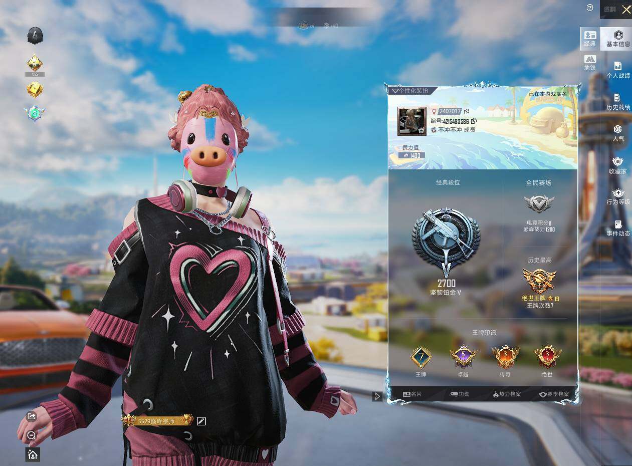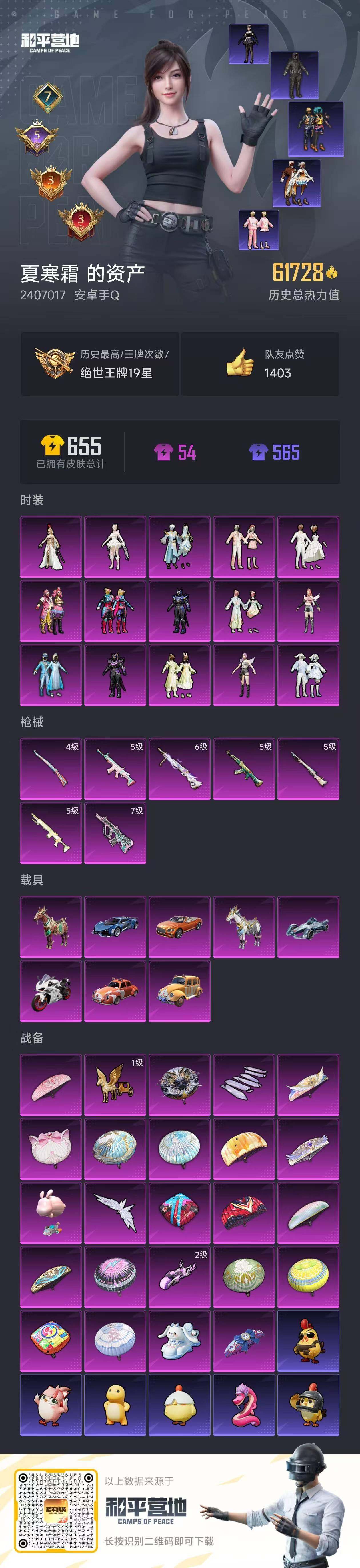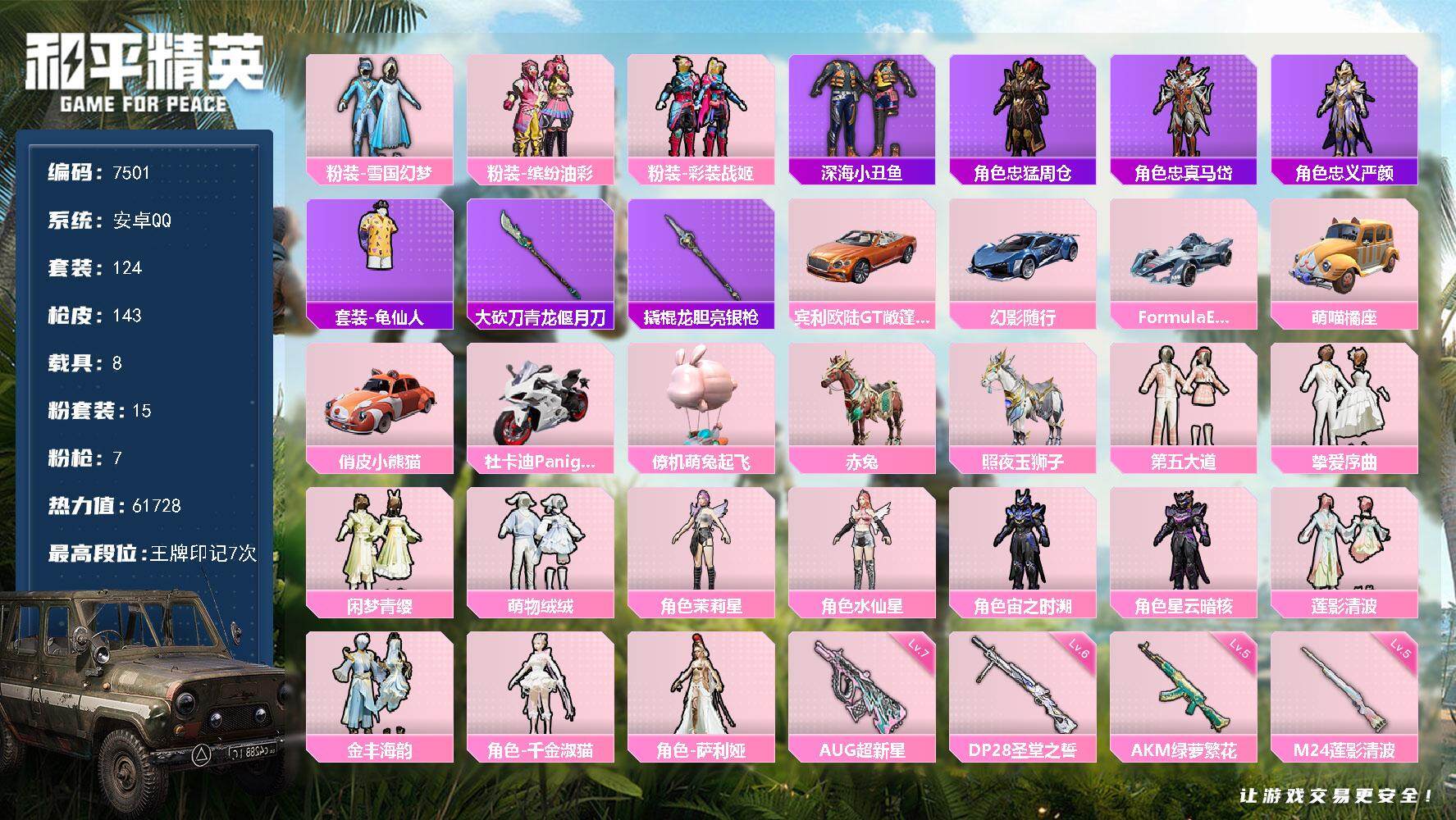 [13868125]安卓 手Q-15粉装-7特效枪-8载具-5粉色飞行器-61728热力值-7王牌印记-124套装-143枪皮