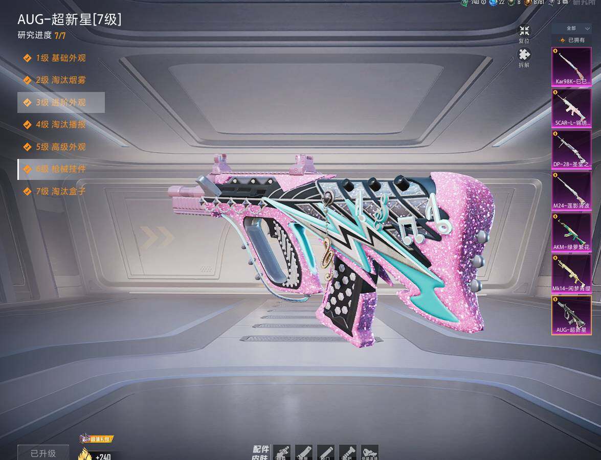 【粉色枪皮等级】:AKM-绿萝繁花(五级),SCAR-L-锦绣绵绵(五级),AUG-超新星(七级),Kar98K-巳巳如意(四级),M24-莲影清波(五级),DP-28-圣堂之誓(六级)