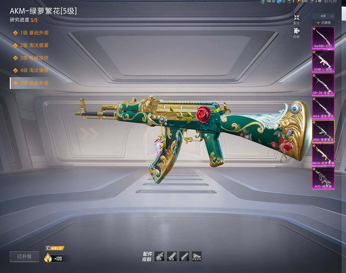 AKM-绿萝繁花,AUG-超新星,Kar98K-巳巳如意,M24-莲影清波,Mk14-闲梦青缨,DP-28-圣堂之誓