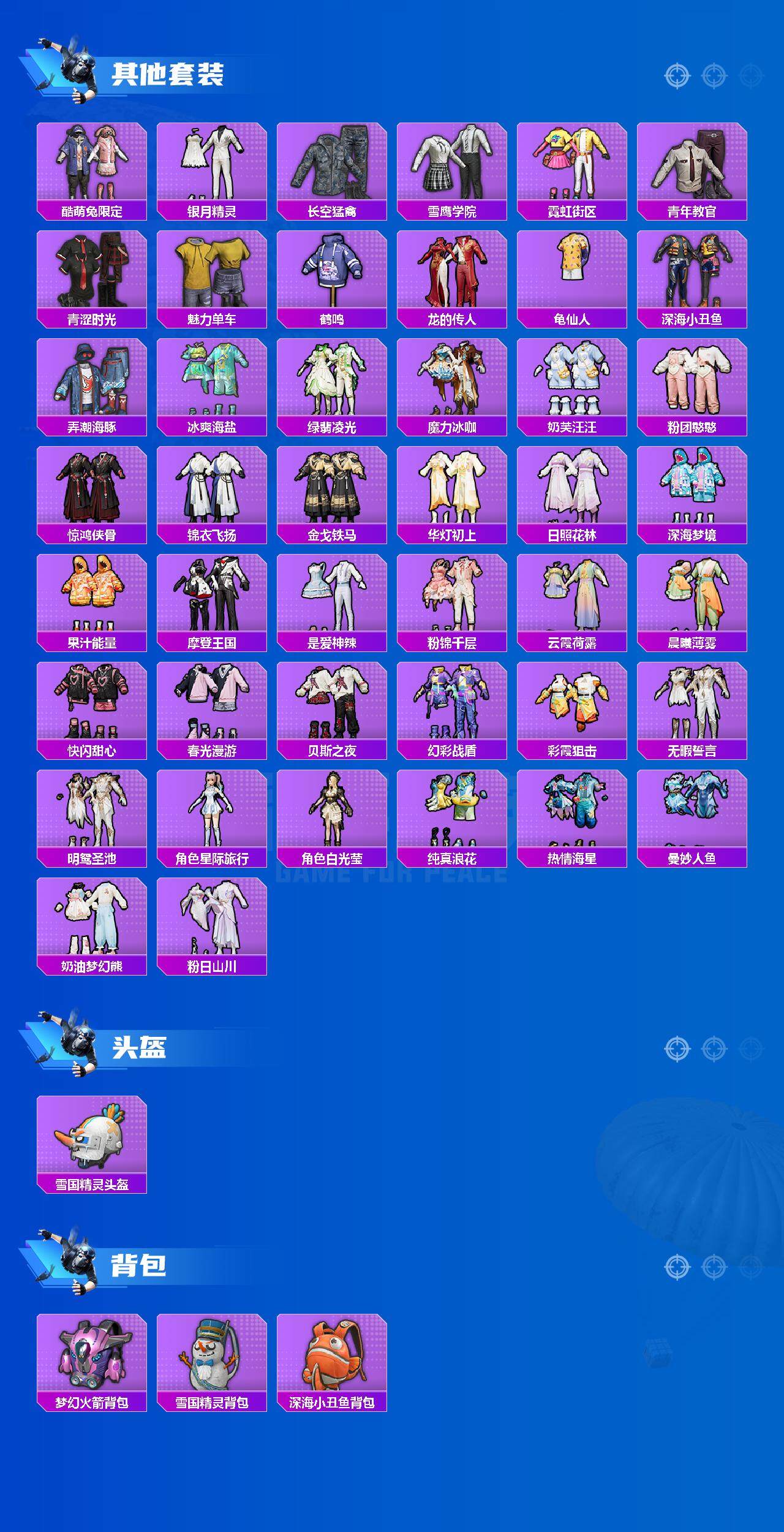 套装-第五大道,角色-茉莉星,套装-萌物绒绒,角色-千金淑猫,套装-缤纷油彩,套装-金丰海韵,套装-莲影清波,套装-挚爱序曲,角色-宙之时溯,套装-雪国幻梦,角色-水仙星,角色-星云暗核,套装-彩装战姬,角色-萨利娅,套装-闲梦青缨