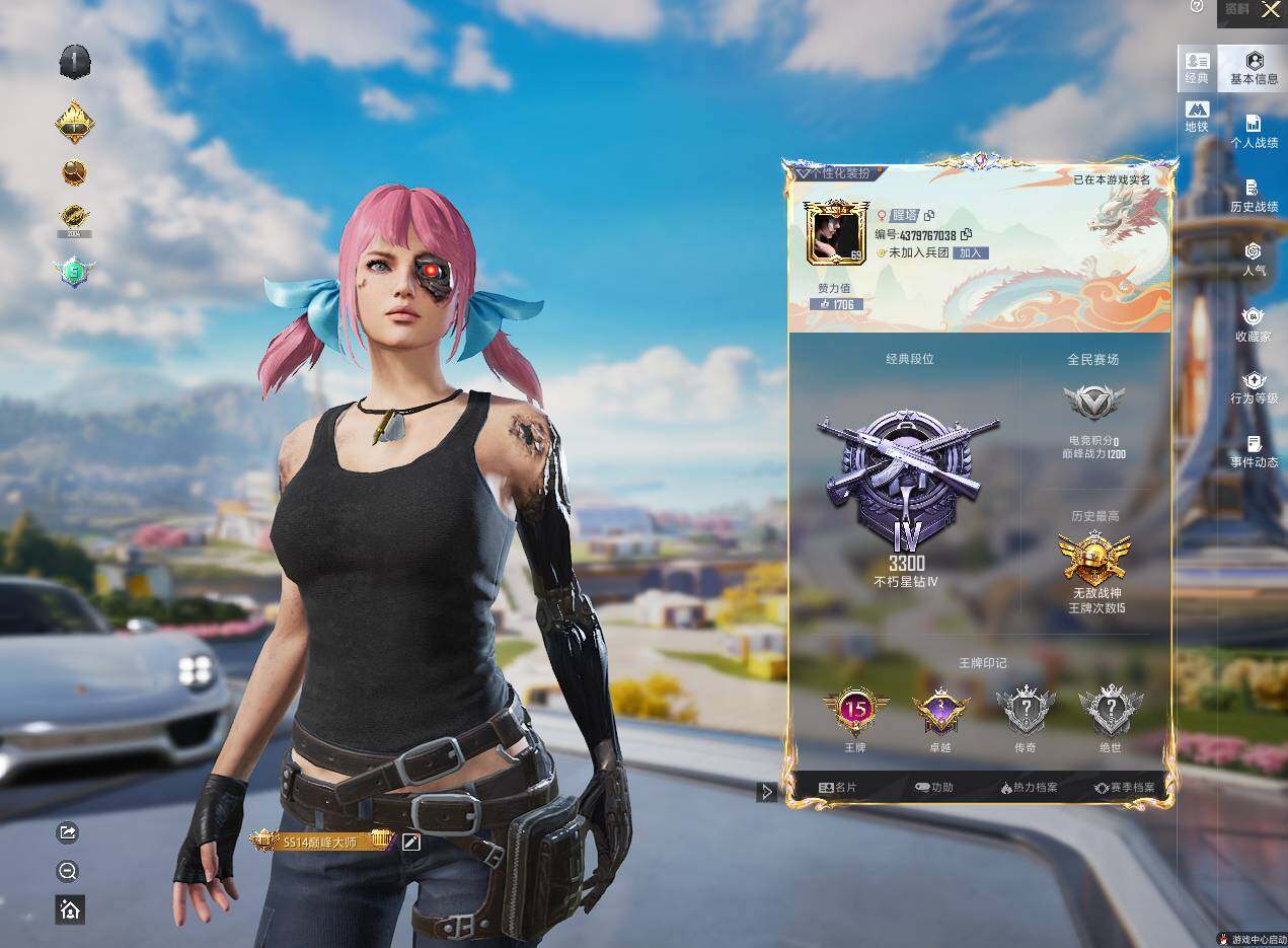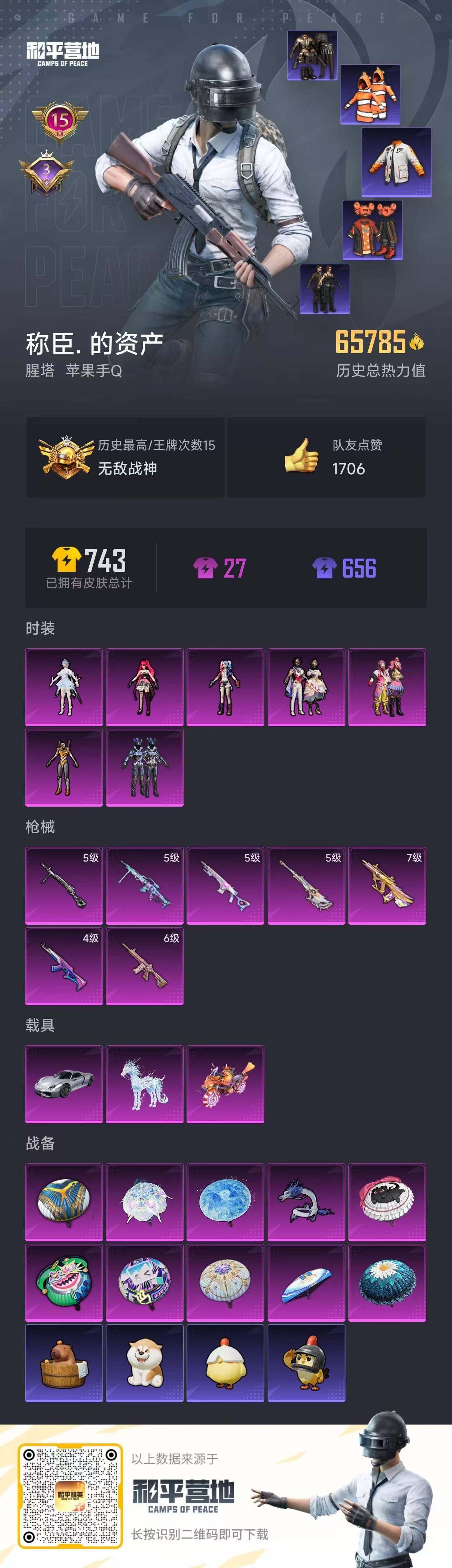 [13868152]苹果 手Q-无敌战神框-7粉装-7特效枪-3载具-1粉色飞行器-65785热力值-15王牌印记-160套装-198枪皮