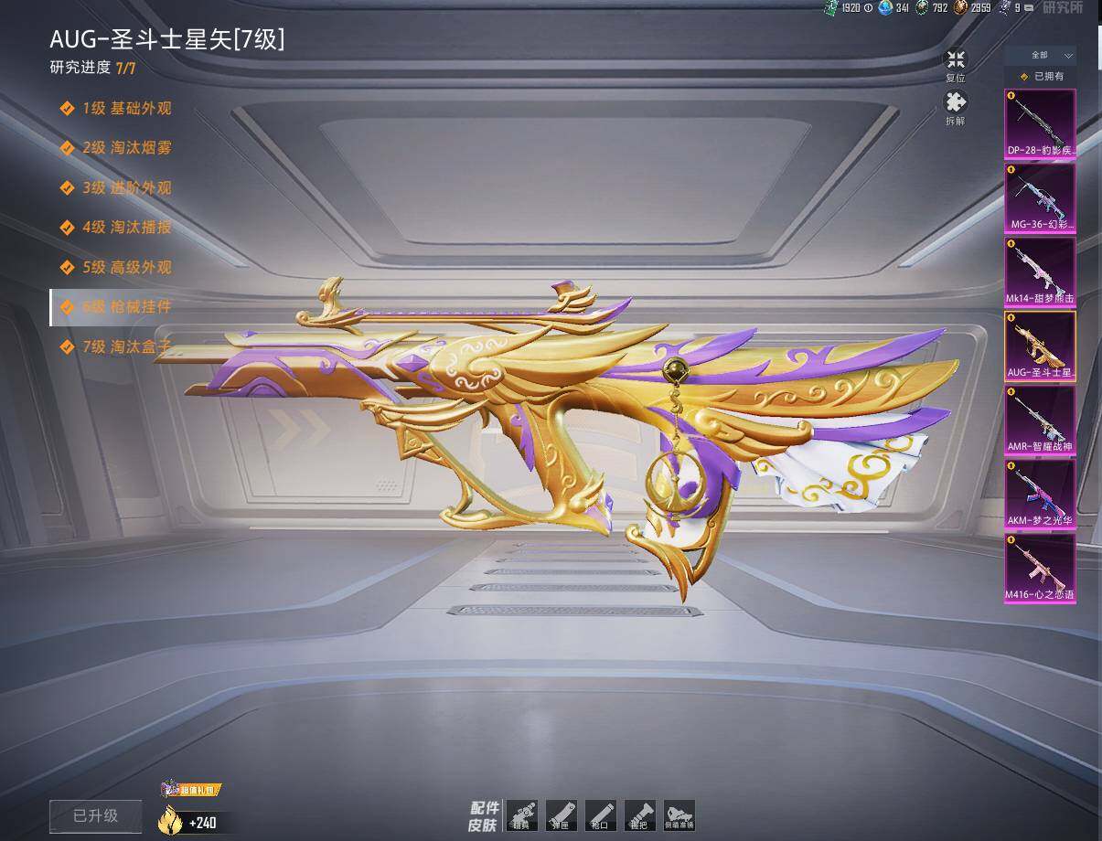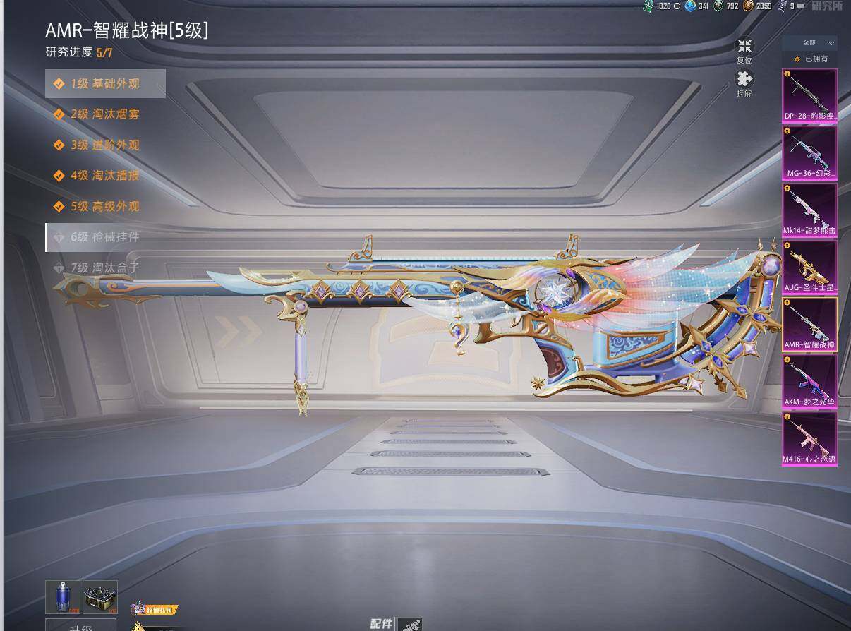 【粉色枪皮等级】:AKM-梦之光华(四级),M416-心之恋语(六级),AUG-圣斗士星矢(七级),Mk14-甜梦熊击(五级),AMR-智耀战神(五级),DP-28-豹影疾电(五级),MG-36-幻彩电音(五级)