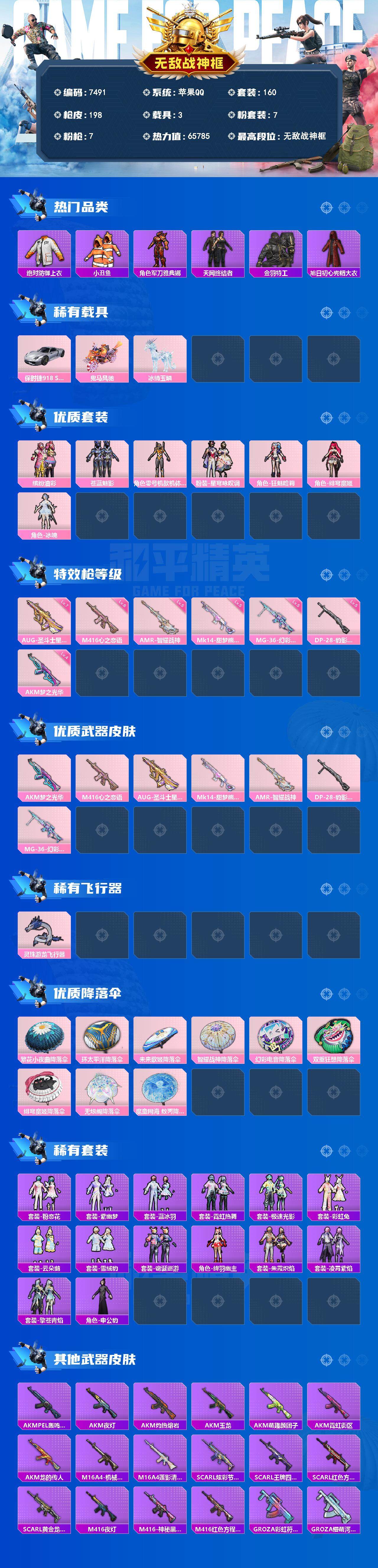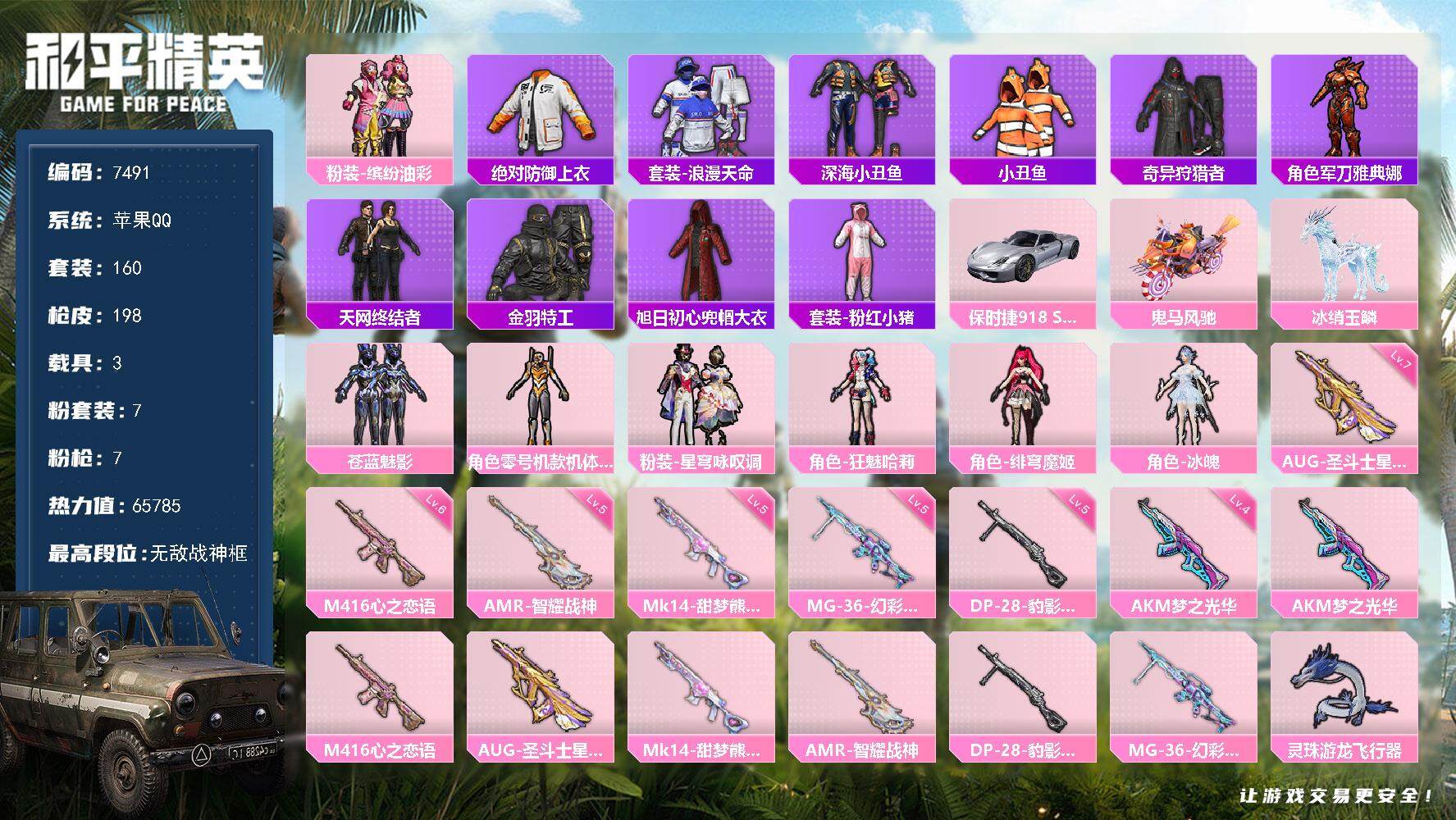 [13868152]苹果 手Q-无敌战神框-7粉装-7特效枪-3载具-1粉色飞行器-65785热力值-15王牌印记-160套装-198枪皮 【热门品类】:粉装-缤纷油彩,绝对防御上衣,套装-浪漫天命,套装-深海小丑鱼,套装-小丑鱼,套装-奇异狩猎者,角色-军刀雅典娜,套装-天网终结者,套装-金羽特工,旭日初心兜帽大衣,套装-粉红小猪 【粉色载具】:保时捷918 Spyder(液态银),鬼马风驰,冰绡玉鳞 【粉色套装】:粉装-缤纷油彩,粉装-苍蓝魅影,角色-零号机款机体服,粉装-星穹咏叹调,角色-狂魅哈莉,角色-绯穹魔姬,角色-冰魄 【粉色枪皮等级】:AKM-梦之光华(四级),M416-心之恋语(六级),AUG-圣斗士星矢(七级),Mk14-甜梦熊击(五级),AMR-智耀战神(五级),DP-28-豹影疾电(五级),MG-36-幻彩电音(五级) 【粉色枪皮】:AKM-梦之光华,M416-心之恋语,AUG-圣斗士星矢,Mk14-甜梦熊击,AMR-智耀战神,DP-28-豹影疾电,MG-36-幻彩电音 【粉色飞行器】:灵珠游龙飞行器 【粉色降落伞】:繁花小夜曲降落伞,环太平洋降落伞,未来歌姬降落伞,智耀战神降落伞,幻彩电音降落伞,双重狂想降落伞,绯穹魔姬降落伞,无垠阁降落伞,魔童闹海 敖丙降落伞 【稀有套装】:套装-粉恋花,套装-紫幽梦,套装-蓝冰羽,套装-霓虹热舞,套装-极速光影,套装-彩虹兔,套装-云朵鹅,套装-雪绒豹,套装-诡诞巡游,角色-绛羽幽主,套装-朱霞炽焰,套装-凌霄紫焰,套装-擎苍青焰,角色-申公豹 【稀有枪皮】:AKM-PEL轰鸣竞梦者,AKM-夜灯,AKM-灼热熔岩,AKM-玉龙,AKM-萌趣颜团子,AKM-霓虹街区,AKM-龙的传人,M16A4-机械英豪,M16A4-莲影清波,SCAR-L-炫彩节奏,SCAR-L-王牌四分卫,SCAR-L-红色方程式,SCAR-L-黄金龙骨,M416-夜灯,M416-神秘黑猫,M416-红色方程式,GROZA-彩虹符号,GROZA-懵萌河马,GROZA-治愈之星,GROZA-黑色刀锋,AUG-炫光贝贝,AUG-终结者,AUG-青春冒险家,QBZ-原初圣火,QBZ-彩虹符号,QBZ-未来歌姬,M762-奇异狩猎者,M762-牛气冲天,M762-绯红前夜,M762-镭射皇者,M762-云朵鹅,Mk47-百万伏特,Mk47-青春冒险家,G36C