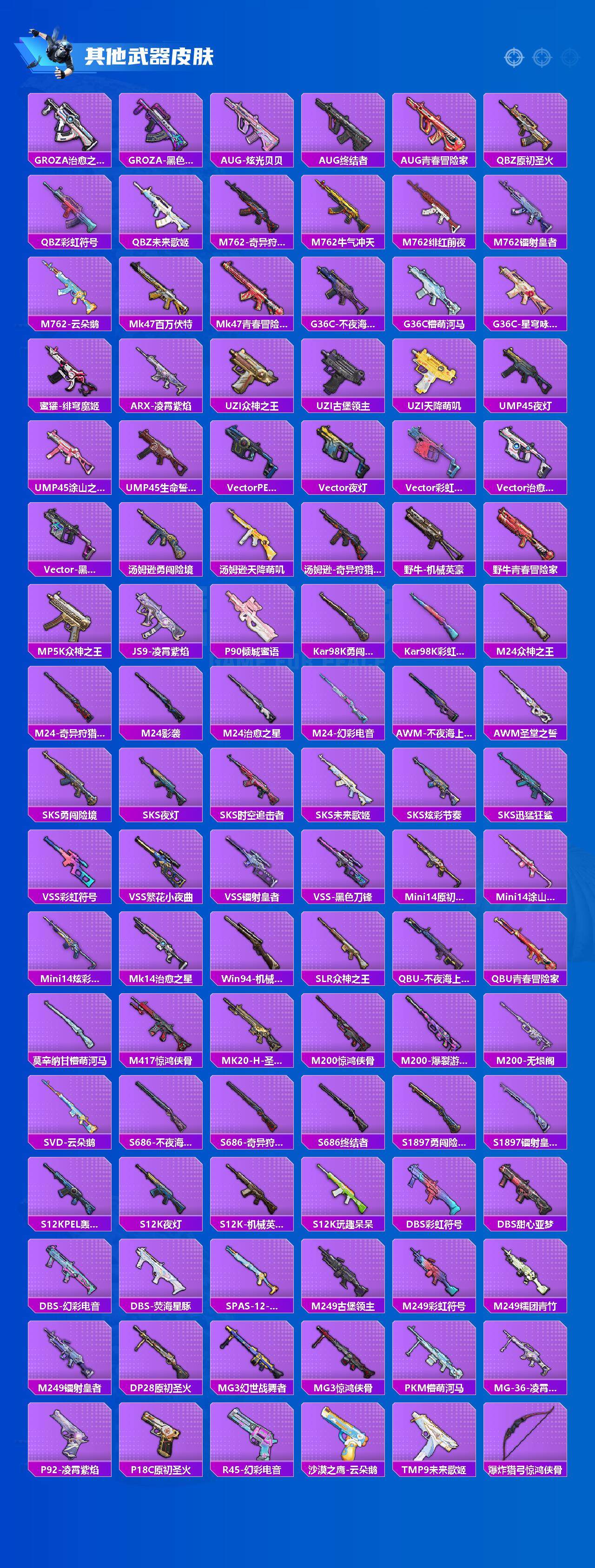 【稀有枪皮】:AKM-PEL轰鸣竞梦者,AKM-夜灯,AKM-灼热熔岩,AKM-玉龙,AKM-萌趣颜团子,AKM-霓虹街区,AKM-龙的传人,M16A4-机械英豪,M16A4-莲影清波,SCAR-L-炫彩节奏,SCAR-L-王牌四分卫,SCAR-L-红色方程式,SCAR-L-黄金龙骨,M416-夜灯,M416-神秘黑猫,M416-红色方程式,GROZA-彩虹符号,GROZA-懵萌河马,GROZA-治愈之星,GROZA-黑色刀锋,AUG-炫光贝贝,AUG-终结者,AUG-青春冒险家,QBZ-原初圣火,QBZ-彩虹符号,QBZ-未来歌姬,M762-奇异狩猎者,M762-牛气冲天,M762-绯红前夜,M762-镭射皇者,M762-云朵鹅,Mk47-百万伏特,Mk47-青春冒险家,G36C