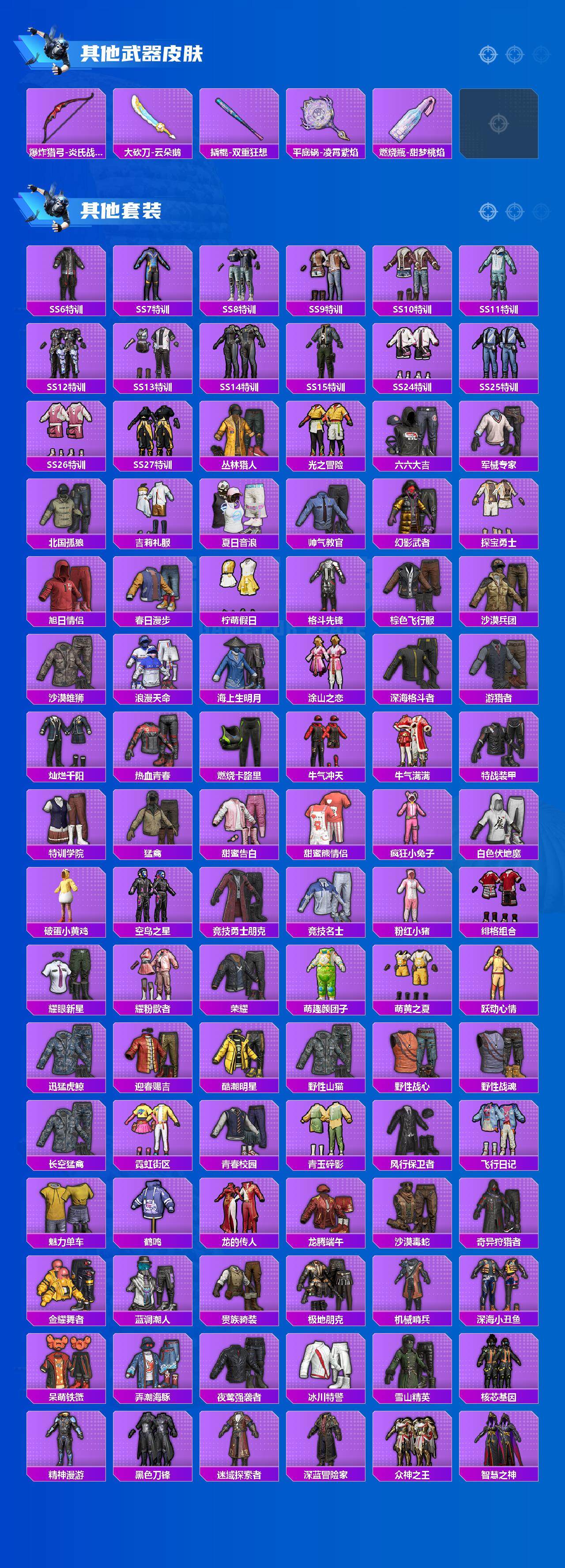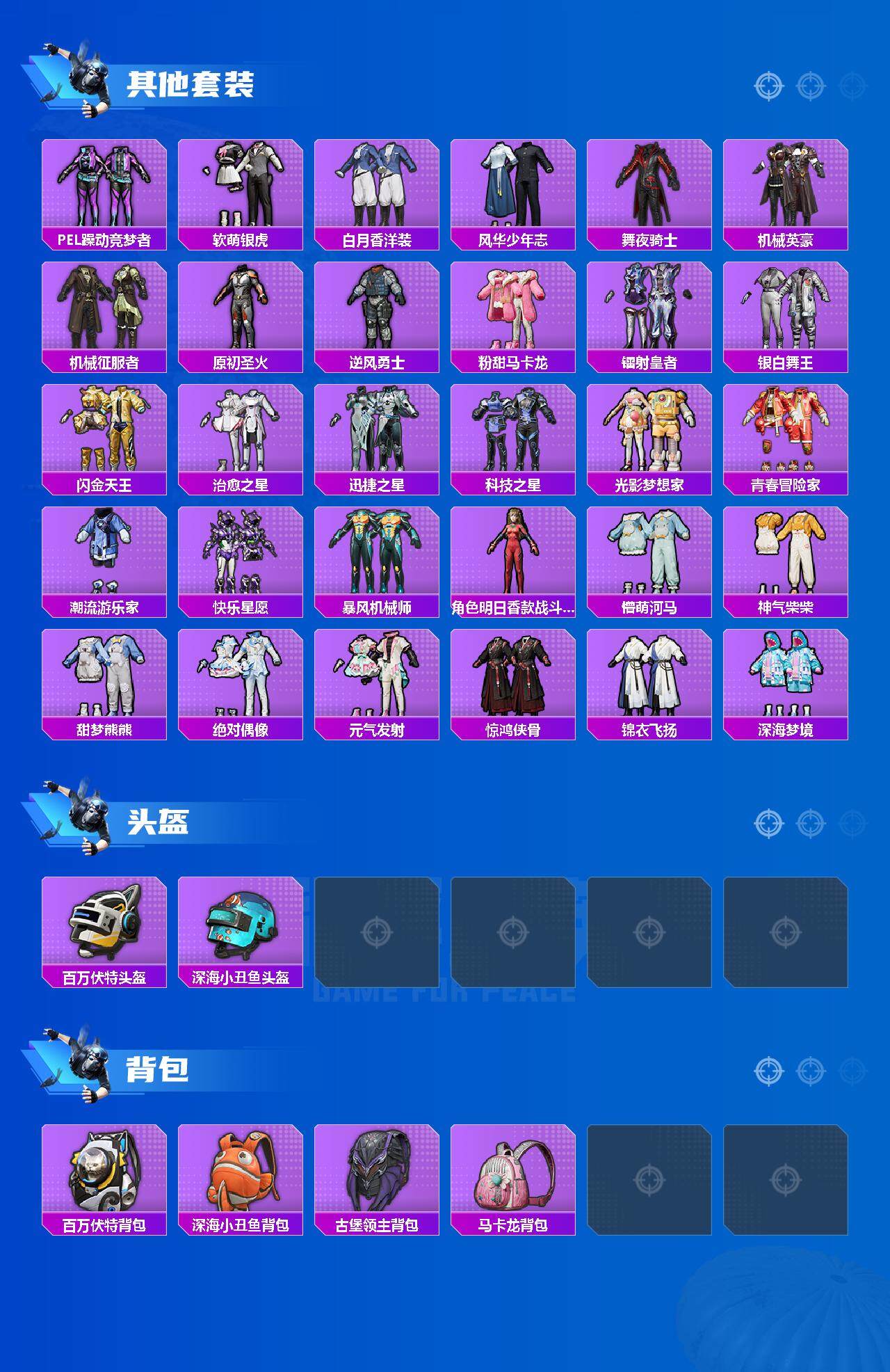 套装-浪漫天命,角色-军刀雅典娜,套装-金羽特工,套装-粉红小猪,套装-破蛋小黄鸡,套装-弄潮海豚,套装-雪山精英,套装-黑色刀锋,白月香洋装套装,风华少年志套装,套装-机械英豪,粉甜马卡龙套装