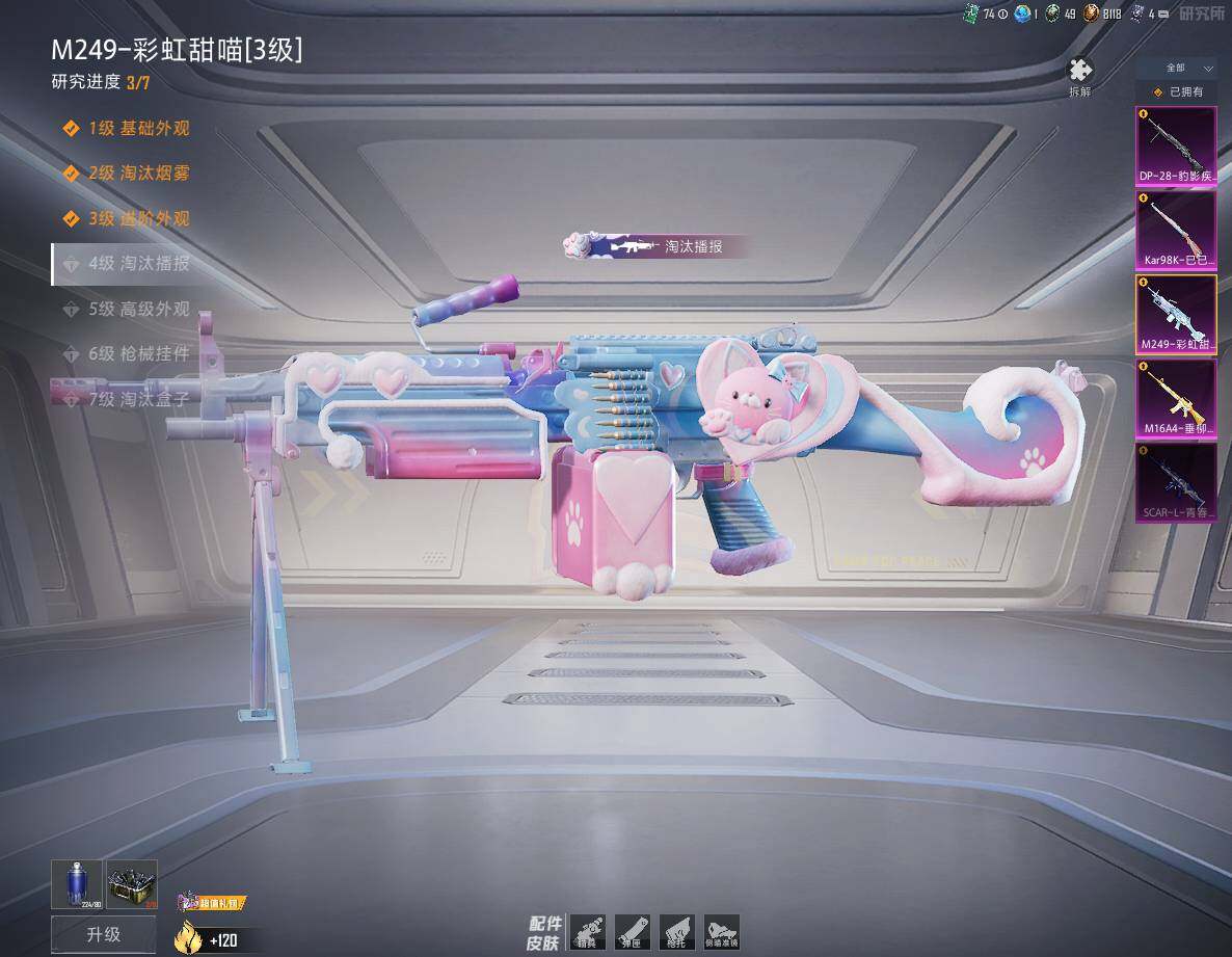 【粉色枪皮等级】:M16A4-垂柳戏鸭(二级),SCAR-L-青春物语(五级),Kar98K-巳巳如意(五级),M249-彩虹甜喵(三级),DP-28-豹影疾电(一级)