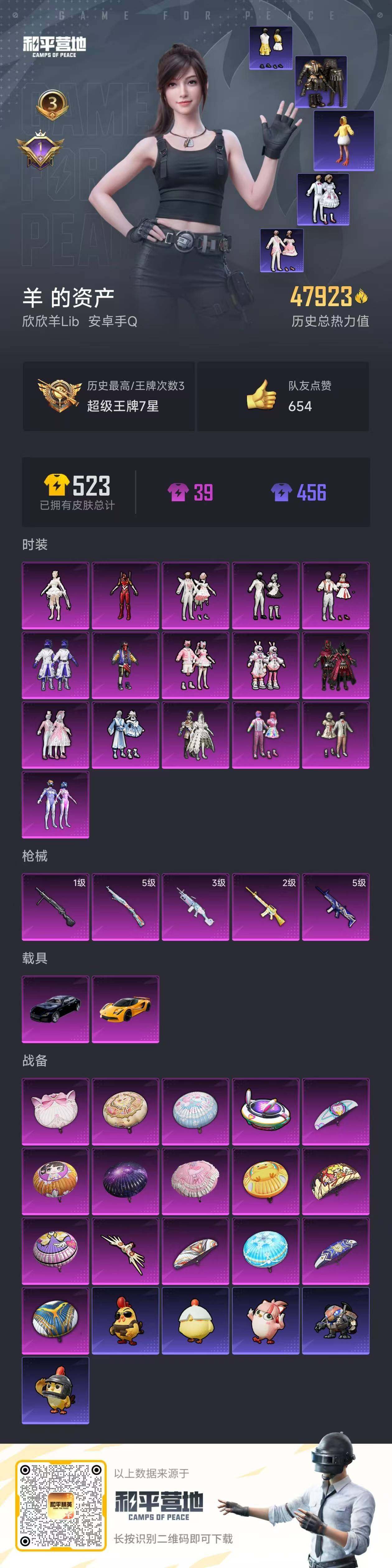 - PX_2062138- 安卓手Q-2王牌印记-3粉装-3特效枪-0载具-22856热力值-71套装-76枪皮-1卓越印记-0传奇印记 【3粉装】,新星烈龙,闲梦青缨,冰霜白皇 【3特效枪】AKM-绿萝繁花-5级 SCAR-L-锦绣绵绵-5级 Kar98K-巳巳如意-5级 【4稀有紫装】,暗影哥特,浪漫天命,雪山精英,龟仙人, 【71稀有时装】,SS31特训,SS33特训,SS32特训,恋语绒绒,