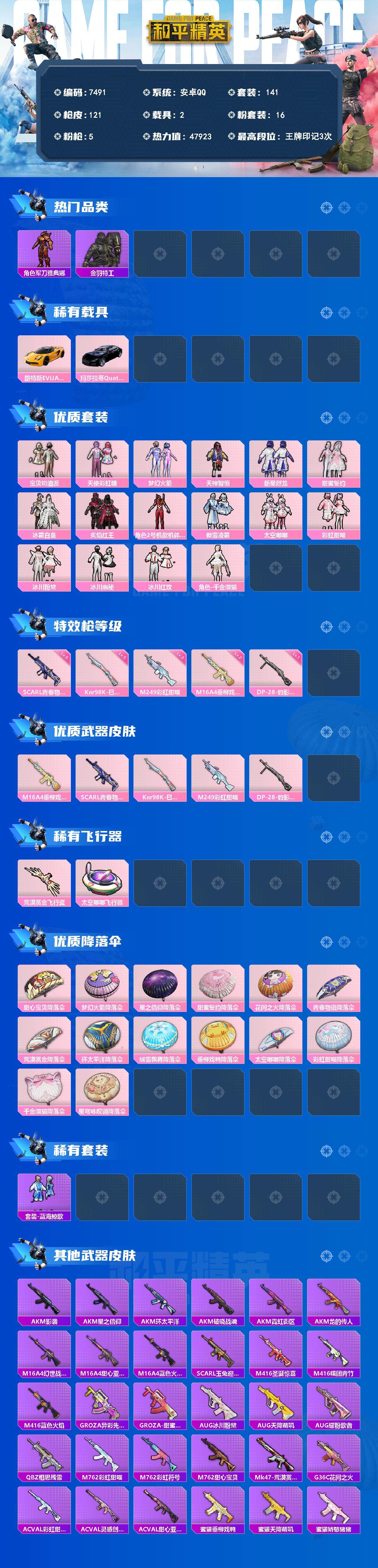 [13868146]安卓 手Q-16粉装-5特效枪-2载具-2粉色飞行器-47923热力值-3王牌印记-141套装-121枪皮 【热门品类】:粉装-梦幻火箭,套装-奇异狩猎者,角色-军刀雅典娜,套装-金羽特工,套装-龟仙人,套装-暗影哥特 【粉色载具】:路特斯EVIJA(星际黄),玛莎拉蒂Quattroporte(夜幕蓝) 【粉色套装】:粉装-宝贝奶油派,粉装-天使彩虹糖,粉装-梦幻火箭,粉装-天禅智恒,粉装-新星烈龙,粉装-甜蜜誓约,粉装-冰霜白皇,粉装-炙焰红王,角色-2号机款机体服,粉装-傲雪凌霜,粉装-太空嘟嘟,粉装-彩虹甜喵,粉装-冰川粉黛,粉装-冰川幽秘,粉装-冰川红玫,角色-千金淑猫 【粉色枪皮等级】:M16A4-垂柳戏鸭(二级),SCAR-L-青春物语(五级),Kar98K-巳巳如意(五级),M249-彩虹甜喵(三级),DP-28-豹影疾电(一级) 【粉色枪皮】:M16A4-垂柳戏鸭,SCAR-L-青春物语,Kar98K-巳巳如意,M249-彩虹甜喵,DP-28-豹影疾电 【粉色飞行器】:荒漠赏金飞行翼,太空嘟嘟飞行器 【粉色降落伞】:甜心宝贝降落伞,梦幻火箭降落伞,星之信仰降落伞,甜蜜誓约降落伞,花间之火降落伞,青春物语降落伞,荒漠赏金降落伞,环太平洋降落伞,绒雪飘舞降落伞,垂柳戏鸭降落伞,太空嘟嘟降落伞,彩虹甜喵降落伞,千金淑猫降落伞,星穹咏叹调降落伞 【稀有套装】:套装-龟仙人,套装-蓝海鲸歌 【稀有枪皮】:AKM-影袭,AKM-星之信仰,AKM-环太平洋,AKM-破晓战魂,AKM-霓虹街区,AKM-龙的传人,M16A4-幻世战舞者,M16A4-甜心亚梦,M16A4-蓝色火焰,SCAR-L-玉兔迎春,M416-圣诞惊喜,M416-糯团青竹,M416-蓝色火焰,GROZA-异彩先驱,GROZA-甜蜜草莓,AUG-冰川粉黛,AUG-天降萌叽,AUG-耀粉歌者,QBZ-相思残雪,M762-彩虹甜喵,M762-彩虹符号,M762-甜心宝贝,Mk47-荒漠赏金,G36C-花间之火,AC-VAL-彩虹甜喵,AC-VAL-灵感创作师,AC-VAL-甜心亚梦,蜜獾-垂柳戏鸭,蜜獾-天降萌叽,蜜獾-娇憨猪猪,UZI-娇憨猪猪,UZI-红色方程式,UMP45-夜灯,UMP45-生命誓言,UMP45-诡娃娃,汤姆逊-天降萌叽,汤姆逊-炫彩节奏,汤姆逊-环太平洋,汤姆逊-耀粉歌者,汤姆